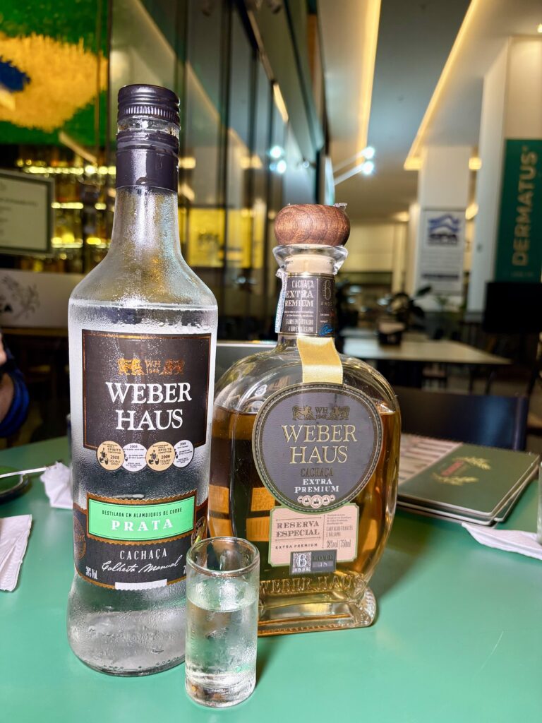 Dado que en este bar “cuarentón” nos reunimos con el Gerente Comercial de Weber Haus, Joel Andrade (ex Sagatiba), Hélcio nos hizo degustar la Weber Haus Prata (plata o blanca), y la Extra Premium Reserva Especial. Ambas en carta, de 38% alc., la primera con 9 meses en tanques de acero inoxidable, y la otra envejecida 5 años en barricas de roble francés y 1 año en bálsamo, producidas en el Estado de Rio Grande do Sul, a las afueras de Porto Alegre.