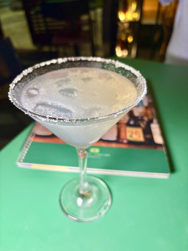 De las “Creaciones del bar”, nos hicieron probar la “MARGARIDA”, obvia reversión del clásico mexicano, pero con cachaça en vez de tequila. En copa Martini coronada con sal, y dentro hielo picado.