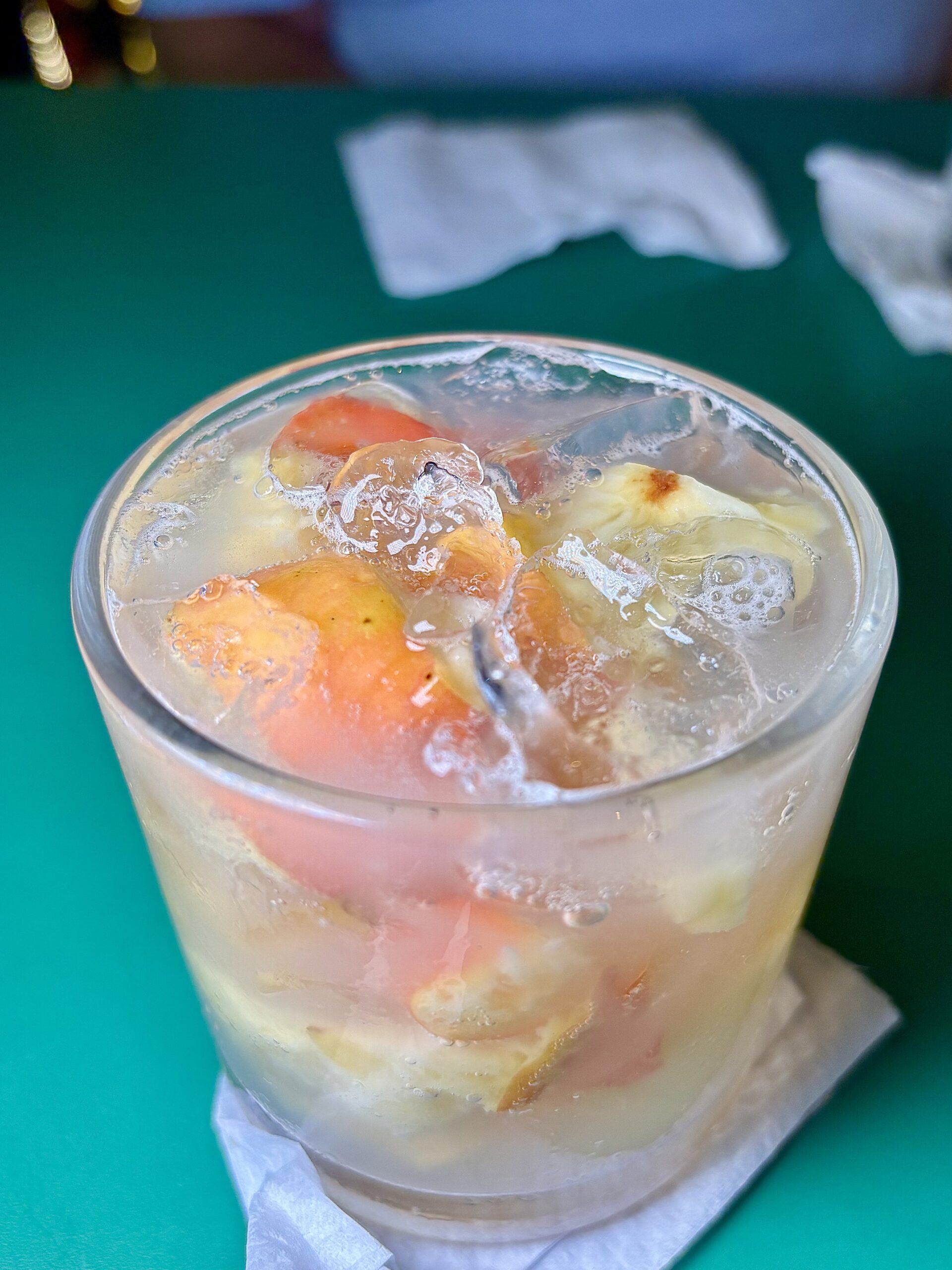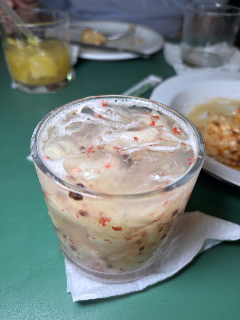 Hélcio sumó: “Hace rato que la gente empezó a salir de la clásica Caipirinha de limón, aunque igual es la más vendida aquí. Fueron hacia frutas diversas como ciruela o castaña de cajú, por ej.”. Esa la probamos, servida sin azúcar nos pareció muy amarga, astringente, muy intensa, poco equilibrada. Por eso ofrecen ponerle azúcar de sobre como al café.
