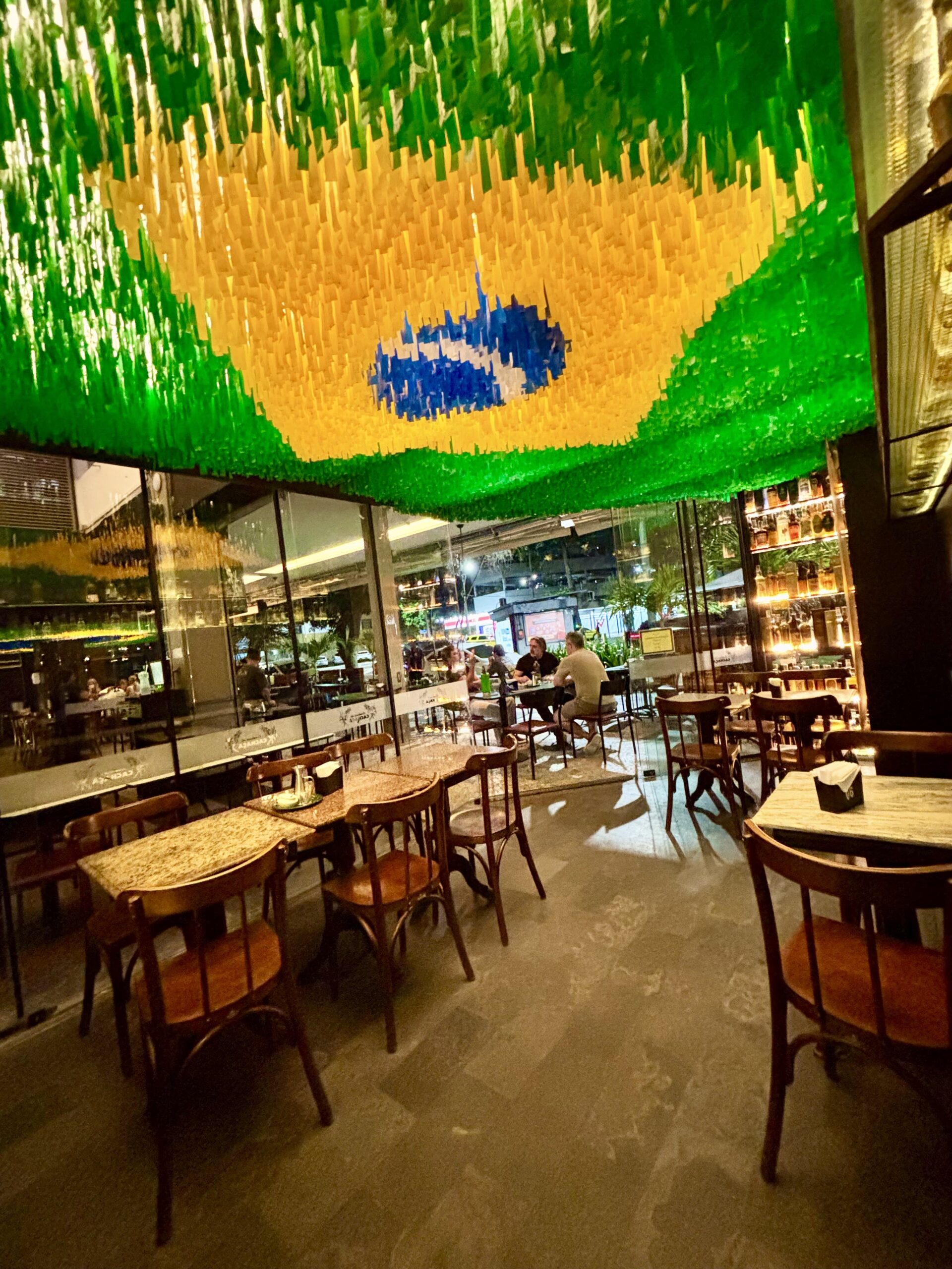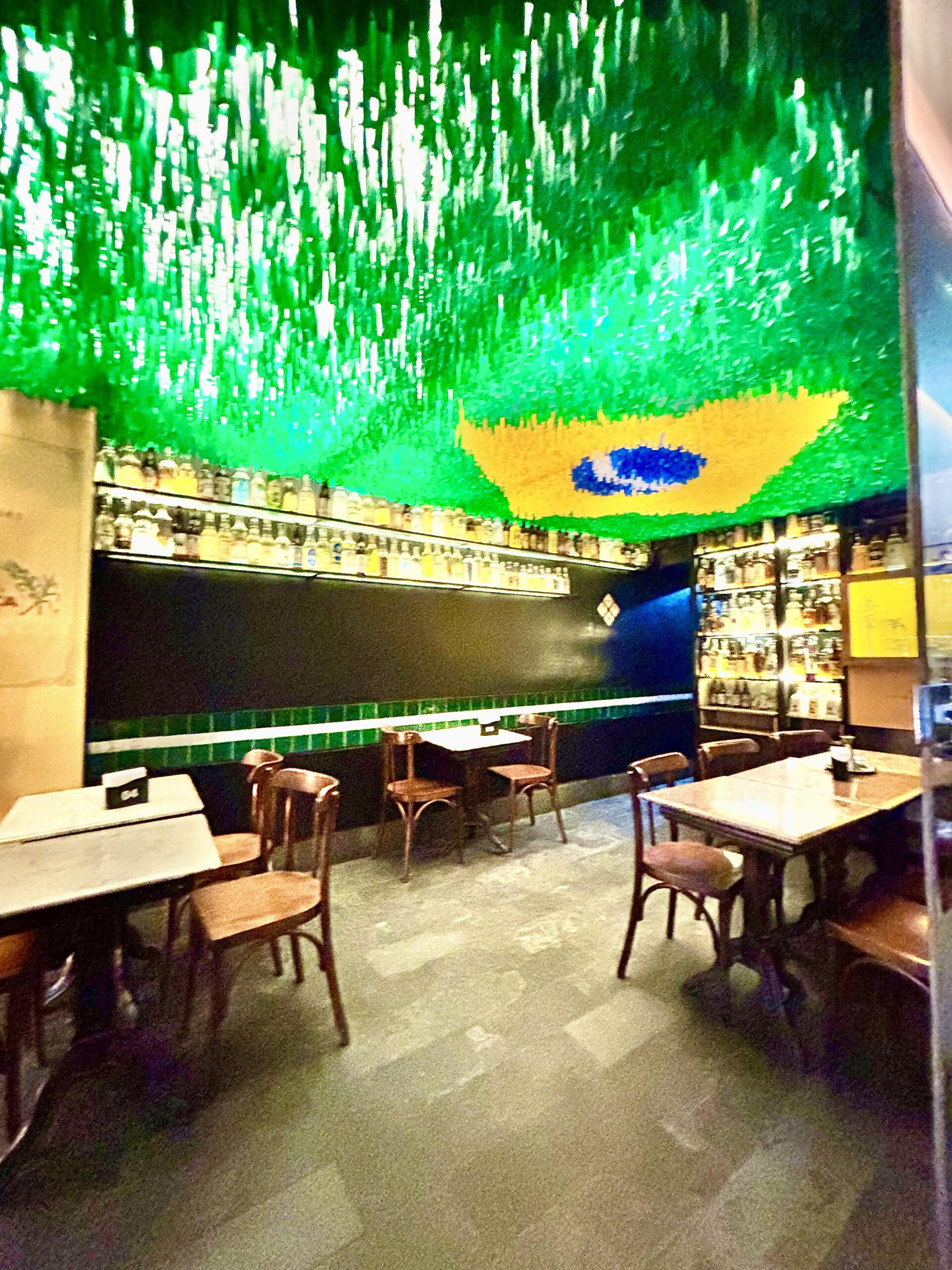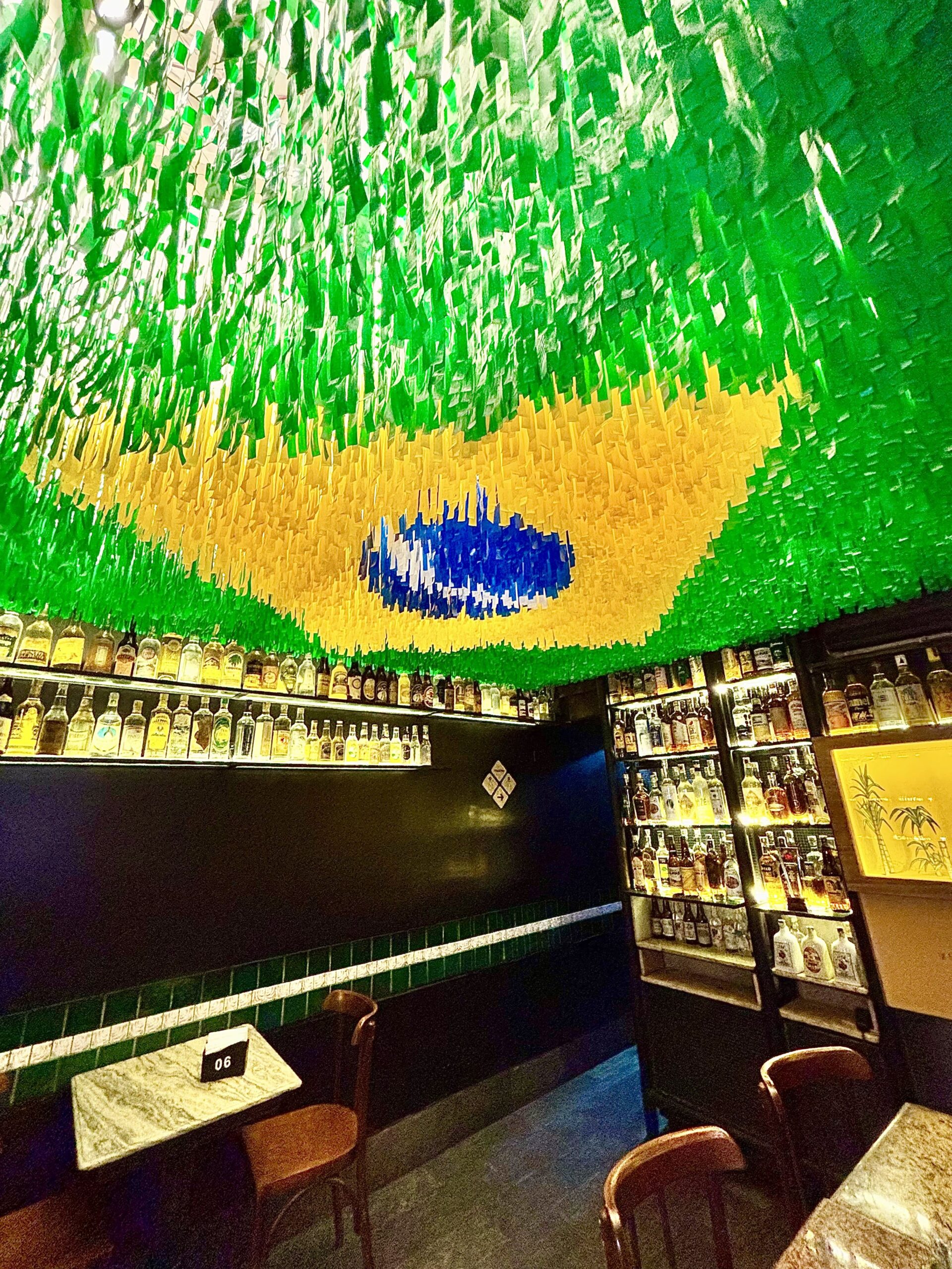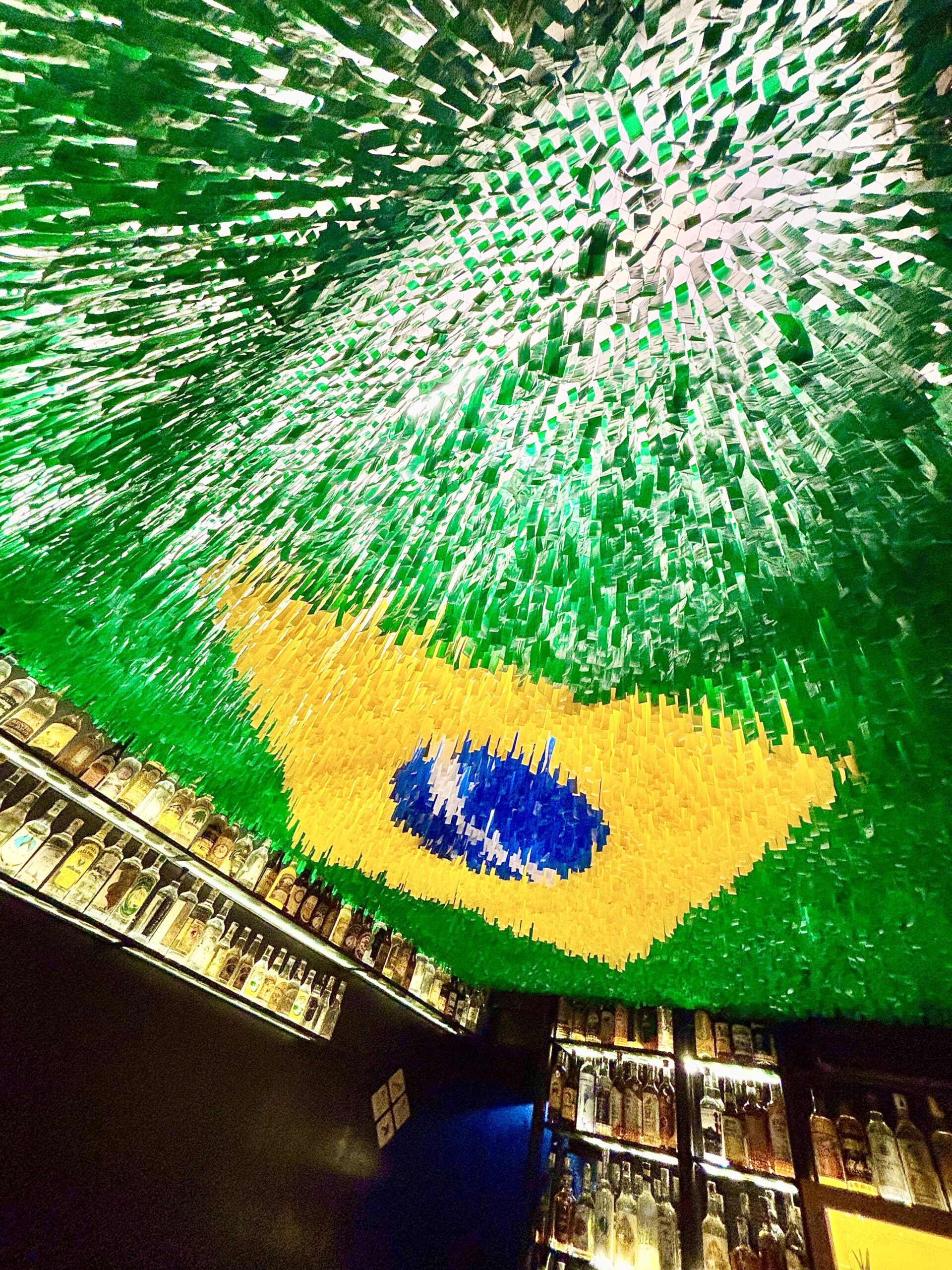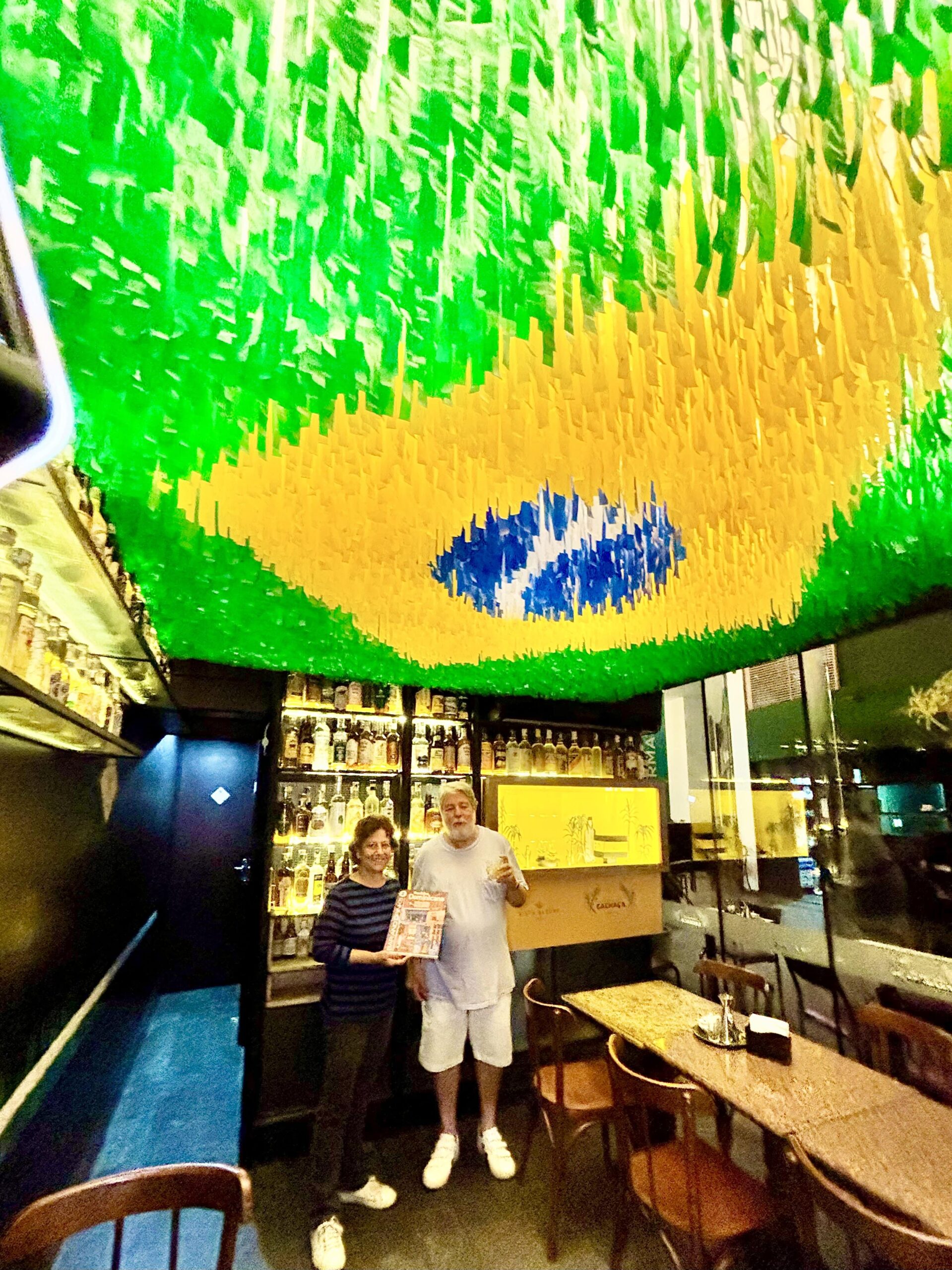 El localcito original mantuvo el toque distintivo, quizás único, que le da la bandera brasilera formada en el techo con papelitos de colores. Allí resguardan la mayoría de unas 1300 botellas de Cachaça.