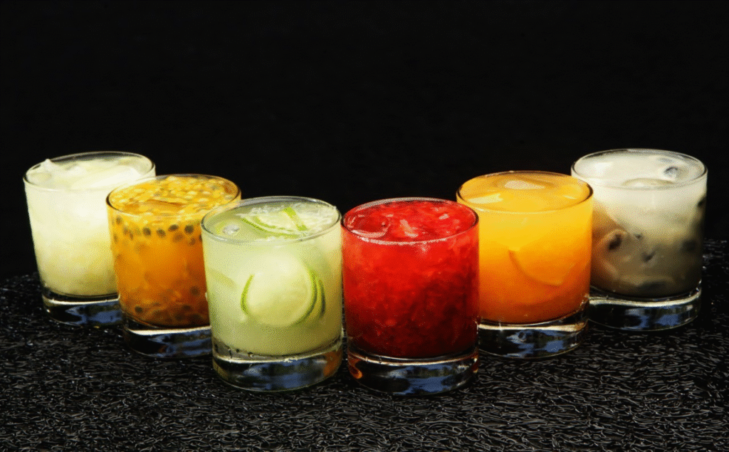 En la 1ra, las ofrecen por fruta (limón, piña, lima, maracuyá, chirimoya) y por bebida (cachaça de corte, vodka brasilero, vodka importado). La más barata es la clásica con limón (4,20 u$s) y la más cara: de maracuyá o chirimoya con vodka importado (7,40 u$s).