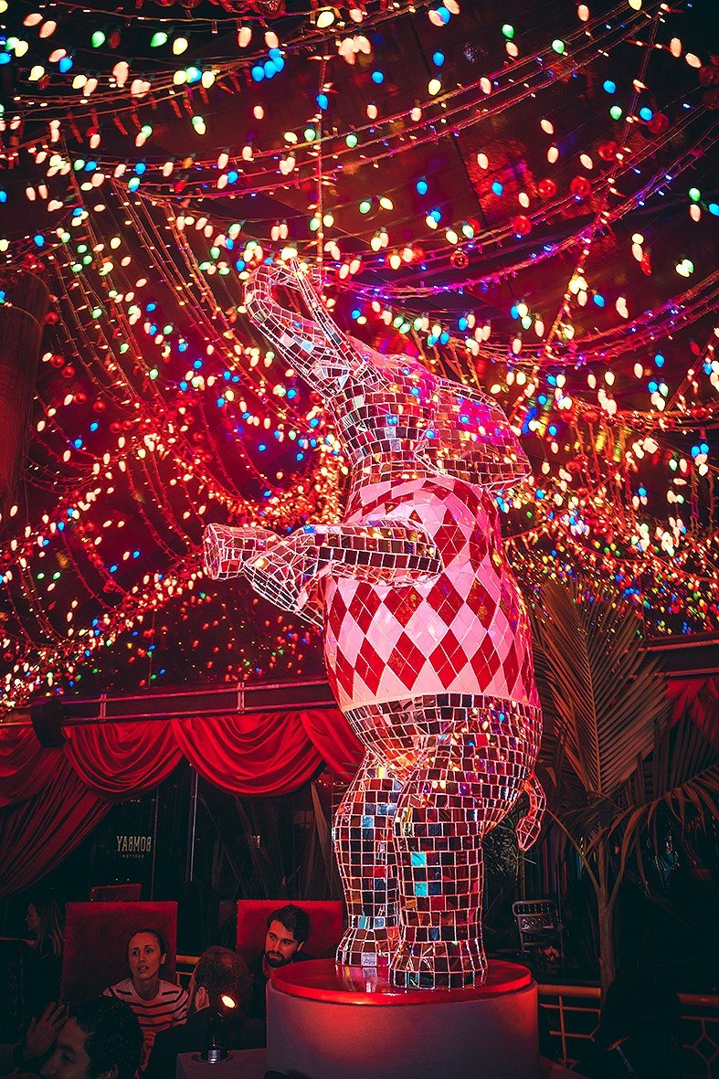 Abierto en junio de 2022, este sitio de tendencia se compone de un salón más una sala arriba, como terraza semicubierta con hermosas vistas de la ciudad. Bombay está ambientado como un mercado hindú, con muchas telas colgando con rojos vibrantes, paredes y muebles al tono. Hay lucecitas de todos colores que confluyen en el centro, donde se erige un icónico elefante parado en dos patas, en medio de una decoración que refleja el rico tapiz de la cultura india.