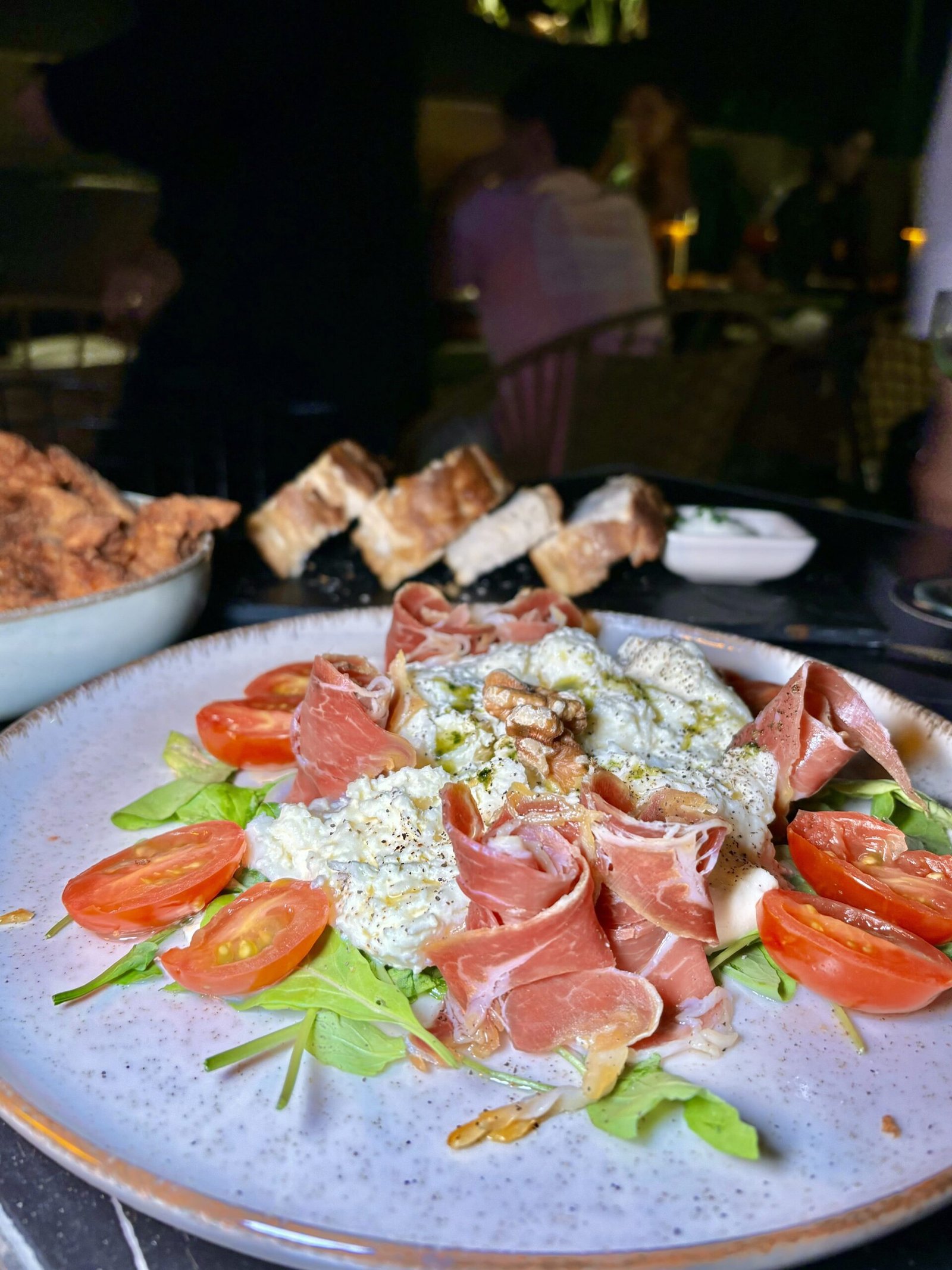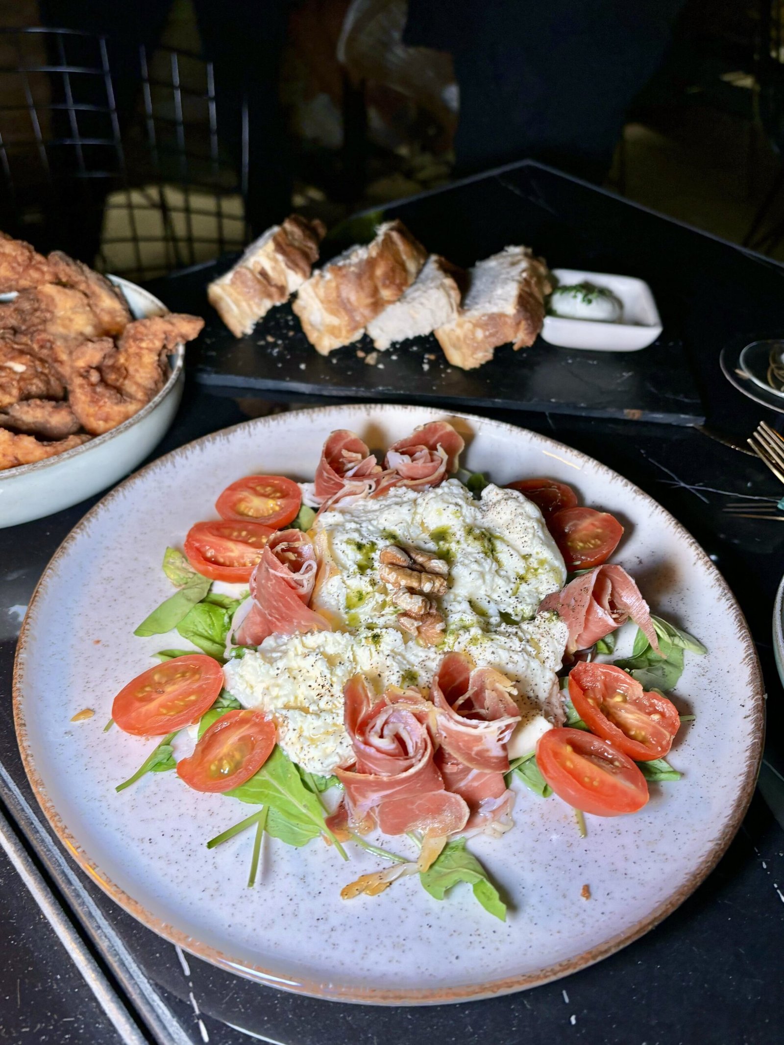 BURRATA, con jamón crudo, rúcula, tomates cherry, pesto de albahaca, aceite de oliva y pimienta negra. ($arg.14200).