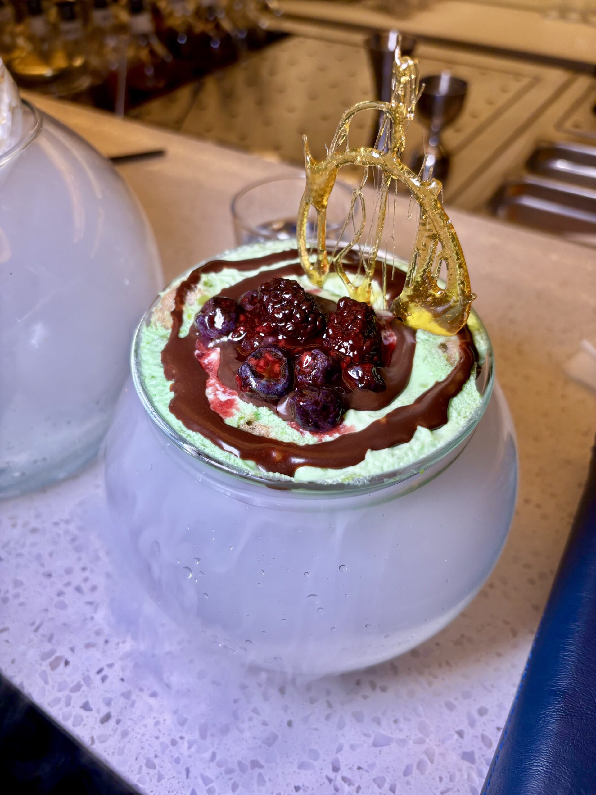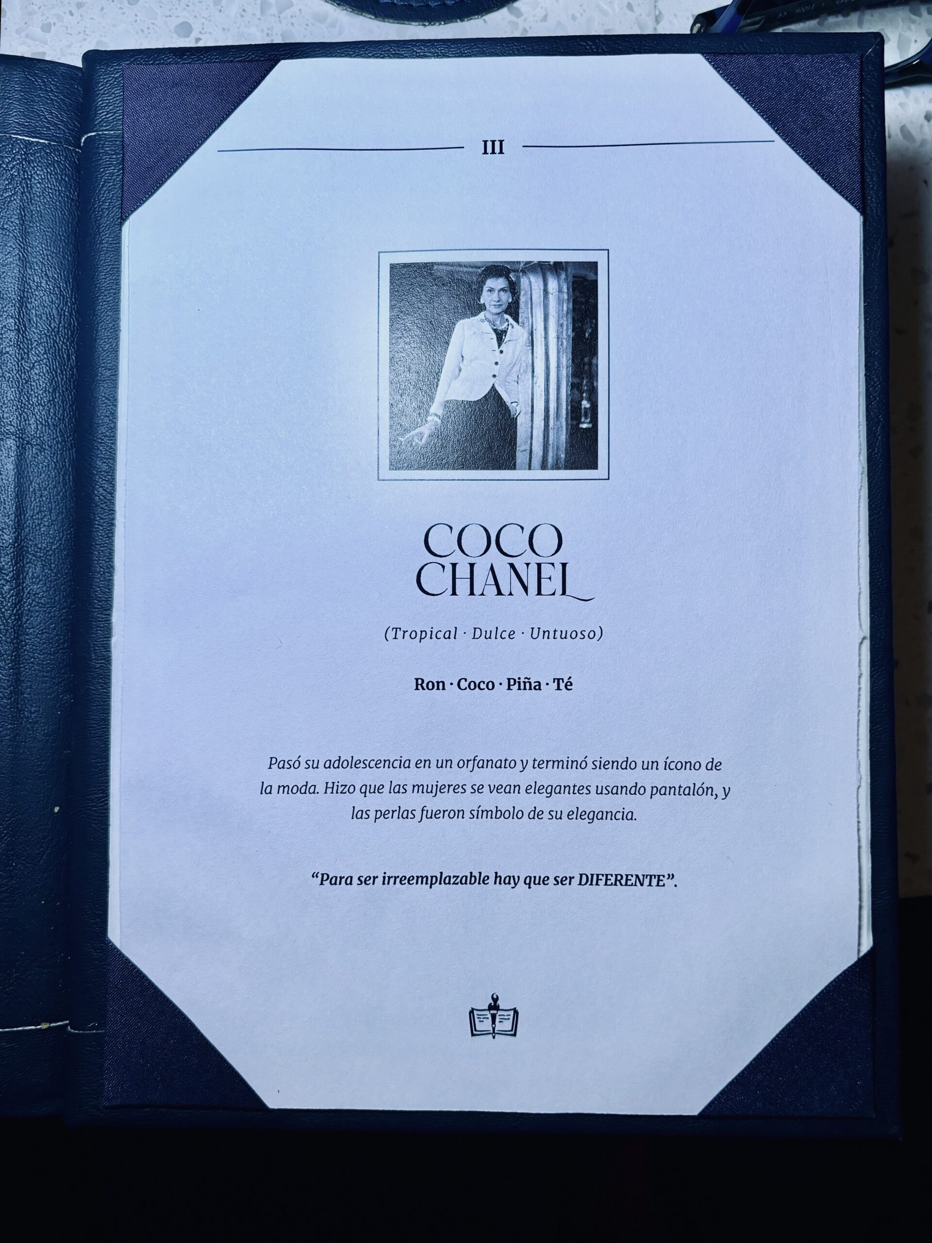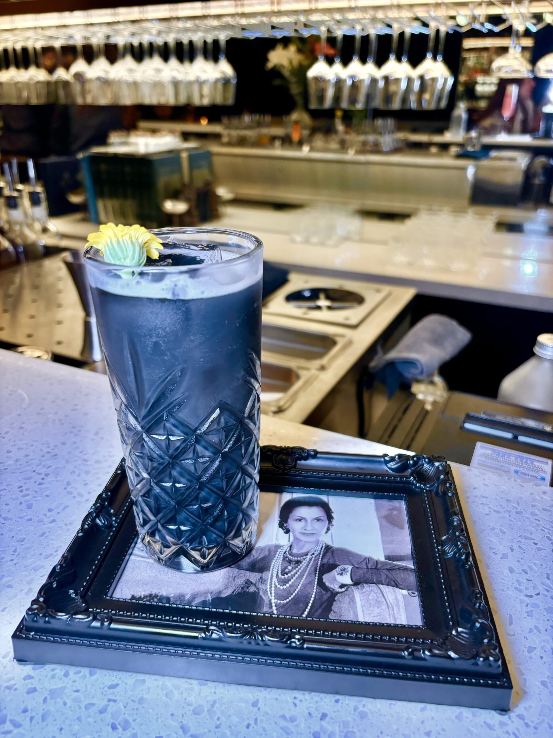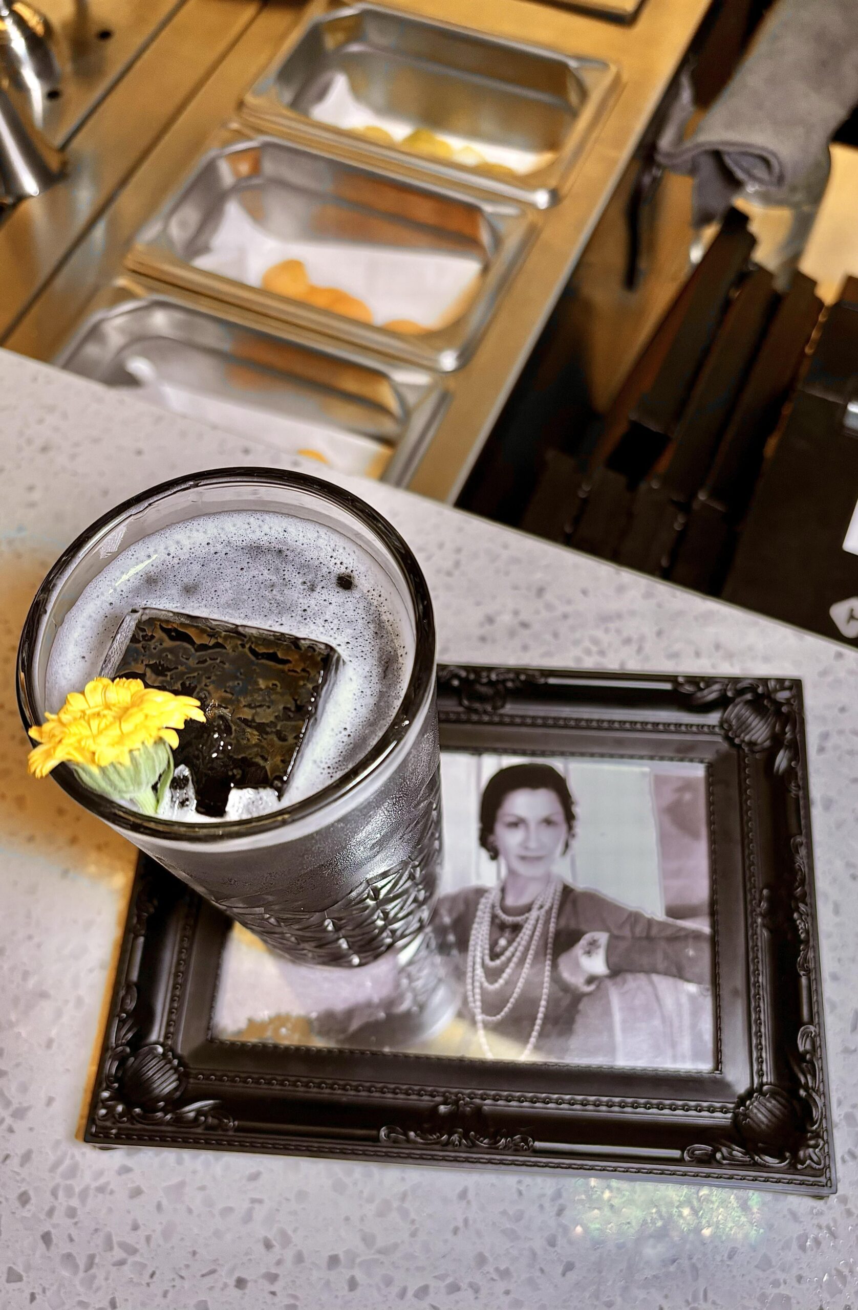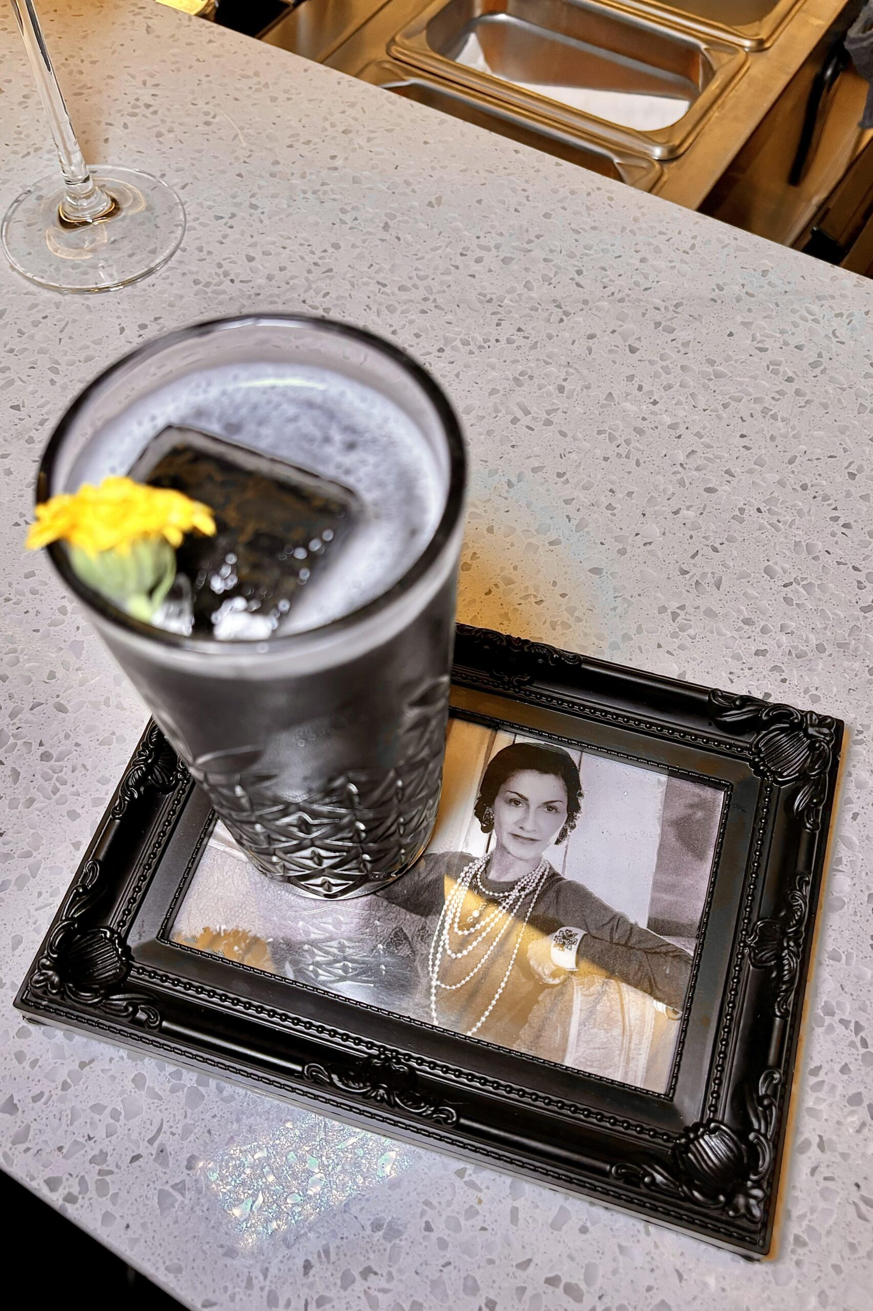 No hay tragos demasiado cargados de alcohol, ni con bebidas muy añejadas, pero sí usando técnicas y recursos interesantes como la carbonización de pieles cítricos y canela, para lograr un polvo negro usado en el COCO CHANEL y así ostentar el color oscuro y perfiles abiertos de sabores. Servido en trago largo sobre un portarretrato de la influyente diseñadora de moda francesa (1883-1971), conocida por revolucionar la moda femenina en el siglo XX, liberando a las mujeres de las restricciones de la moda victoriana. “Les sacó el corset y les puso pantalones”, aludió Caro Fortuna.