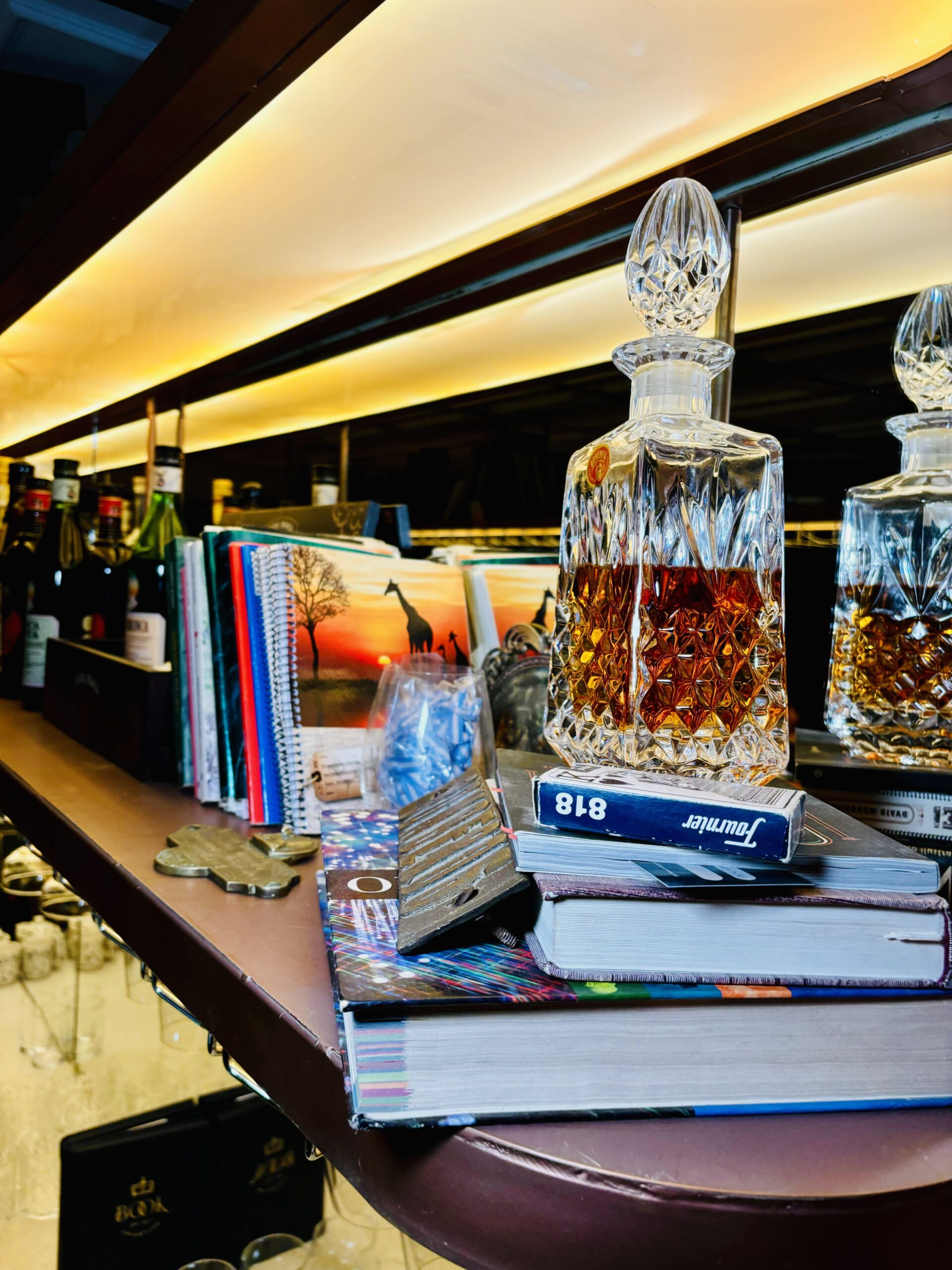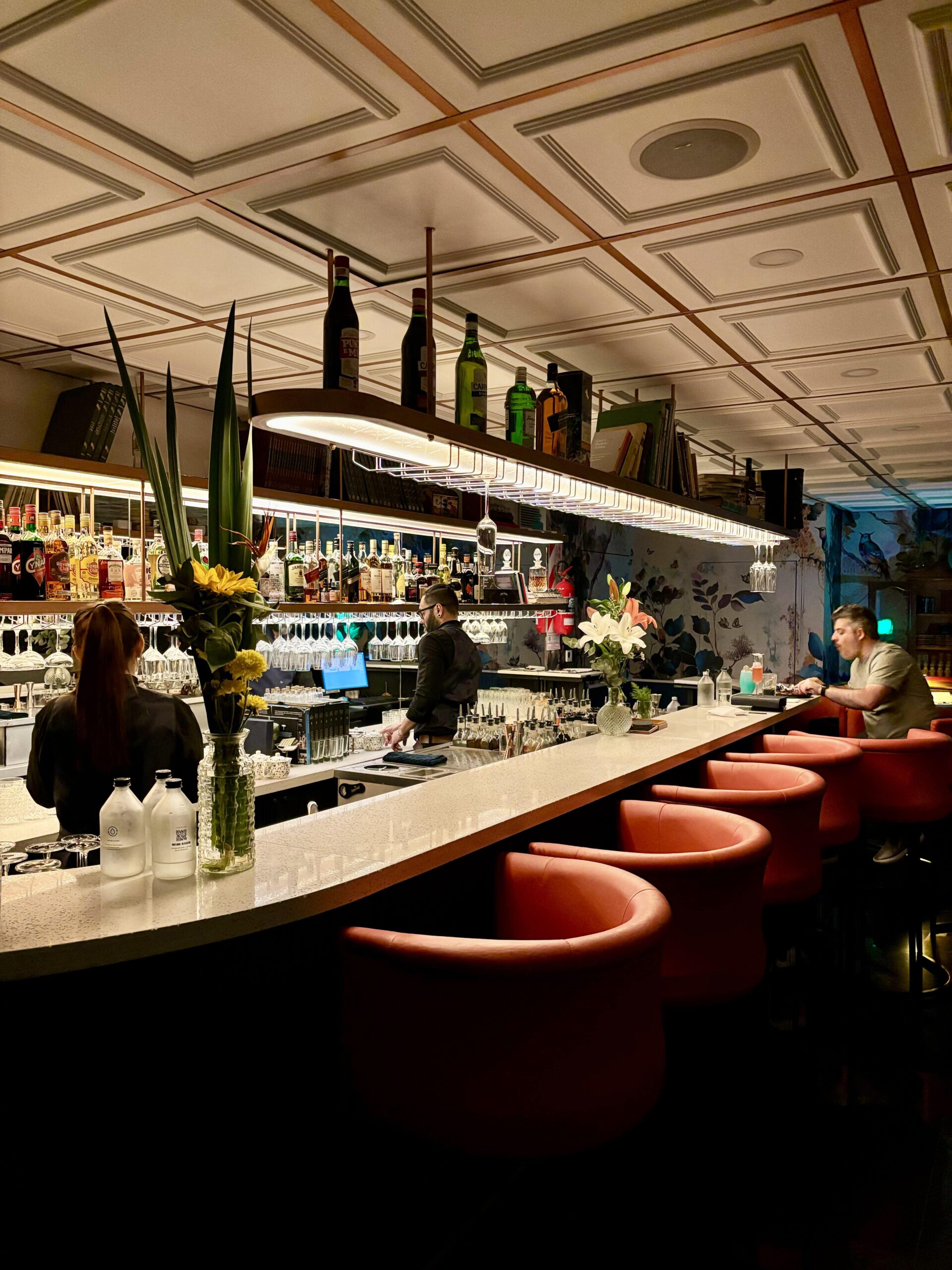 Como quien sube las escaleras para ir al baño, un pesado cortinado que se puede abrir, da paso a un pequeño pero muy speakeasy, simple pero encantador con buena energía. La barra para unas 9 banquetas elegantes está muy bien decorada. Materiales nobles y algunos objetos vintage contribuye a formar la atmósfera correcta. “THE BOOK es un lugar fuera del tiempo: acá no hay tecnología, ni relojes, ni menos pantallas”, aludió nuestra eventual anfitriona.
