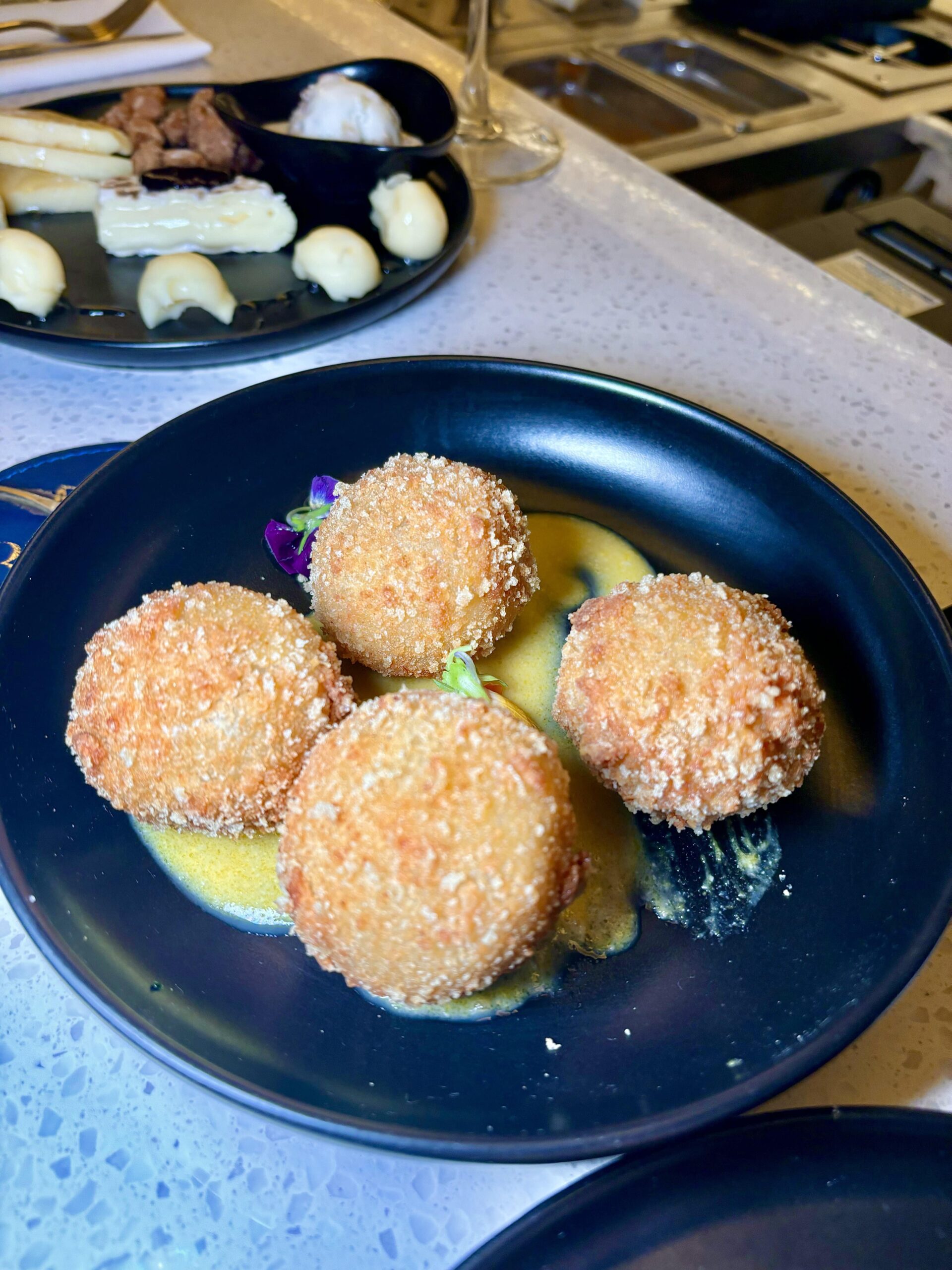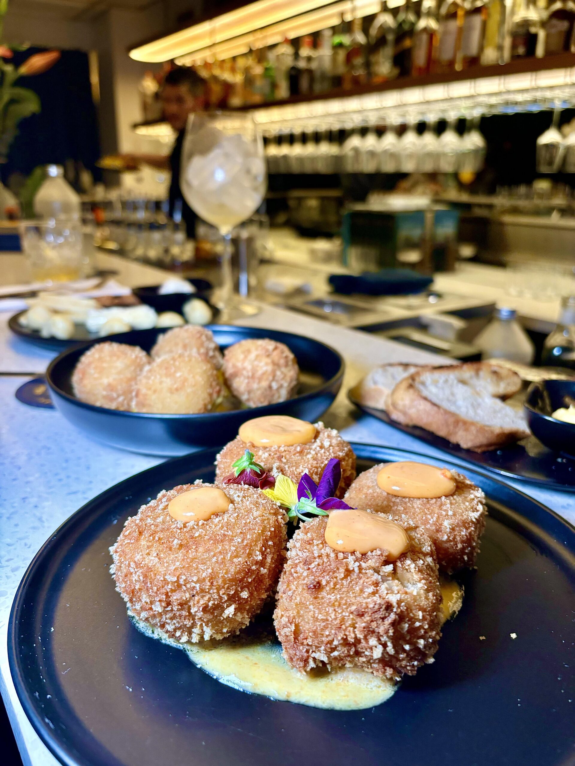 las (4) Croquetas de molleja ahumada con salsa huancaína ($11600);