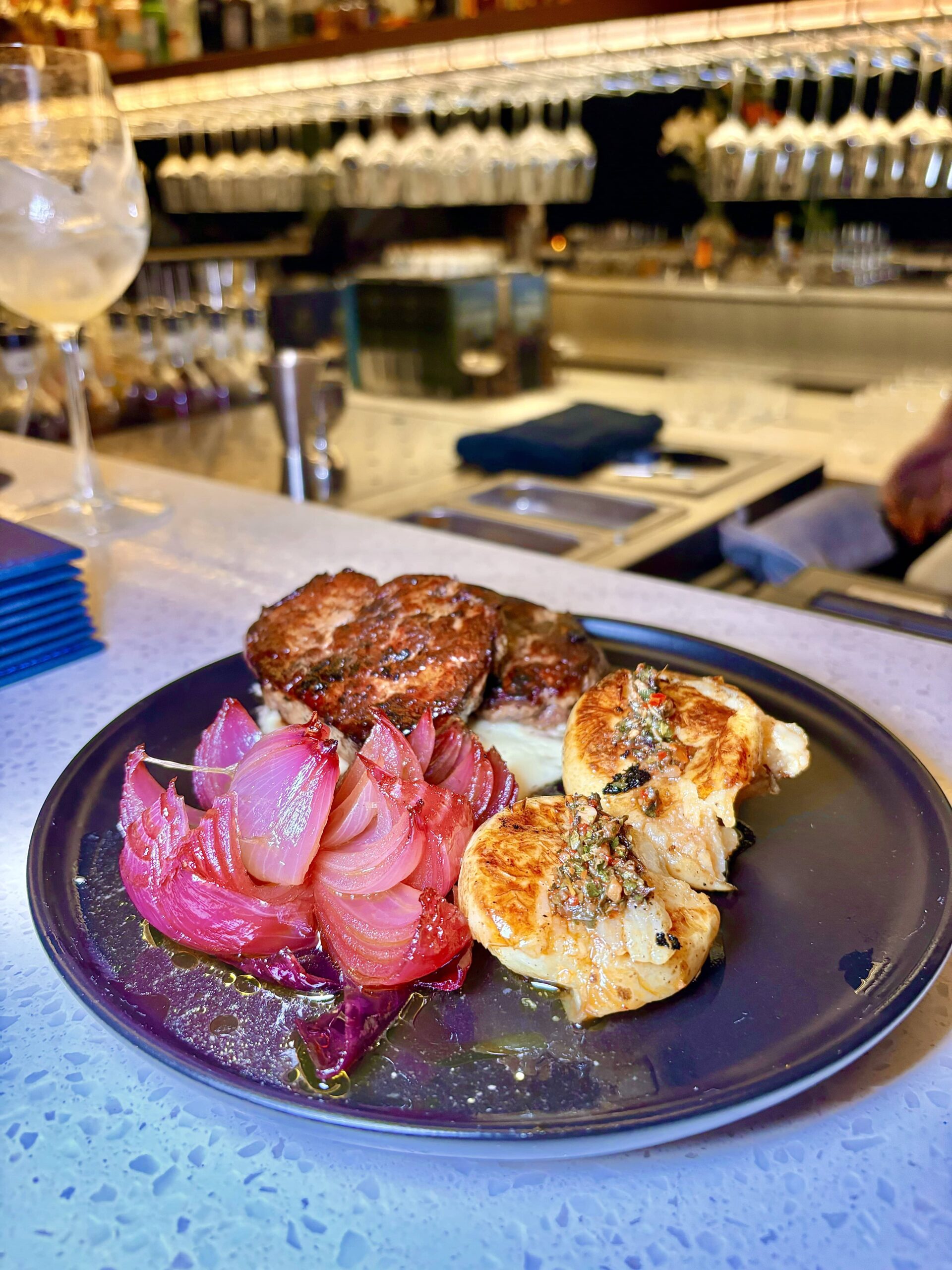 los Medallones de lomo en crema de trufa, flor de cebolla, y papines al fierro ($15600).