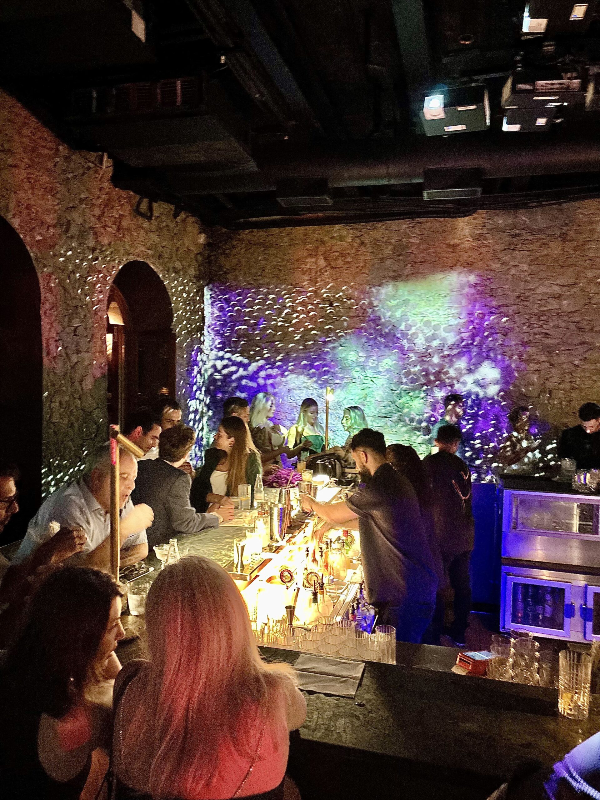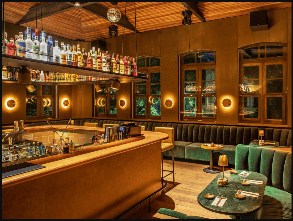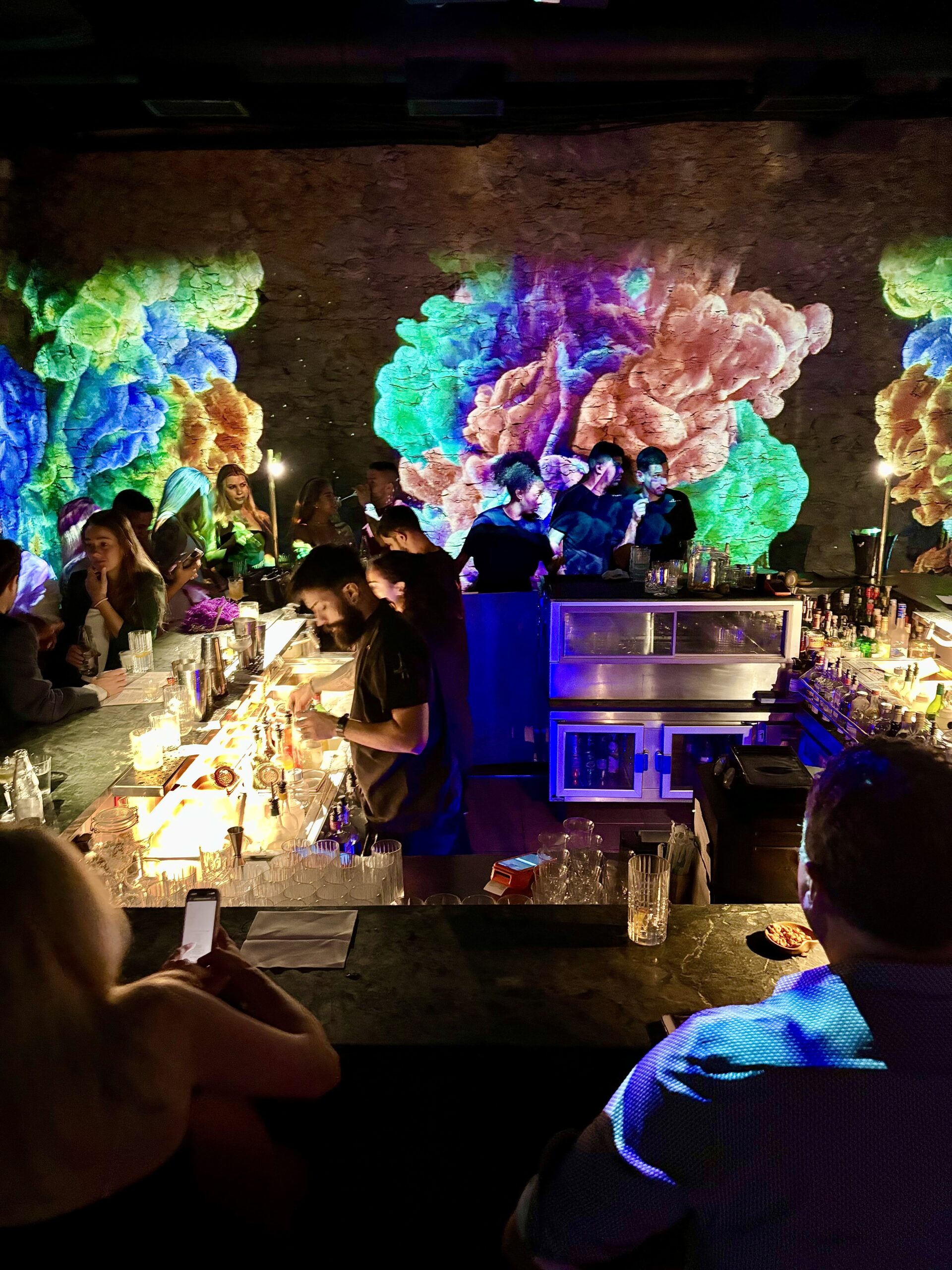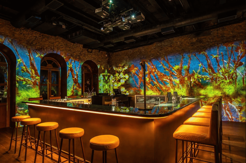 – Un BAR de entrada, el punto focal del edificio histórico. Con una barra tipo isla cuadrada, que funciona como antesala del restaurante, pero eleva su perfil con proyecciones sobre las paredes descascaradas símil piedra, bajo la curaduría del artista Batman Zavareze.
