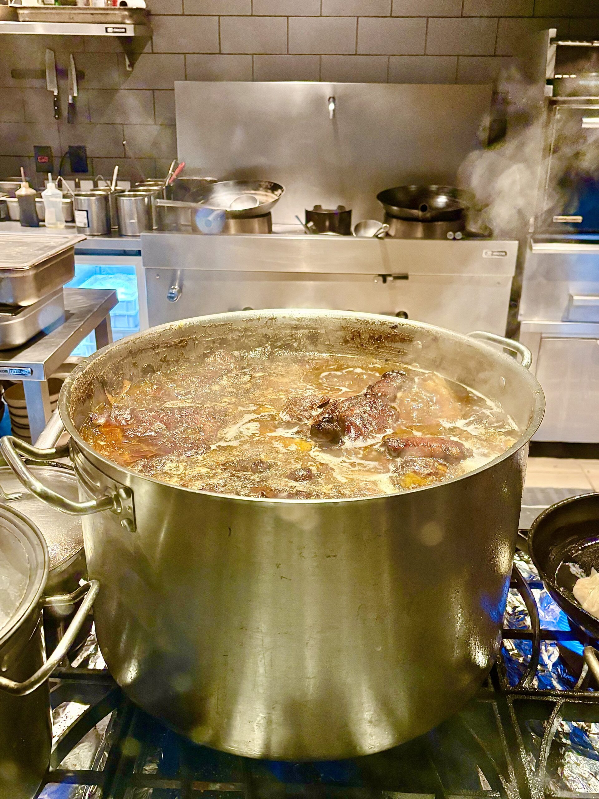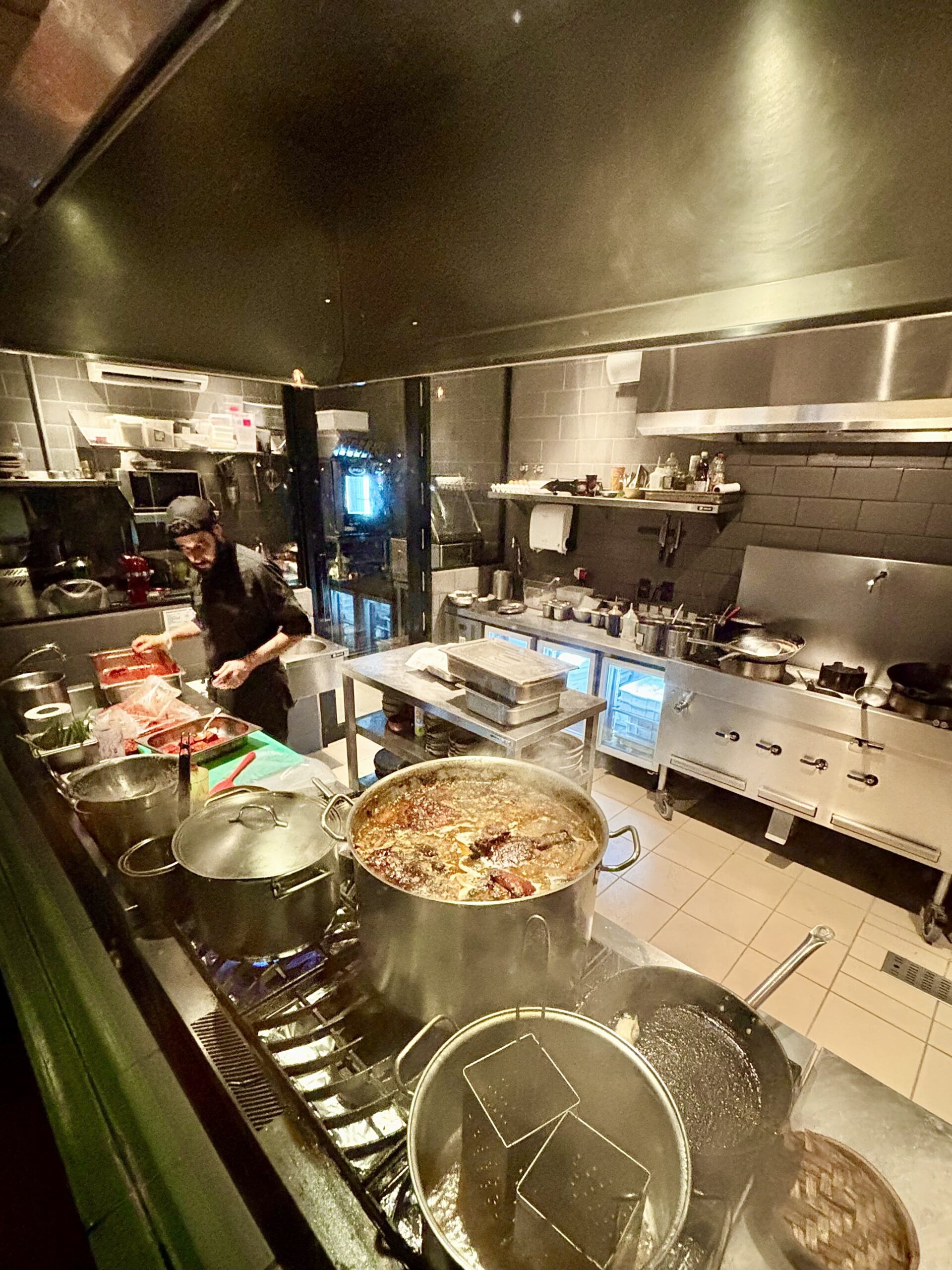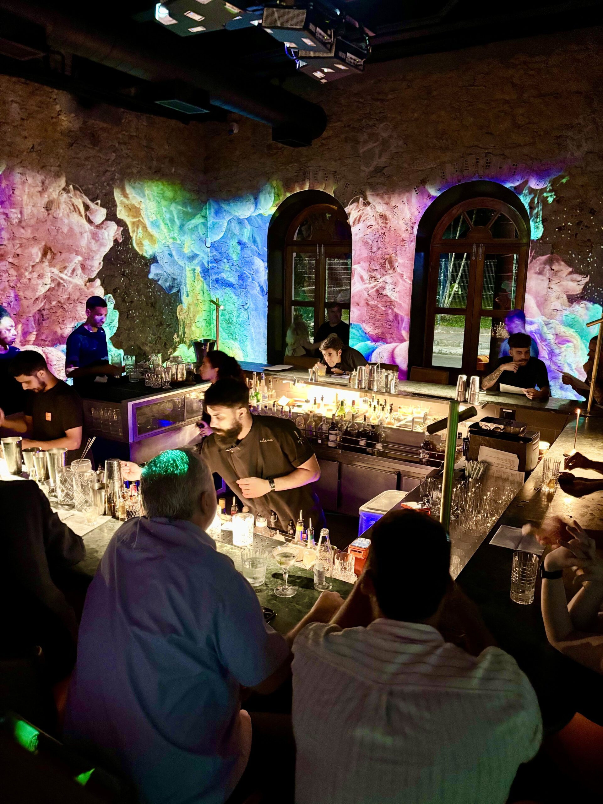 – Un BAR de entrada, el punto focal del edificio histórico. Con una barra tipo isla cuadrada, que funciona como antesala del restaurante, pero eleva su perfil con proyecciones sobre las paredes descascaradas símil piedra, bajo la curaduría del artista Batman Zavareze.