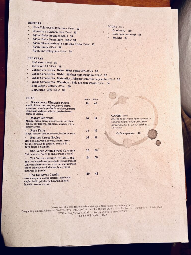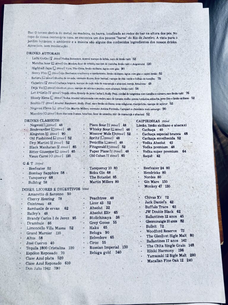 La carta lleva la firma del asesor Alex Mesquita, de mucha mayor capacidad para generarse imagen que para la hospitalidad, ya que su destrato está entre los peores recibidos entre centenares de bares que visitamos por el mundo.