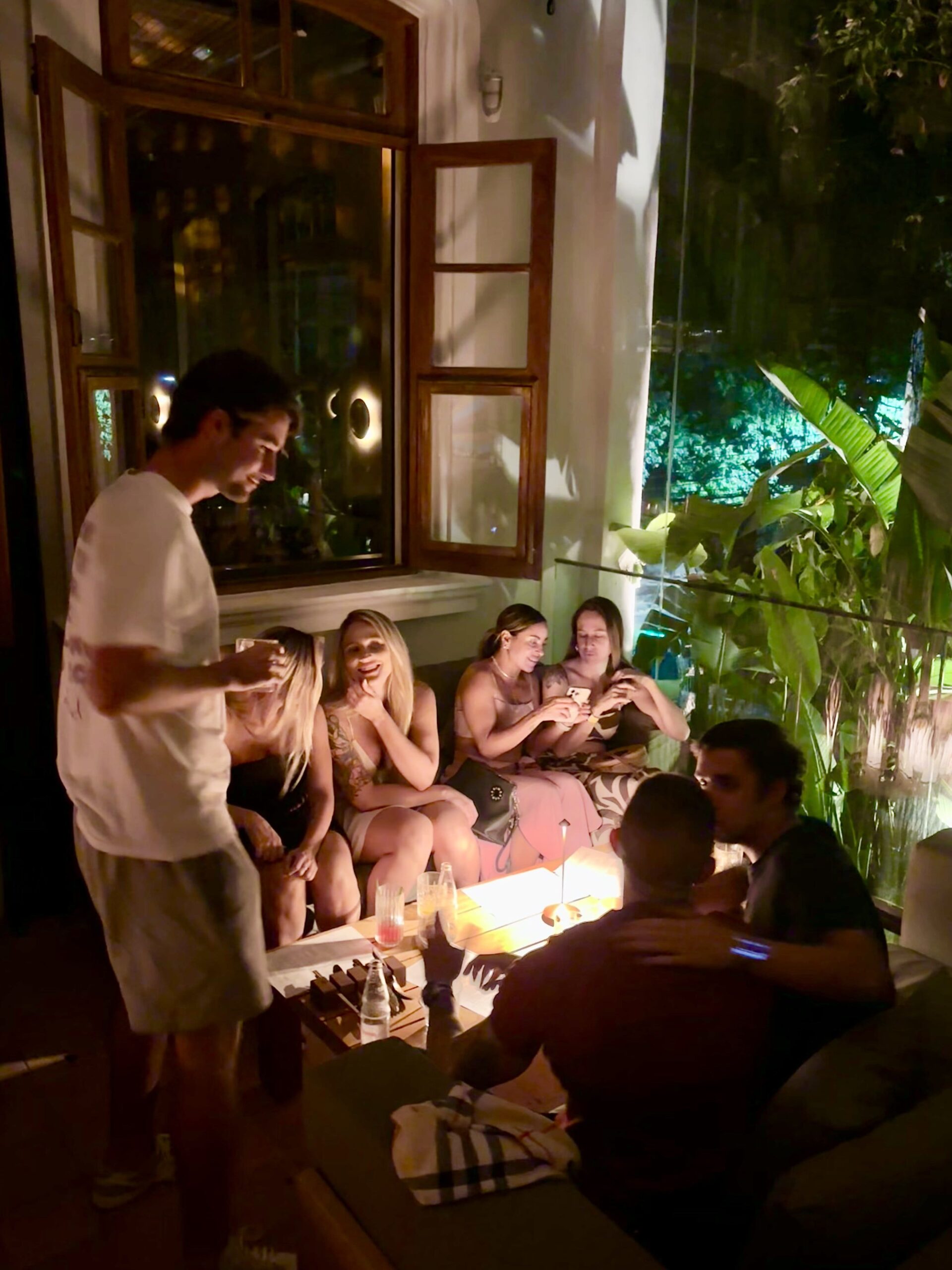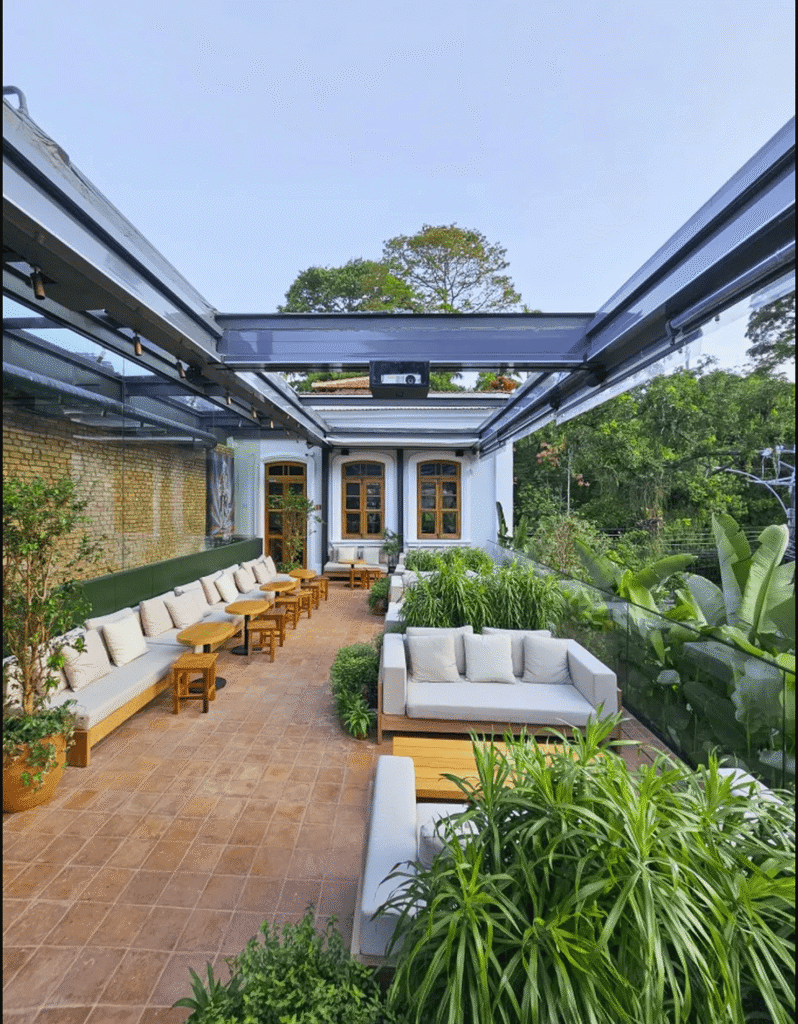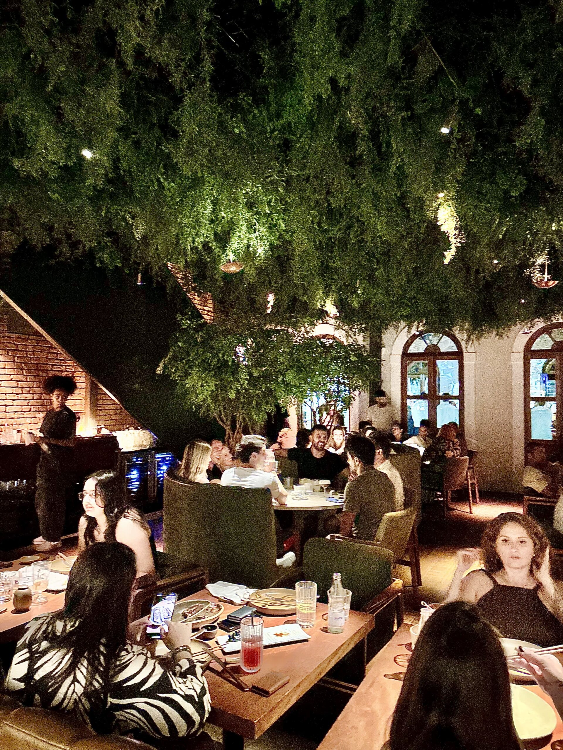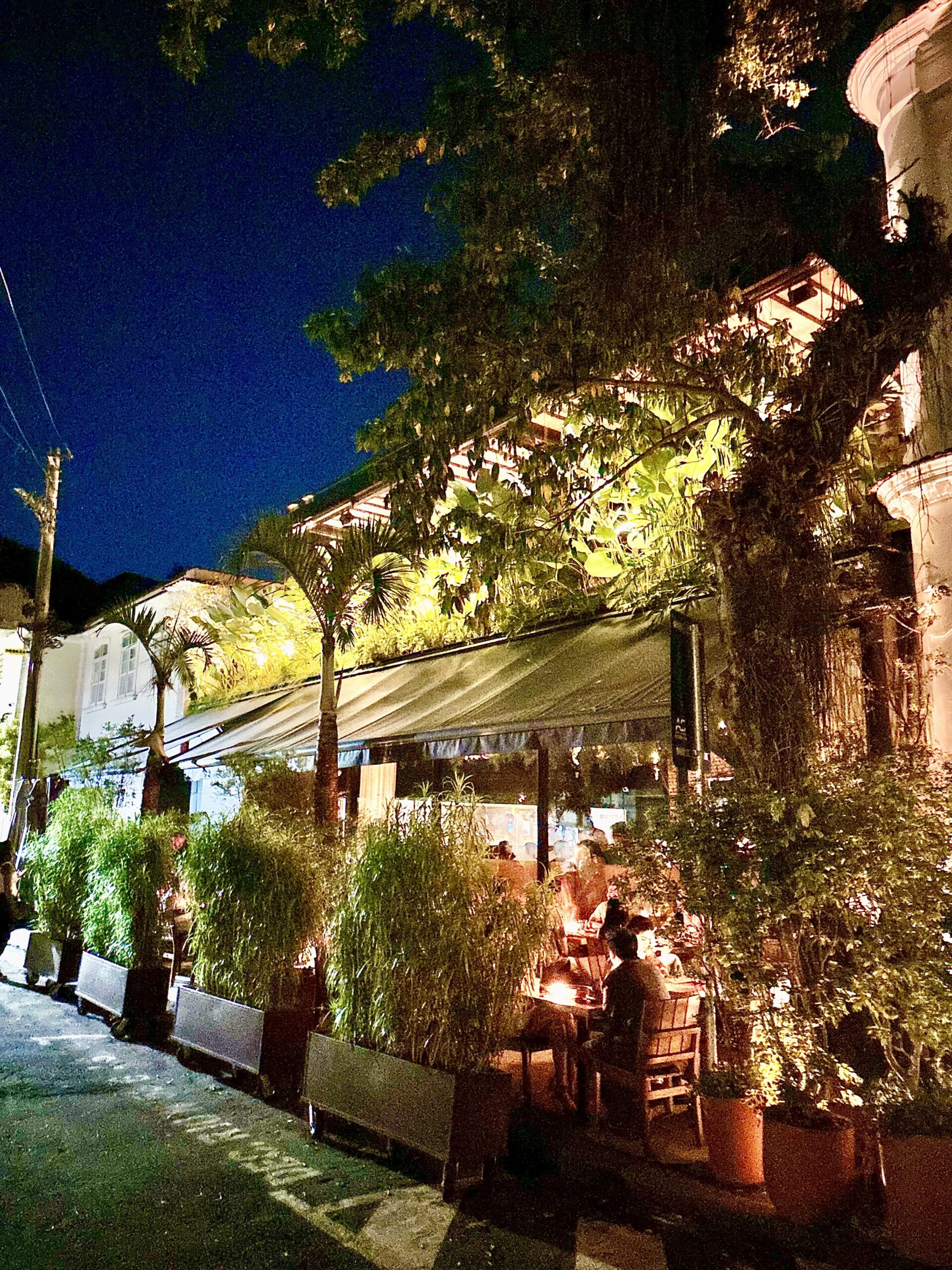 Allí en un caserón colonial de 2 plantas con fachada blanca, sobre una esquina frente al inmenso parque Botánico, donde había un resto japonés, Elena abrió en 2022 para posicionarse como un must de la “cidade”. La antigua casona era parte del complejo histórico “Chácara do Algodão”, que fuera vivienda para trabajadores de una gran fábrica textil. El estudio del Arq. Thiago Bernardes restauró la fachada histórica con la validación del Instituto Rio Patrimônio da Humanidade.