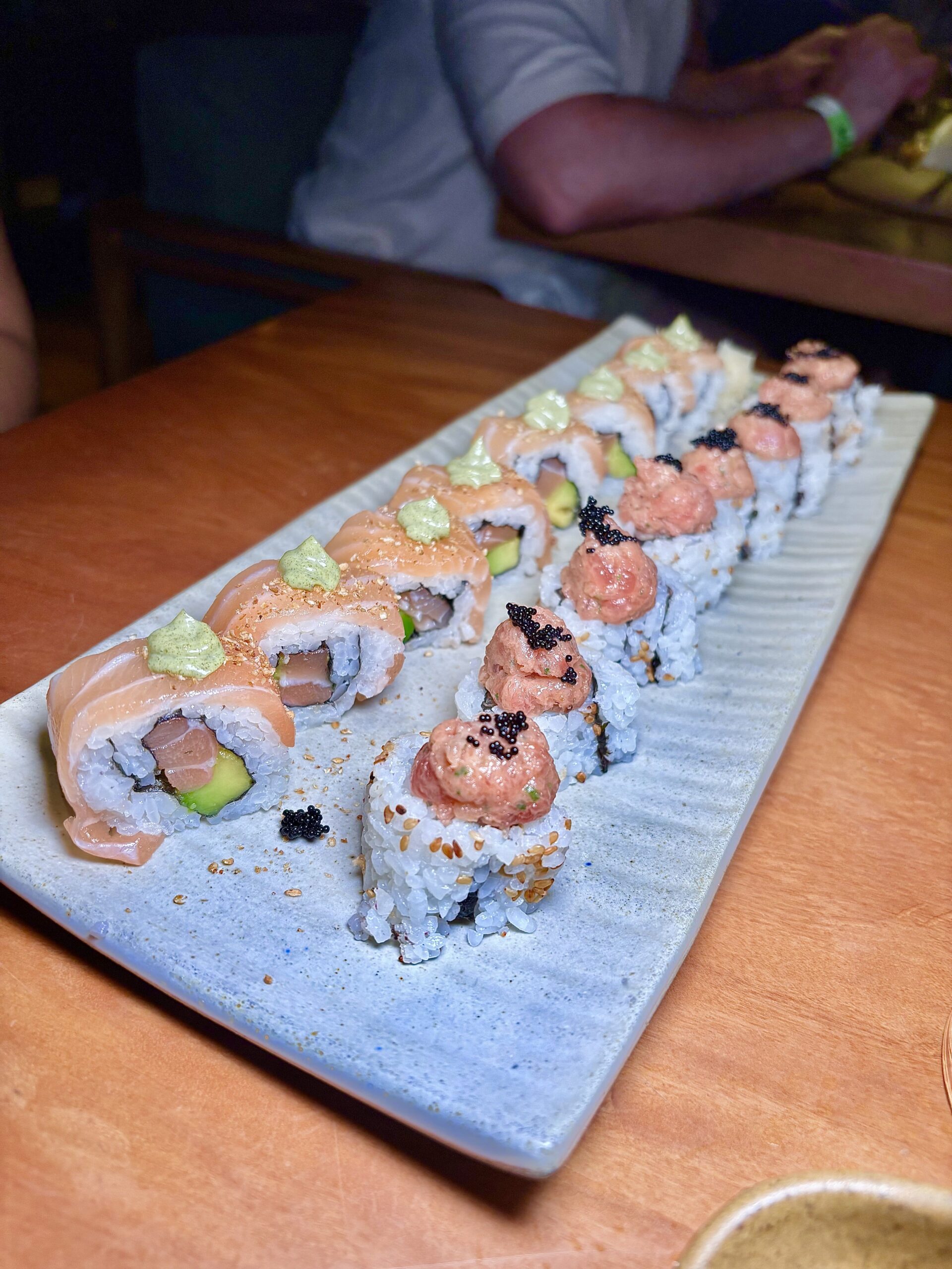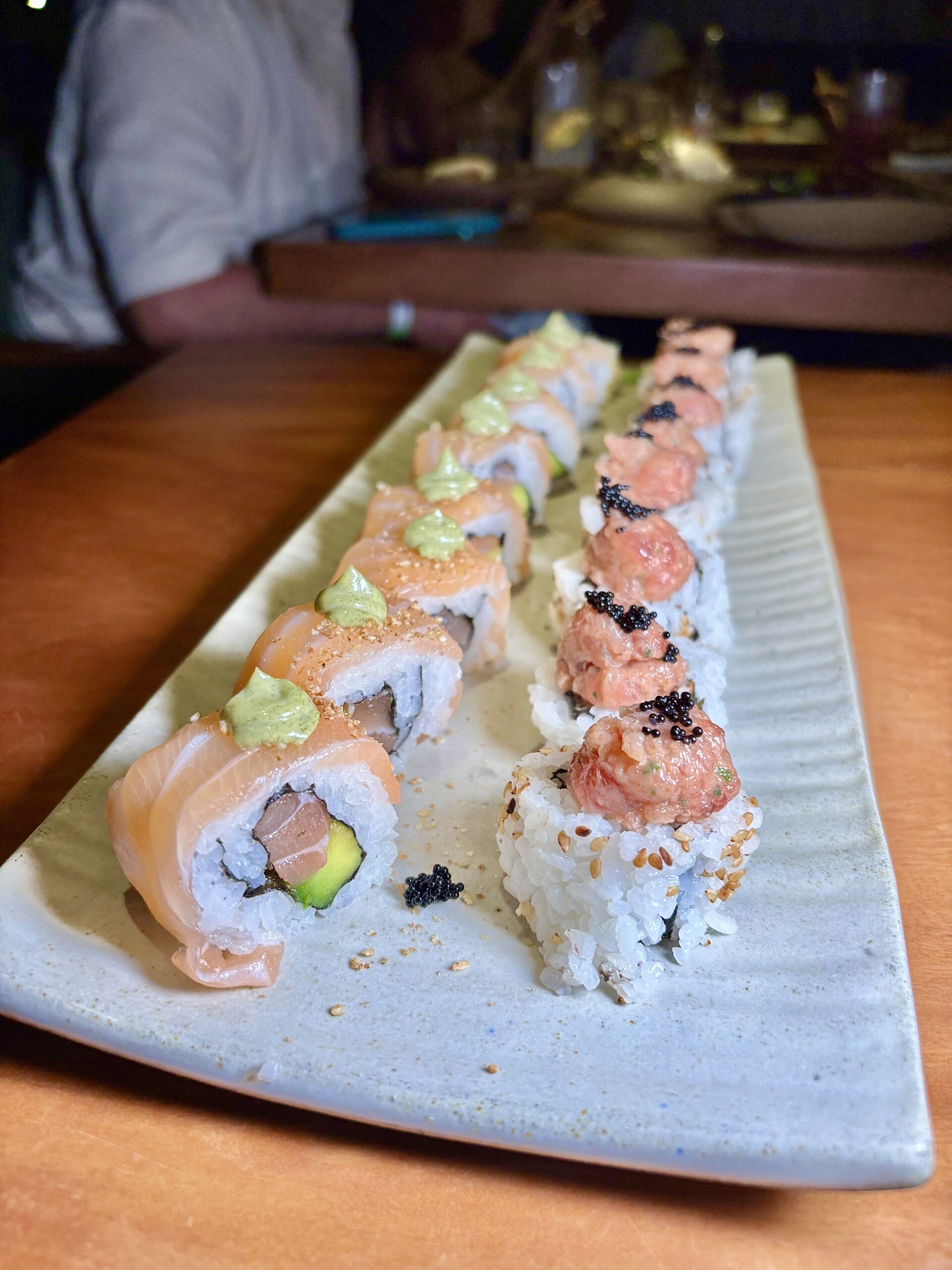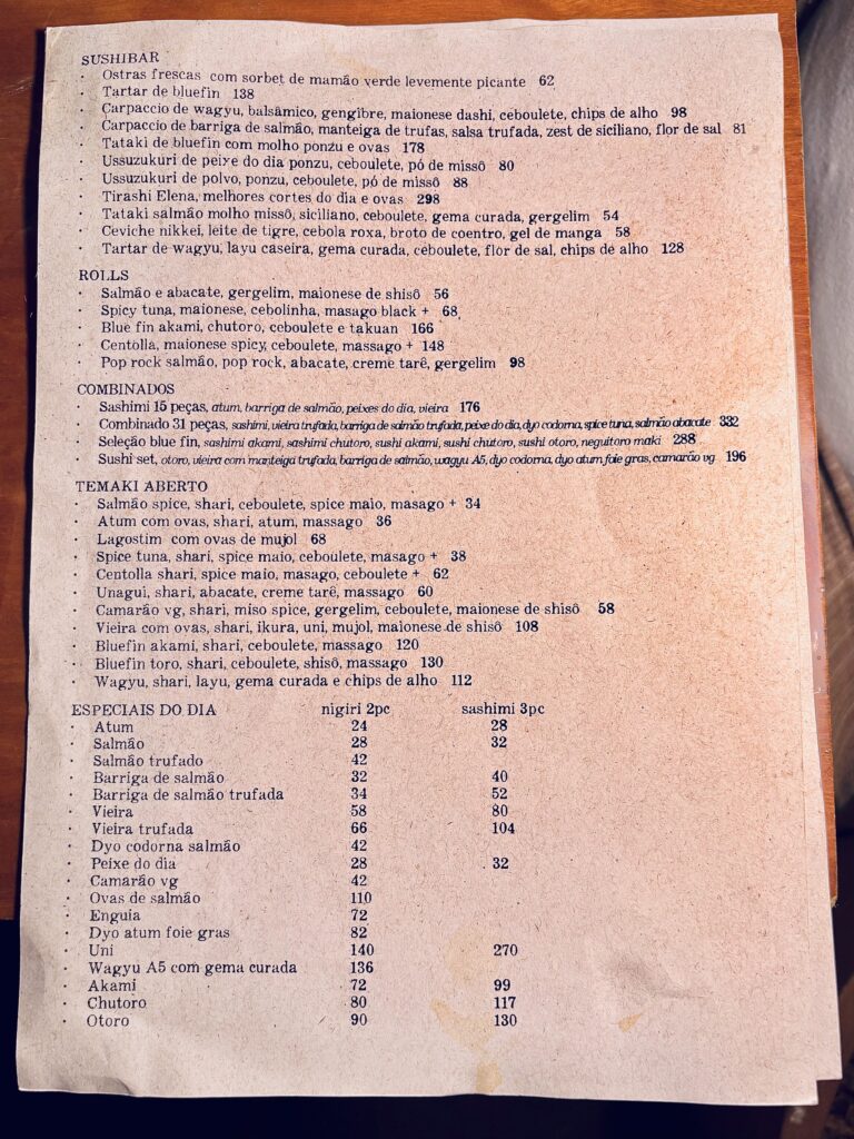Su carta se sectoriza en: Entradas (5); Dumplings (7); “Para Comer con las Manos” (6); Principales (8); Acompañamientos (4); y Postres (6). Aparte la página de “Sushibar” (11); Rolls (5); Combinados (4); Temaki Abierto (11); y Especiales del Día/ Nigiris de 2 piezas con 18 tipos de pescados.