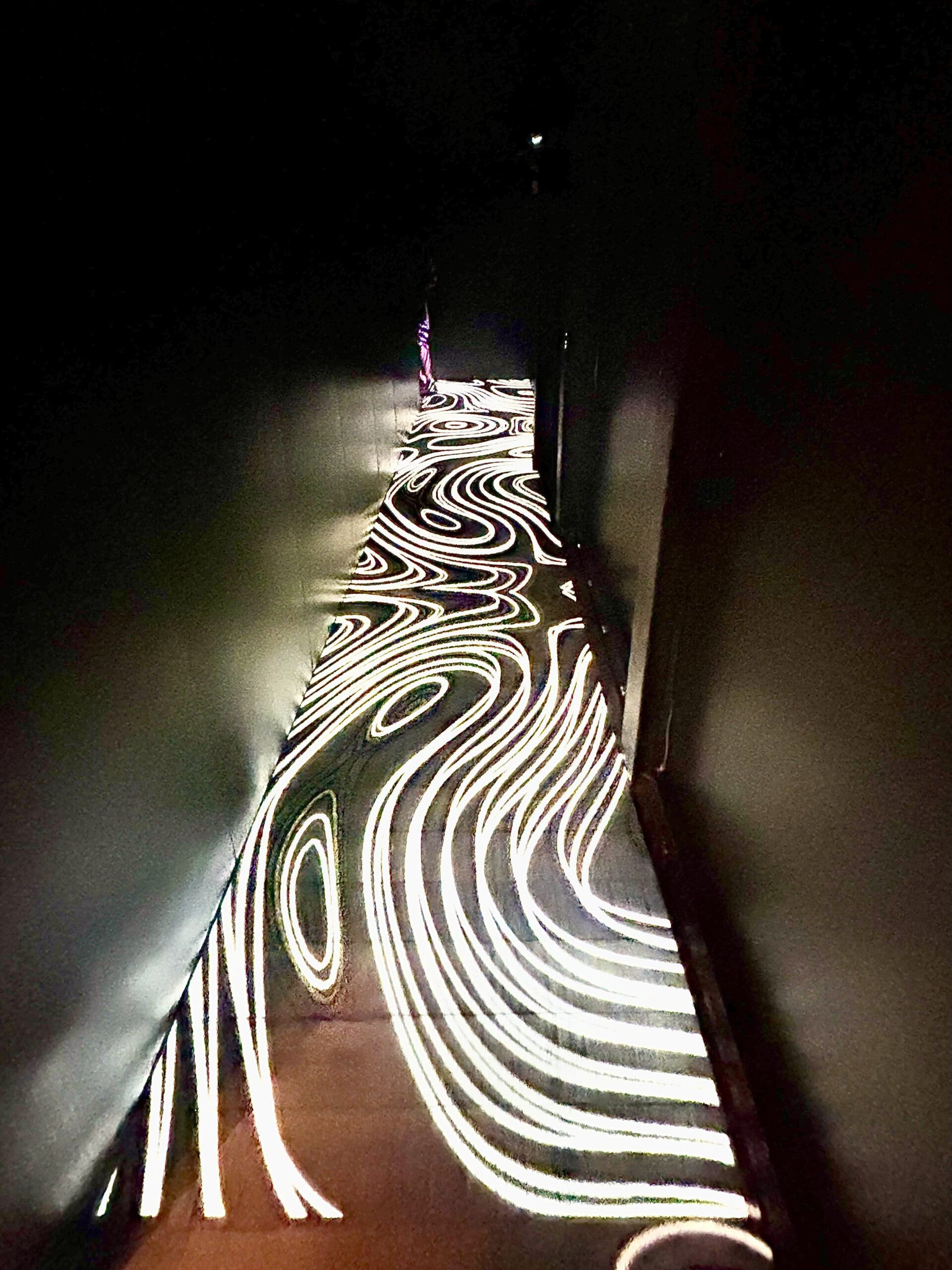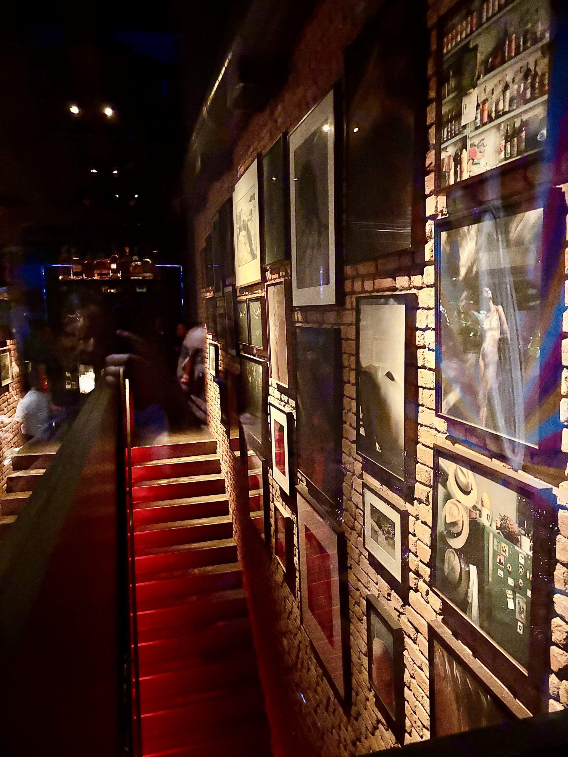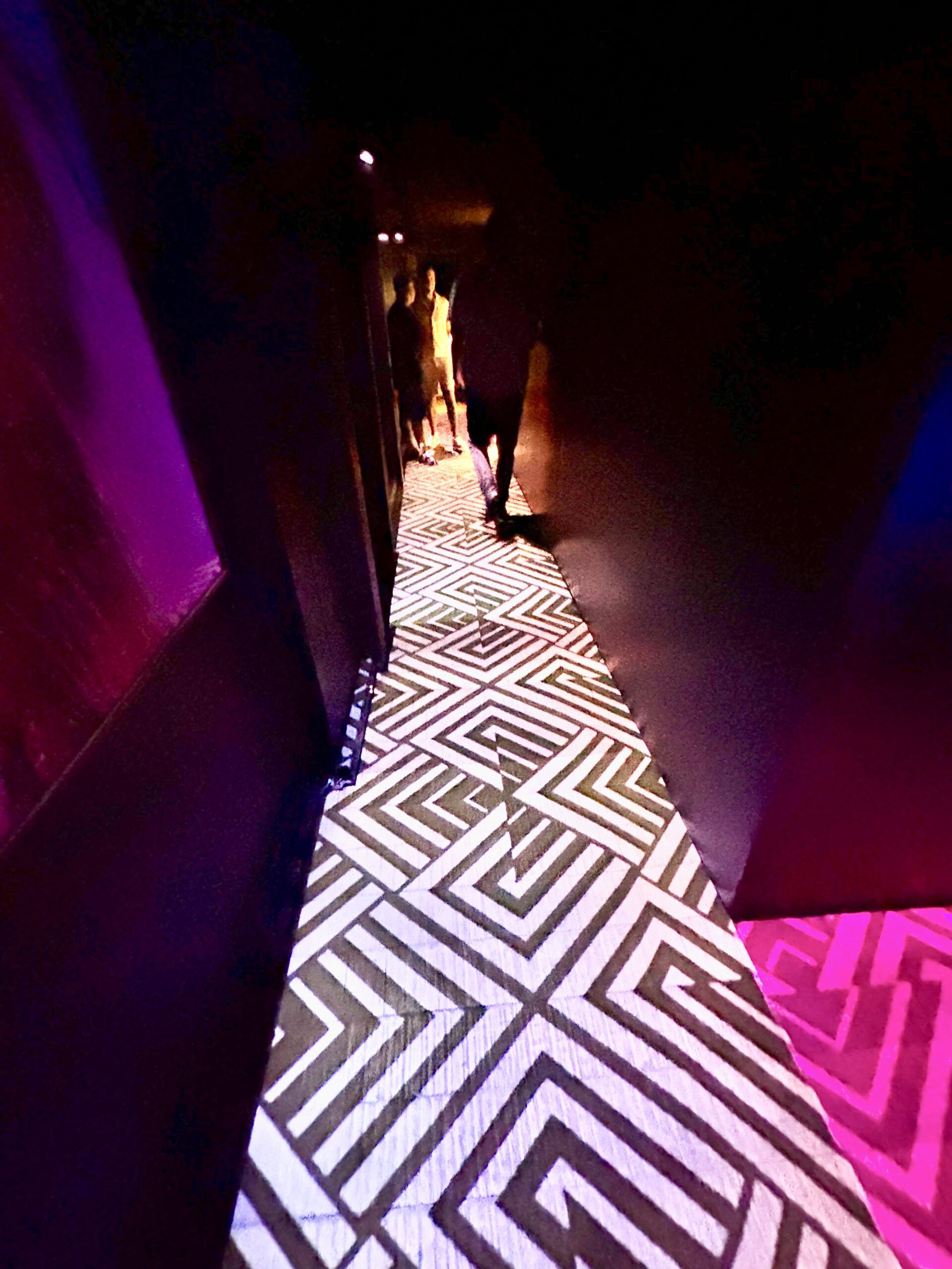 Párrafo aparte para el baño unisex, sorprendiendo ya desde el pasillo con proyecciones sobre el piso. Dentro parece un boliche, bien “instagramable” con espejos y luces llamativas. Luego la escalera que va al rooftop, exhibe cuadros de artistas que ayuda a la ambientación.