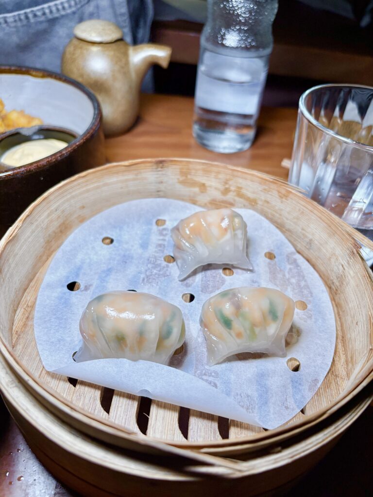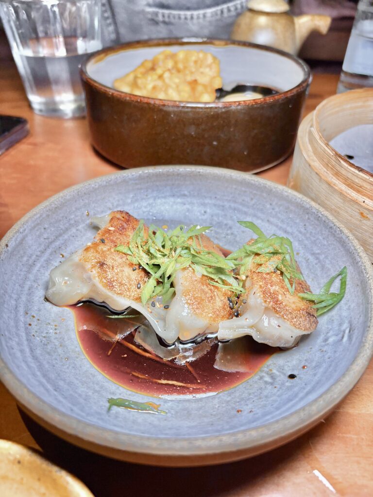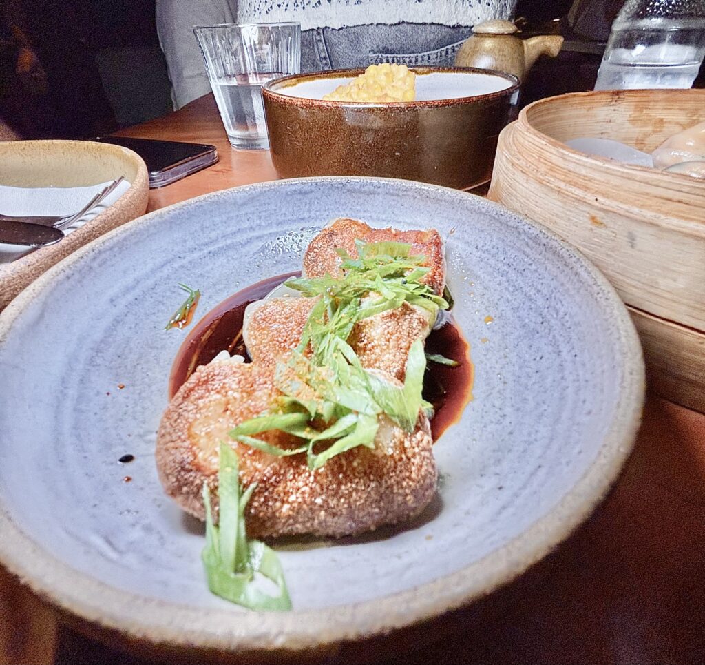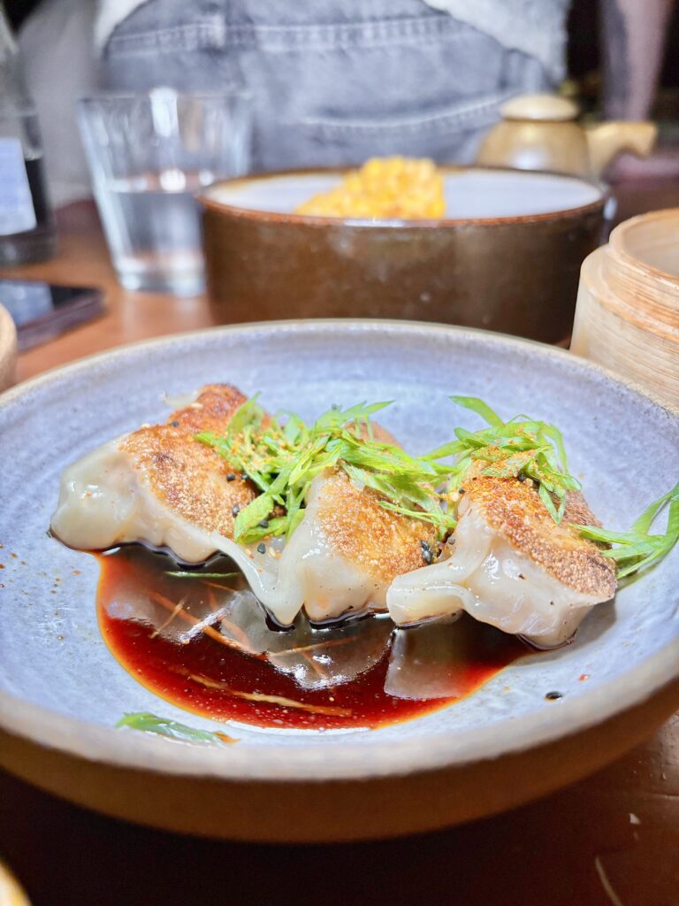 A la mesa sentados, probamos 2 tipos de Dumplings, Gyozas de cerdo (36 R$, 3 piezas), y 3 de Rolls de 10 piezas, todo muy delicioso, entre una variedad de sushi y platos súper amplia. Había baos, katsu sando (sandwich japonés de panceta), tempura, Pad Thai de camarones, Currys y muestras de comida callejera.