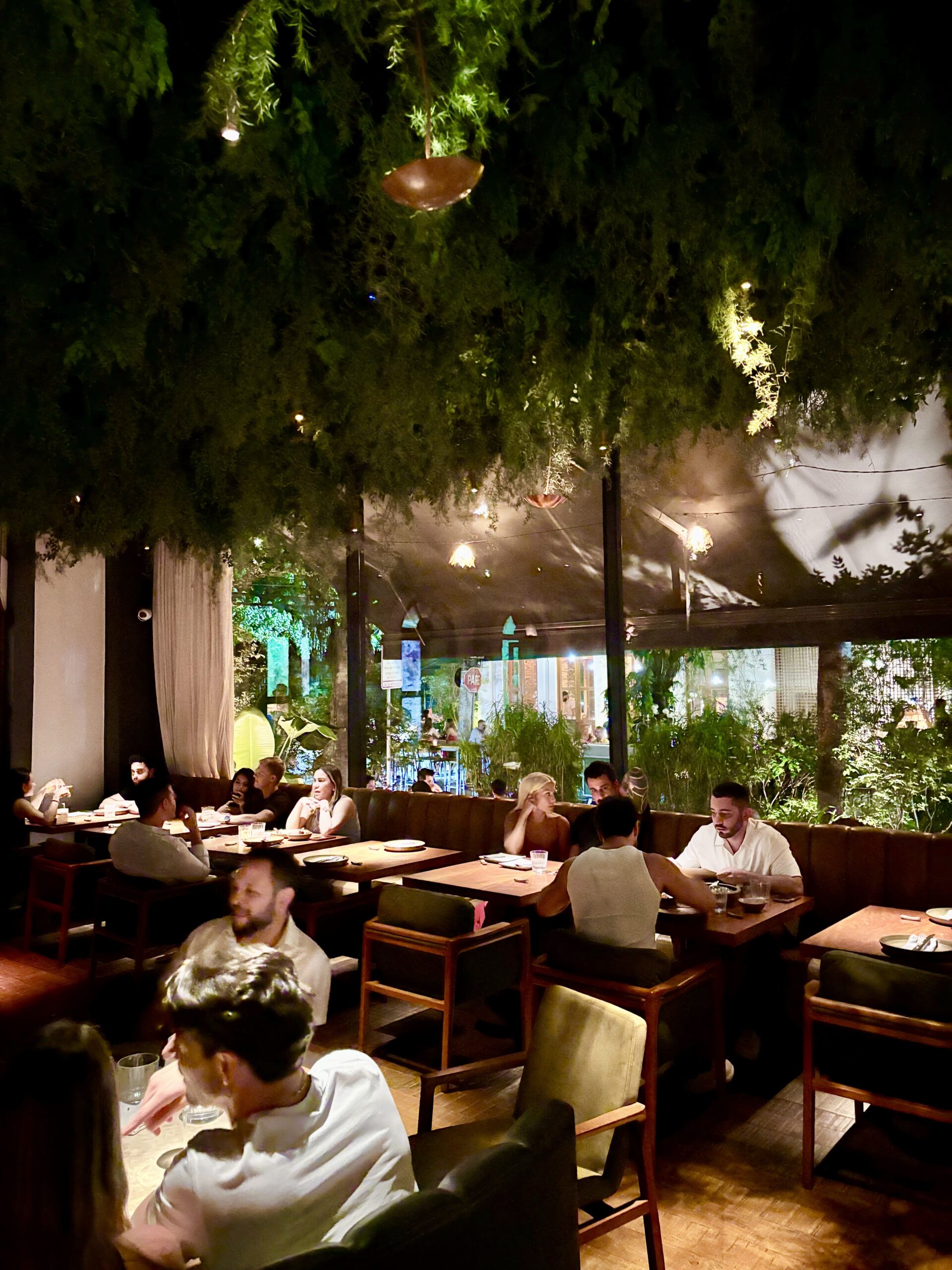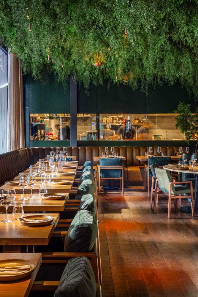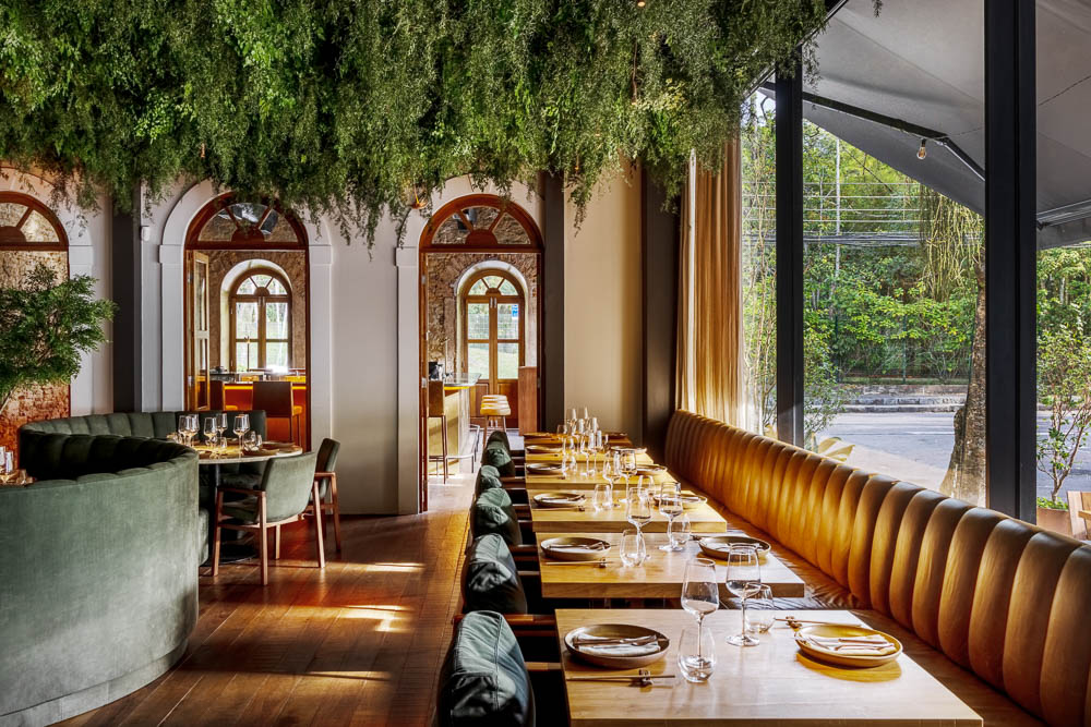 Por dentro, sumó detalles modernos, sofás curvos en verde, grandes ventanales a la calle y jardines colgantes que emulan al entorno natural del Jardín Botánico. La sensación de foresta y verano continúa en la vereda, por la calle lateral con mesas al aire libre, algo típico en Río.