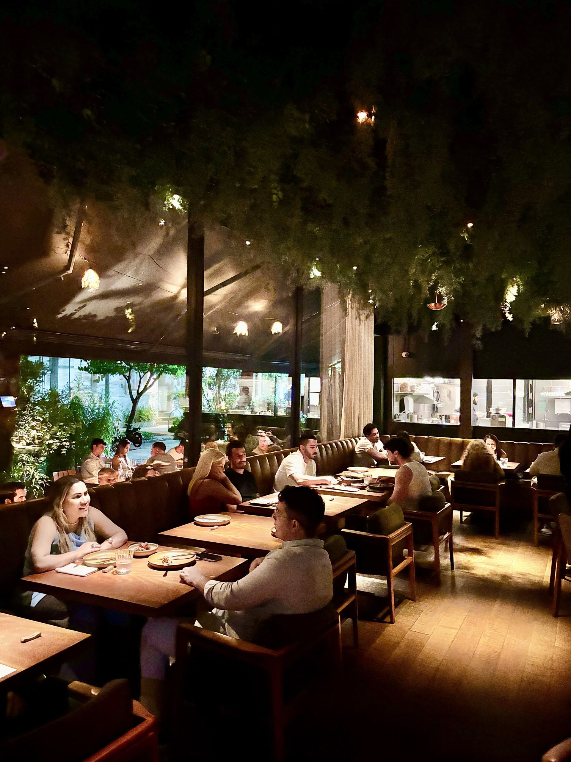 – Un SALÓN principal como típico resto pero de luz muy tenue, al que se accede desde el bar. La cocina está bien a la vista y el sector externo en la vereda con toldos y divisores de plantas.