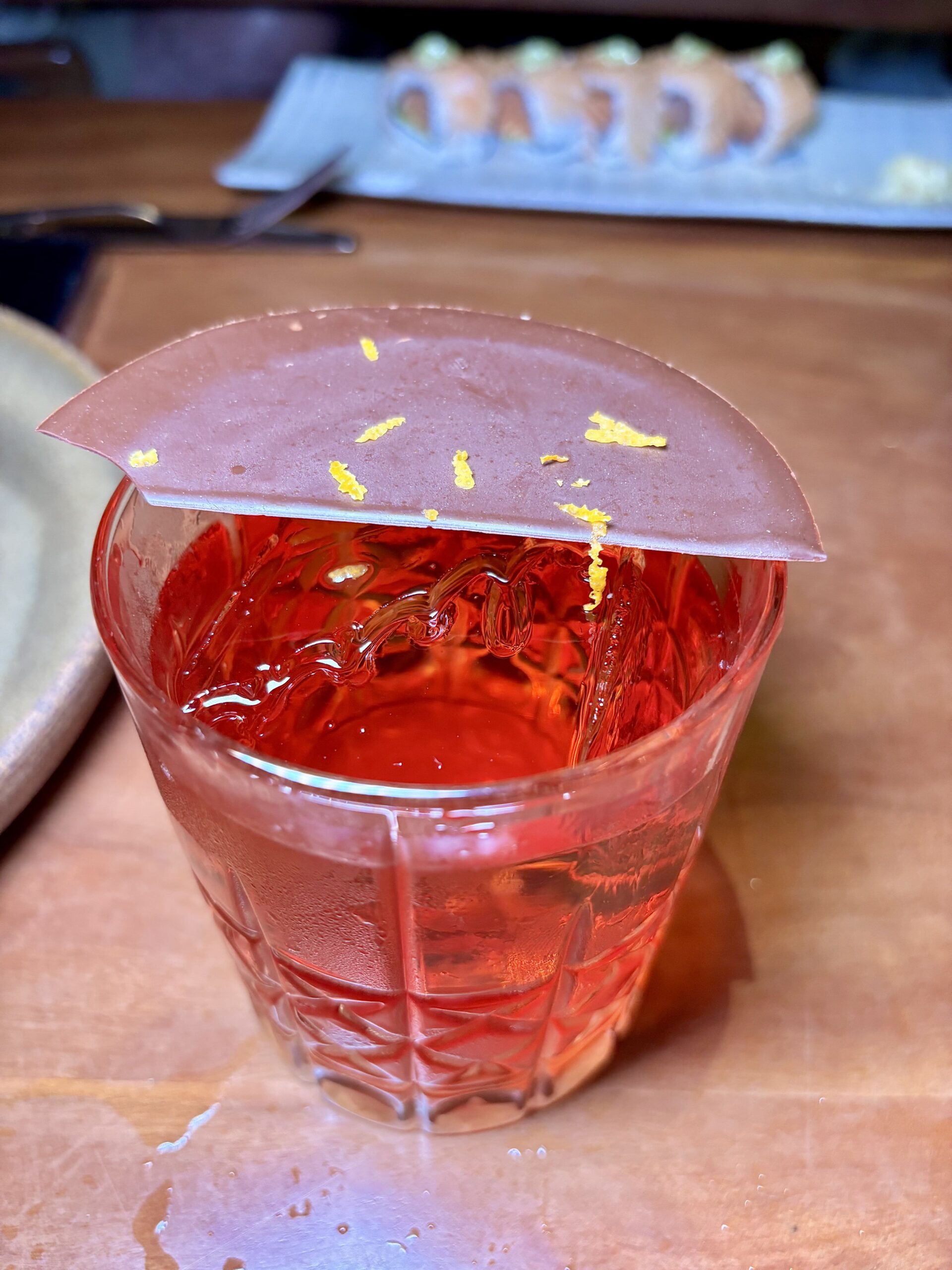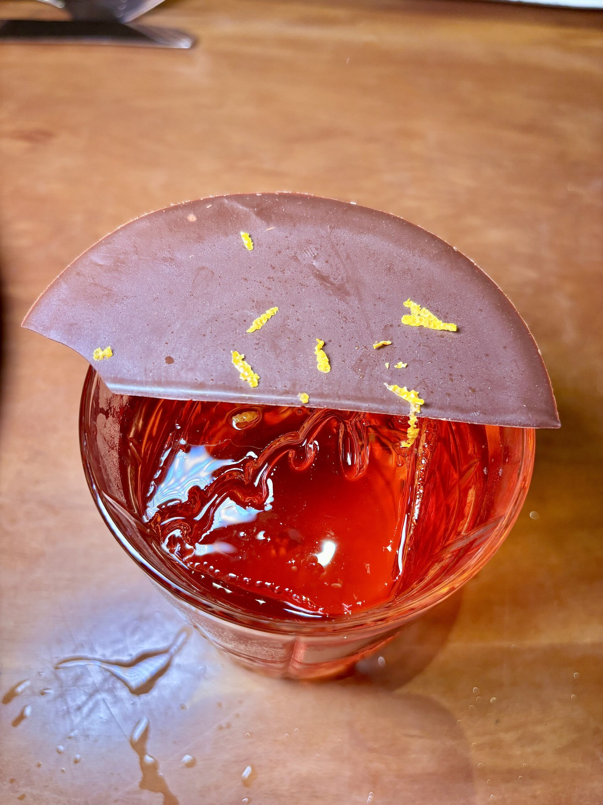 -NEGRONI ELENA (90 R$- 17 u$s), una versión casi igual a la del “Negroni Perfetto”, con gin Martin Millers, vermouth Antica Formula, Campari y chocolate medio amargo, con una medialuna finita de chocolate como garnish. Carísimo!