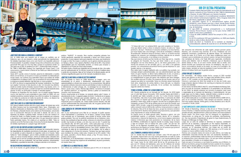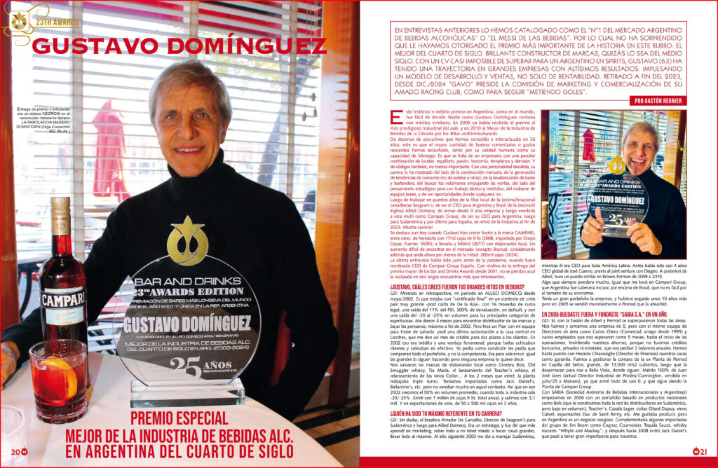 EN ENTREVISTAS ANTERIORES LO HEMOS CATALOGADO COMO EL “N°1 DEL MERCADO ARGENTINO DE BEBIDAS ALCOHÓLICAS” O “EL MESSI DE LAS BEBIDAS”. POR LO CUAL NO HA SORPRENDIDO QUE LE HAYAMOS OTORGADO EL PREMIO MÁS IMPORTANTE DE LA HISTORIA EN ESTE RUBRO: EL MEJOR DEL CUARTO DE SIGLO. BRILLANTE CONSTRUCTOR DE MARCAS, QUIZÁS LO SEA DEL MEDIO SIGLO. CON UN CV CASI IMPOSIBLE DE SUPERAR PARA UN ARGENTINO EN SPIRITS, GUSTAVO (63) HA TENIDO UNA TRAYECTORIA EN GRANDES EMPRESAS CON ALTÍSIMOS RESULTADOS. IMPULSANDO UN MODELO DE DESARROLLO Y VENTAS, NO SOLO DE RENTABILIDAD. RETIRADO A FIN DEL 2023, DESDE DIC./2024 “GAVO” PRESIDE LA COMISIÓN DE MARKETING Y COMERCIALIZACIÓN DE SU AMADO RACING CLUB, COMO PARA SEGUIR “METIENDO GOLES”.