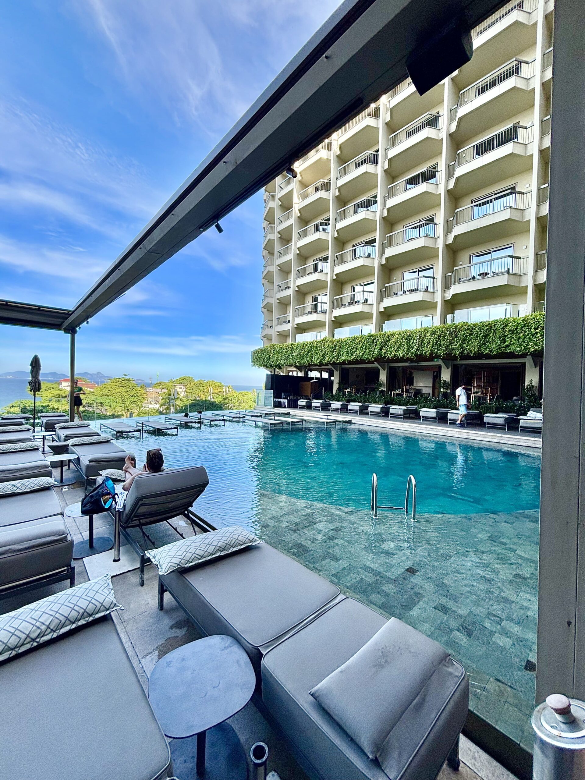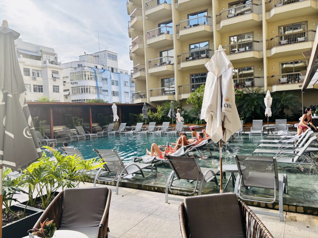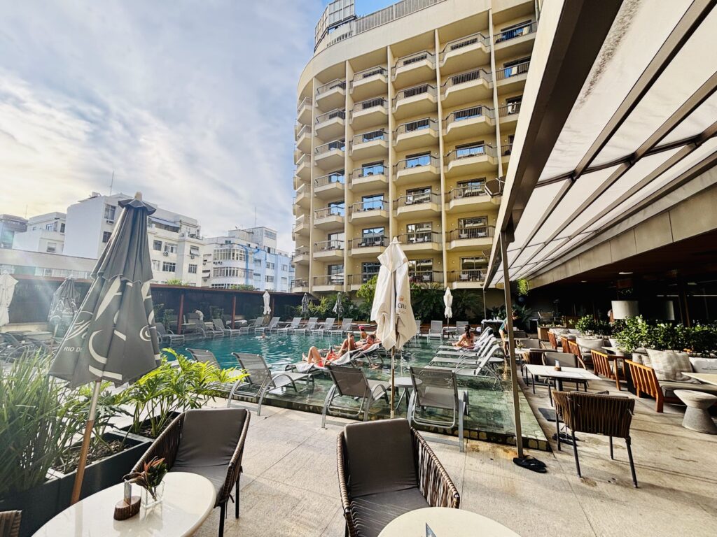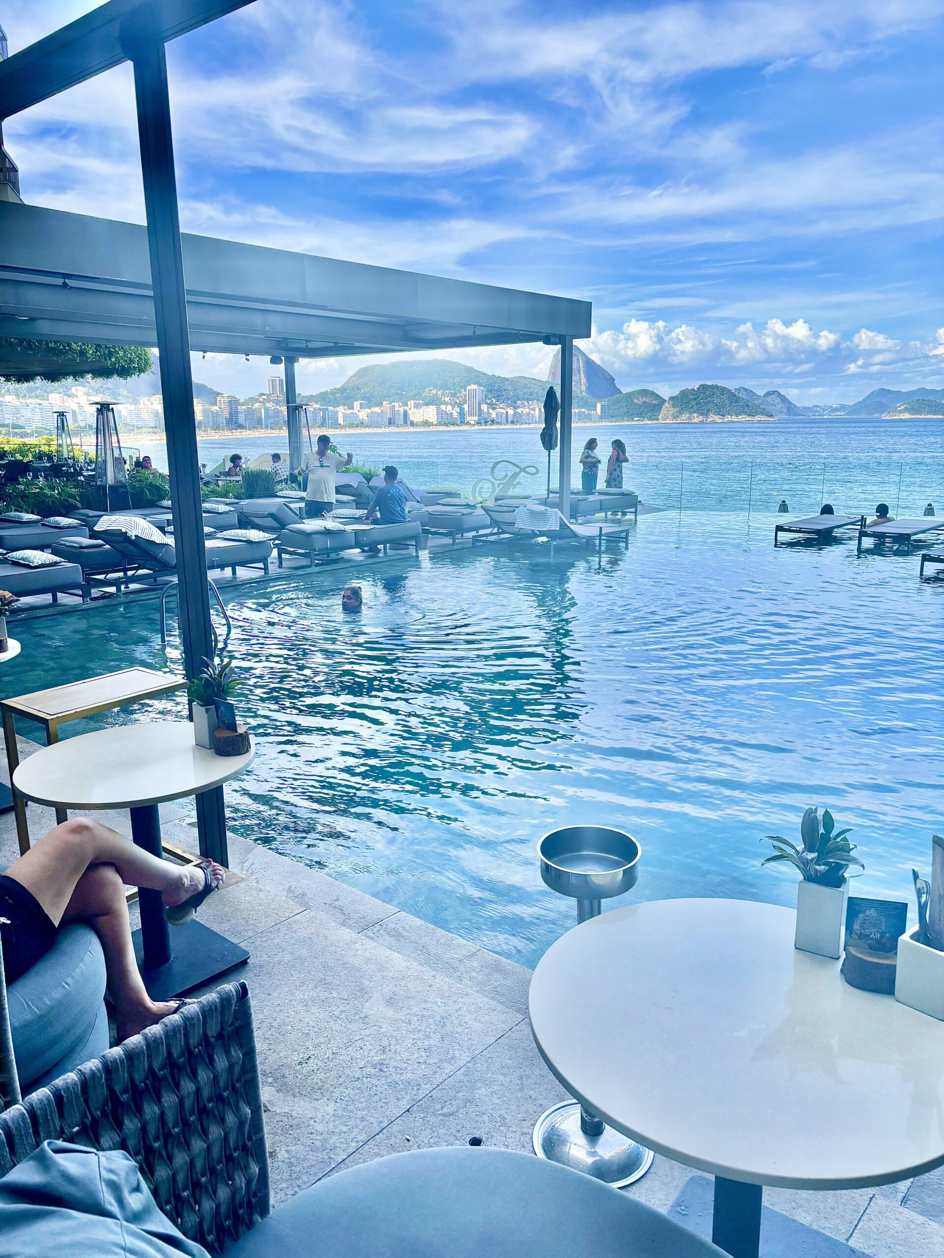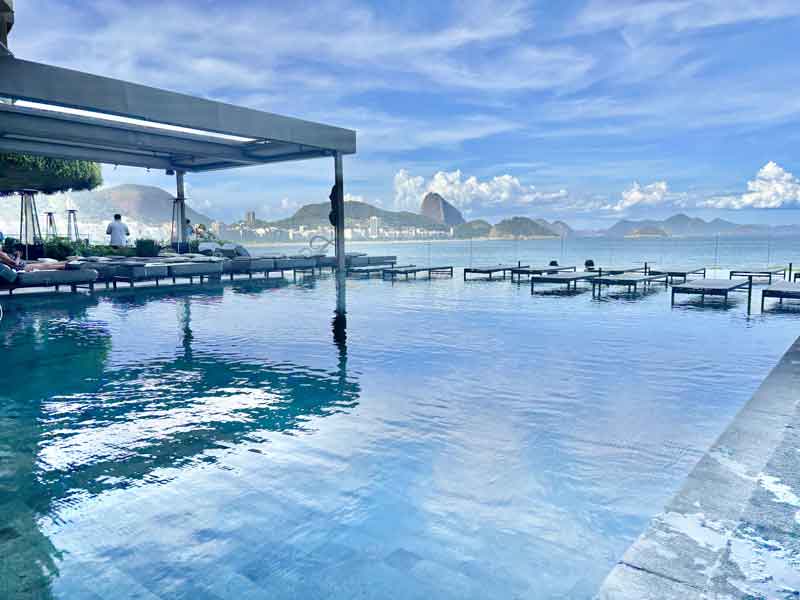 El que da al mar es el Spirit Copa, que ofrece un escenario fotográfico único como postal inolvidable. Ese es un gran plus por ej. frente al bar y restaurante del mítico Copabana Palace Hotel cuya piscina está encerrada, como resguarda pero sin vista al mar.