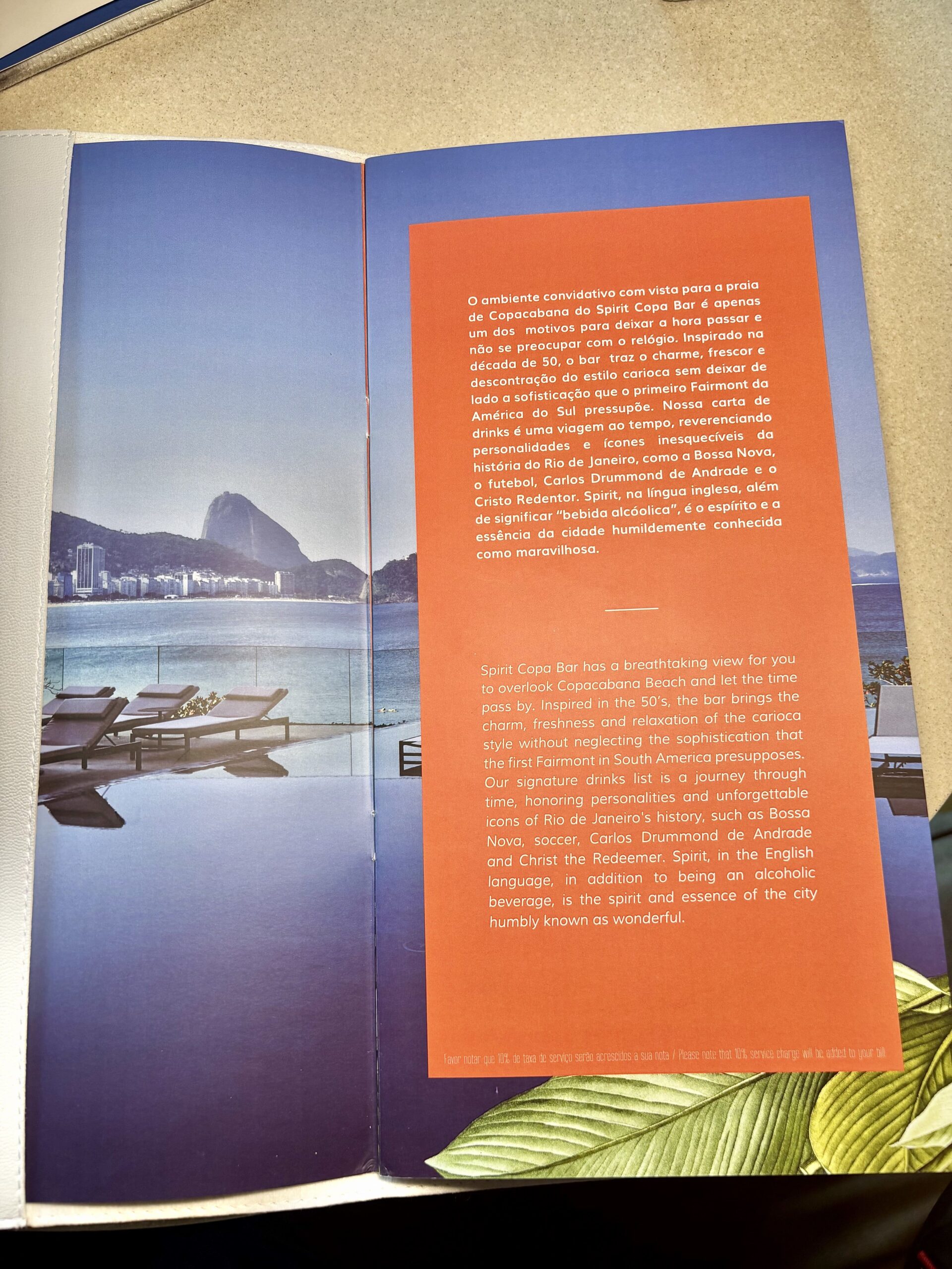 No es sólo el bar de un hotel 5*, que de hecho la mayoría dejan bastante que desear, aunque estén bien ambientados. Spirit Copa nació con la reapertura del FAIRMONT RIO DE JANEIRO Copacabana en 2019, proponiendo una amplia carta de tragos, programación musical diaria y un escenario inigualable: el horizonte de Copacabana, con el Pan de Azúcar y el Fuerte de Copacabana como telón de fondo, visto desde una terraza en el 6to piso con una piscina infinita. Una postal de lujo!