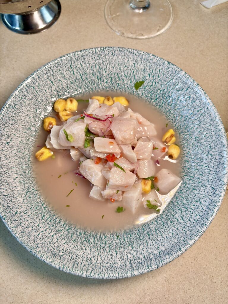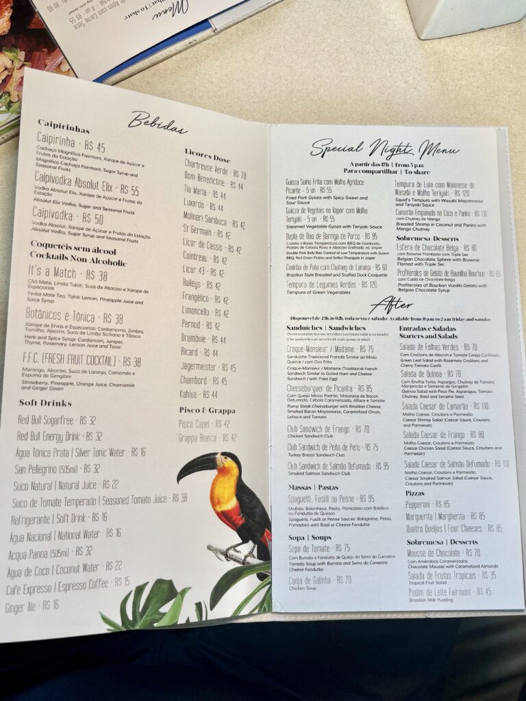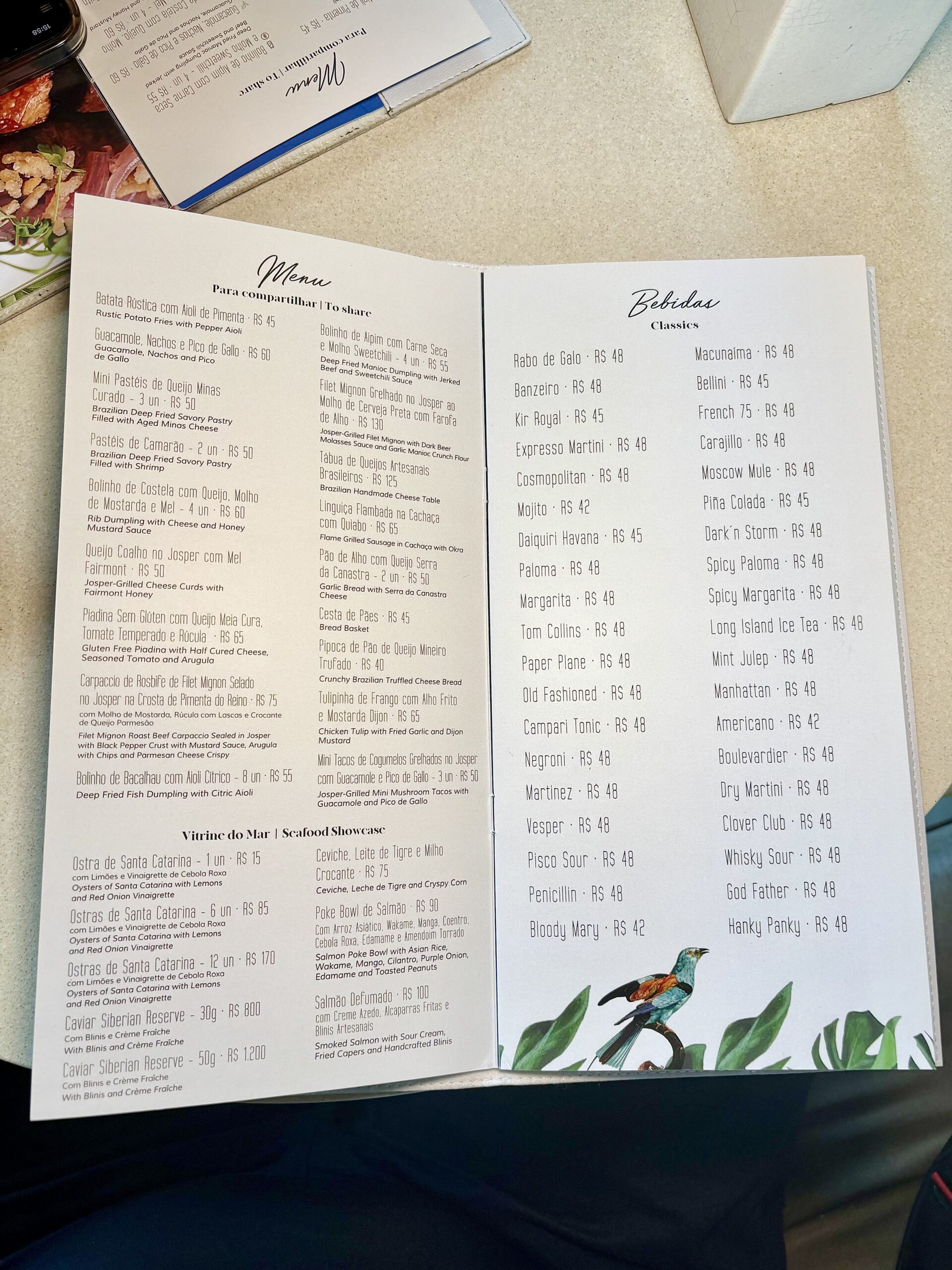 La carta de comida del bar ofrecía 18 platillos entre “bolinhos”, tapas, panes, tacos, etc., pero lo mejor estaba en las 8 propuestas de mar, entre Ostras (3), Caviar (2), Salmón (2) y un Ceviche.