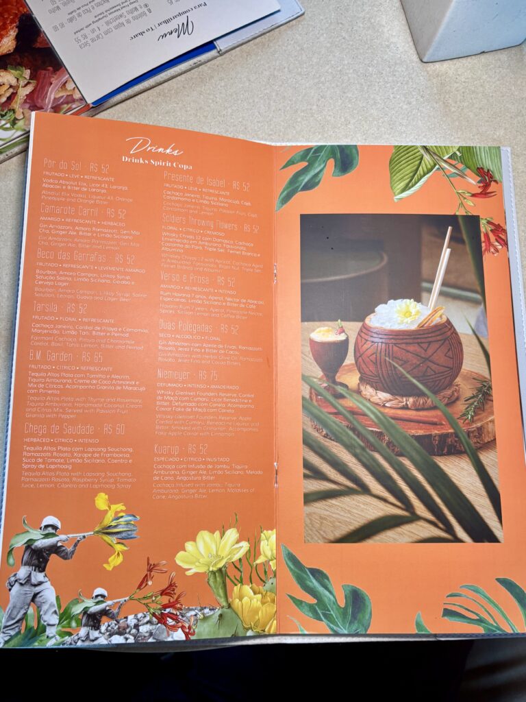 – “PRESENTE DE ISABEL” (55 R$- 10u$s) es el cocktail signature y fue el que elegimos probar.Lleva Cachaça “Janeiro”, tiquira (destilado artesanal del N.E. del país), maracuyá, cajá (fruta del N.E. del país), cardamomo y limónsiciliano. Clarificado con leche y carbonatado, servido en copa flauta. Era ligero, algo frutal y parecía un espumante con cachaça, cumpliendo sin deslumbrar.
