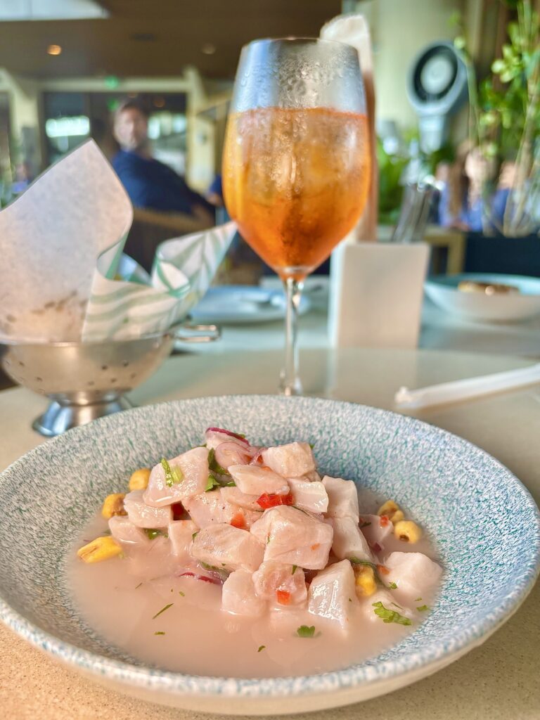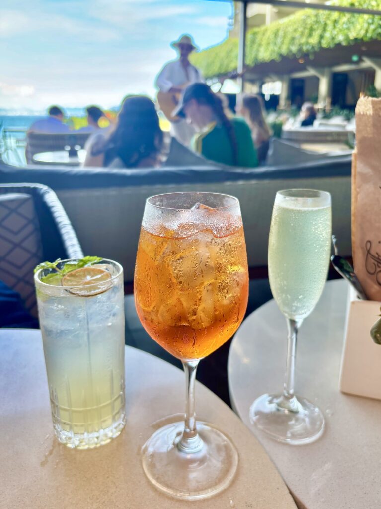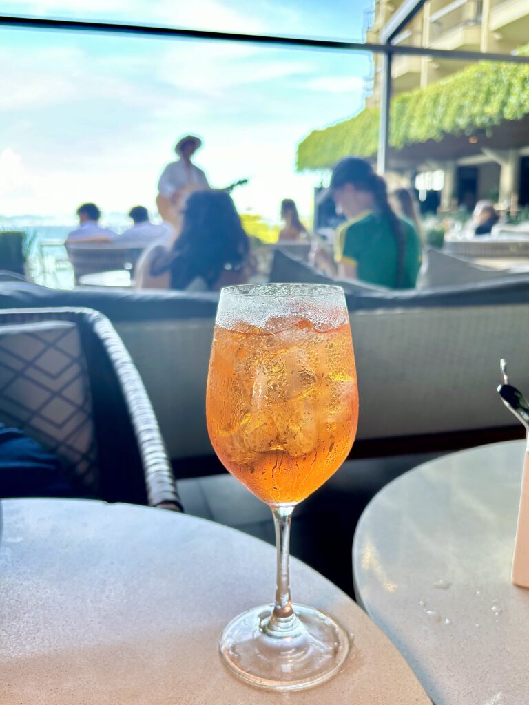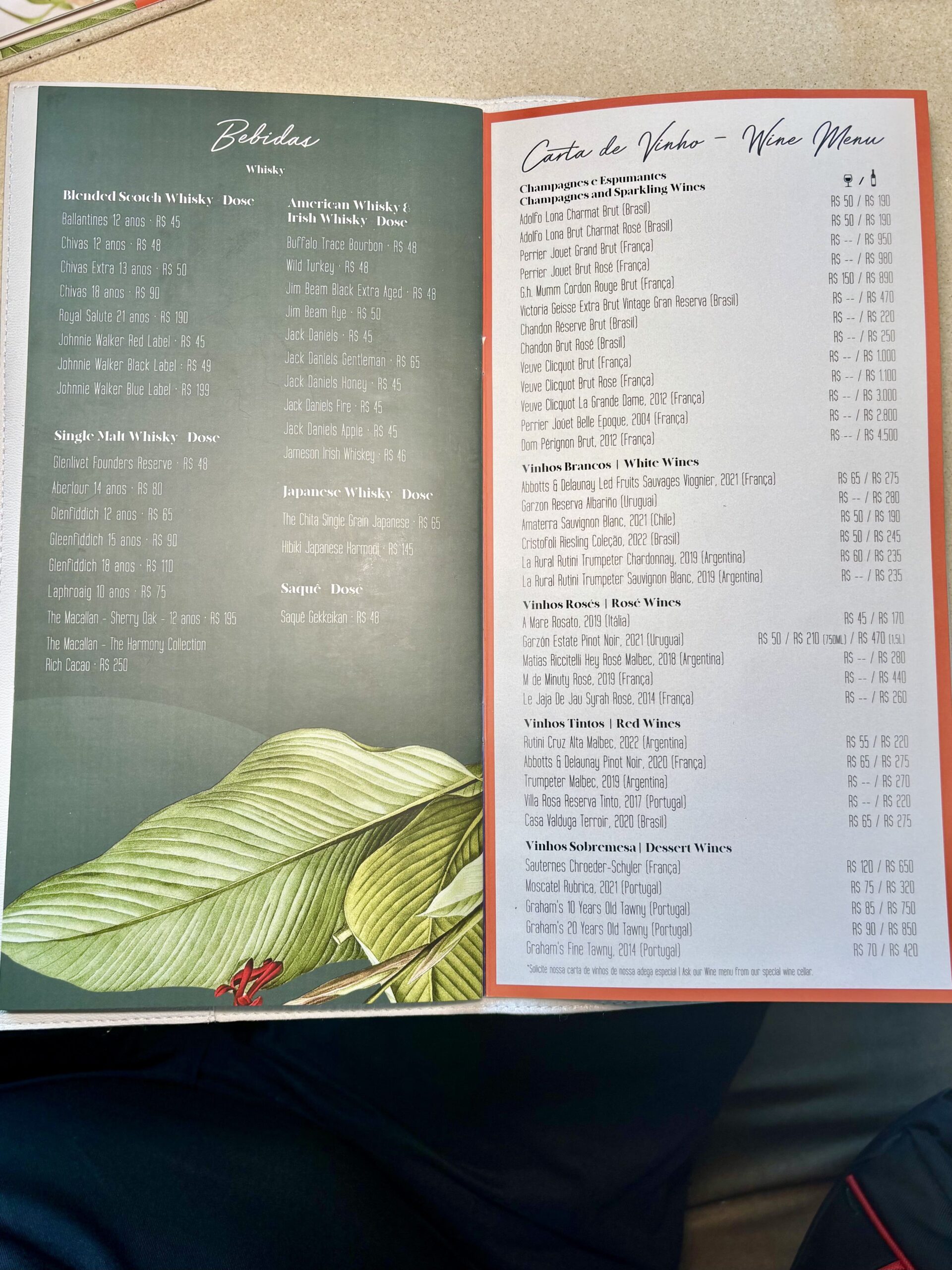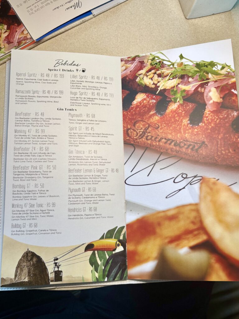 – APEROL SPRITZ (48 R$- 9u$s) era inevitable en un sunset de tanta belleza. Estaba en la sección de 4 “Spritz & Drinks”, todos ofrecidos en jarra también (199 R$- 37u$s).
