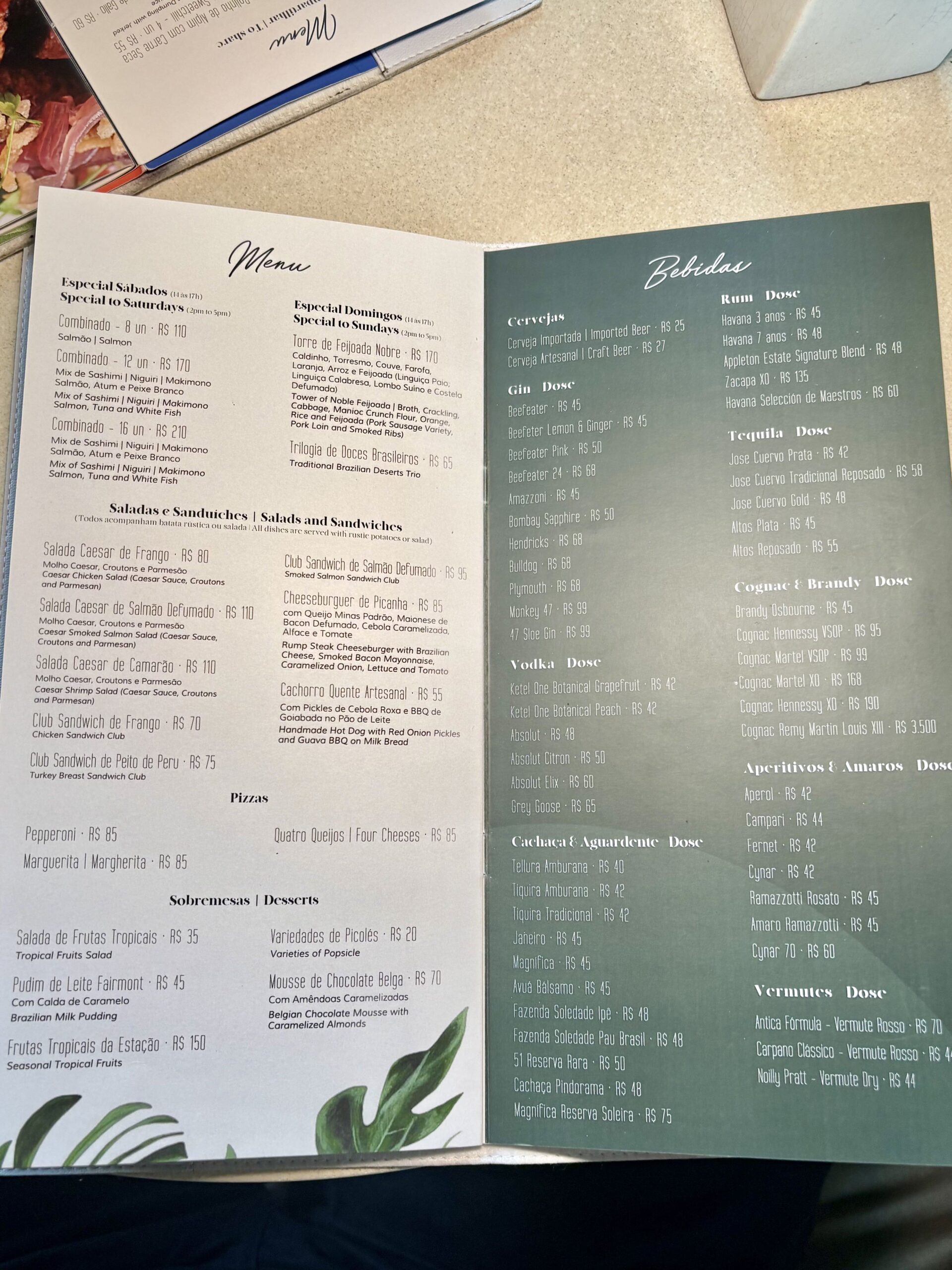 El resto de secciones era: “Caipirinhas” (3); “Clásicos” (con exagerados 38); y “Gin Tonics” (13, con marcas distintas de gins, y c/u con frutas y combinaciones creadas por Cassiano), con precios entre 48 y 99 R$ (9-18 u$s).