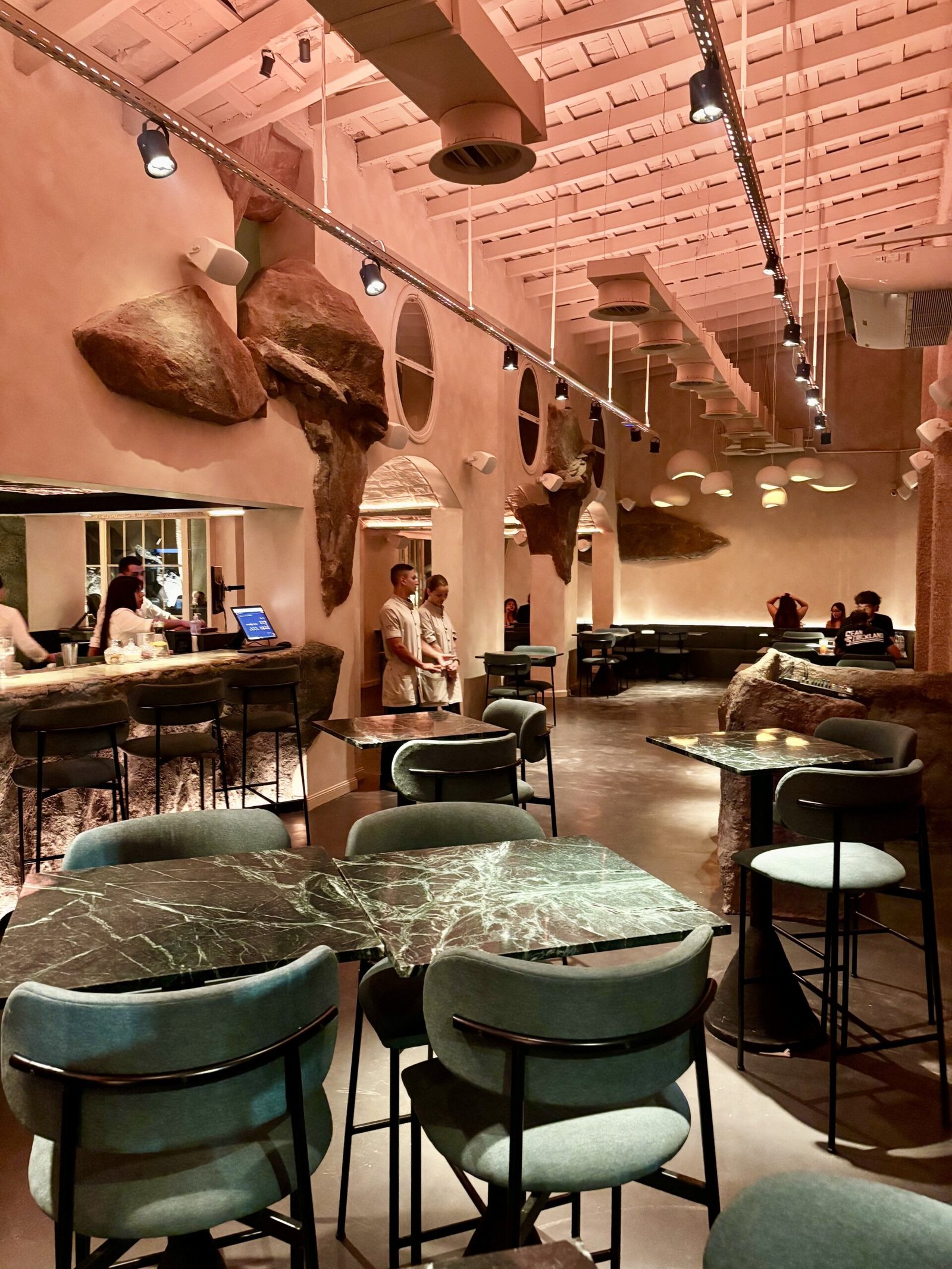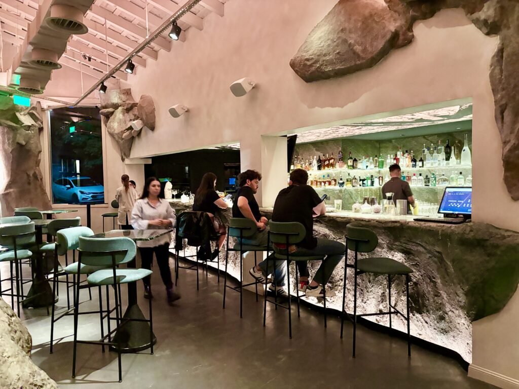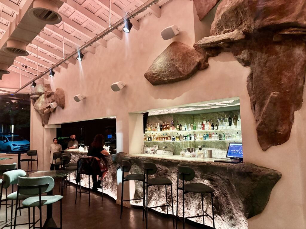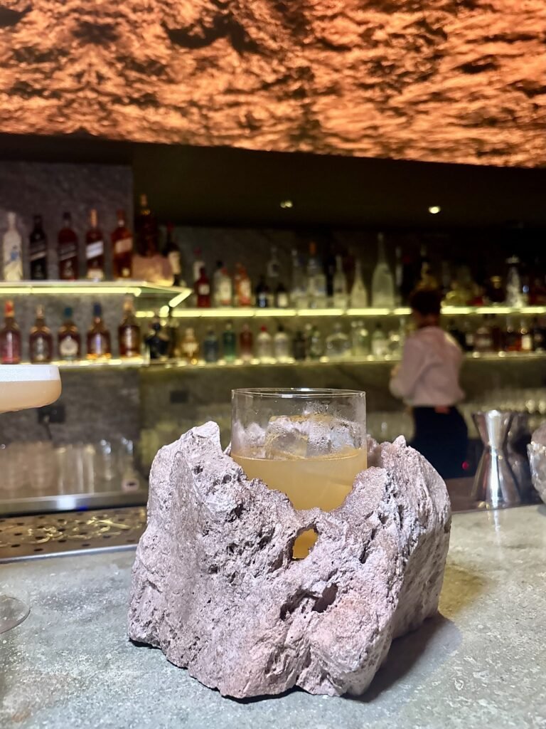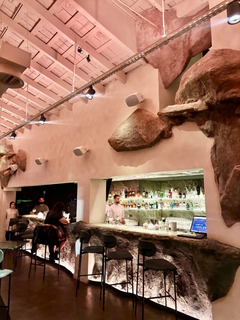 La idea rectora de Bradley es clara: el Mediterráneo como experiencia sensorial. Y esa traducción se construye desde la materia. La piedra domina la escena: barra tallada como roca, superficies irregulares, iluminación baja y una clara sensación de cueva.
