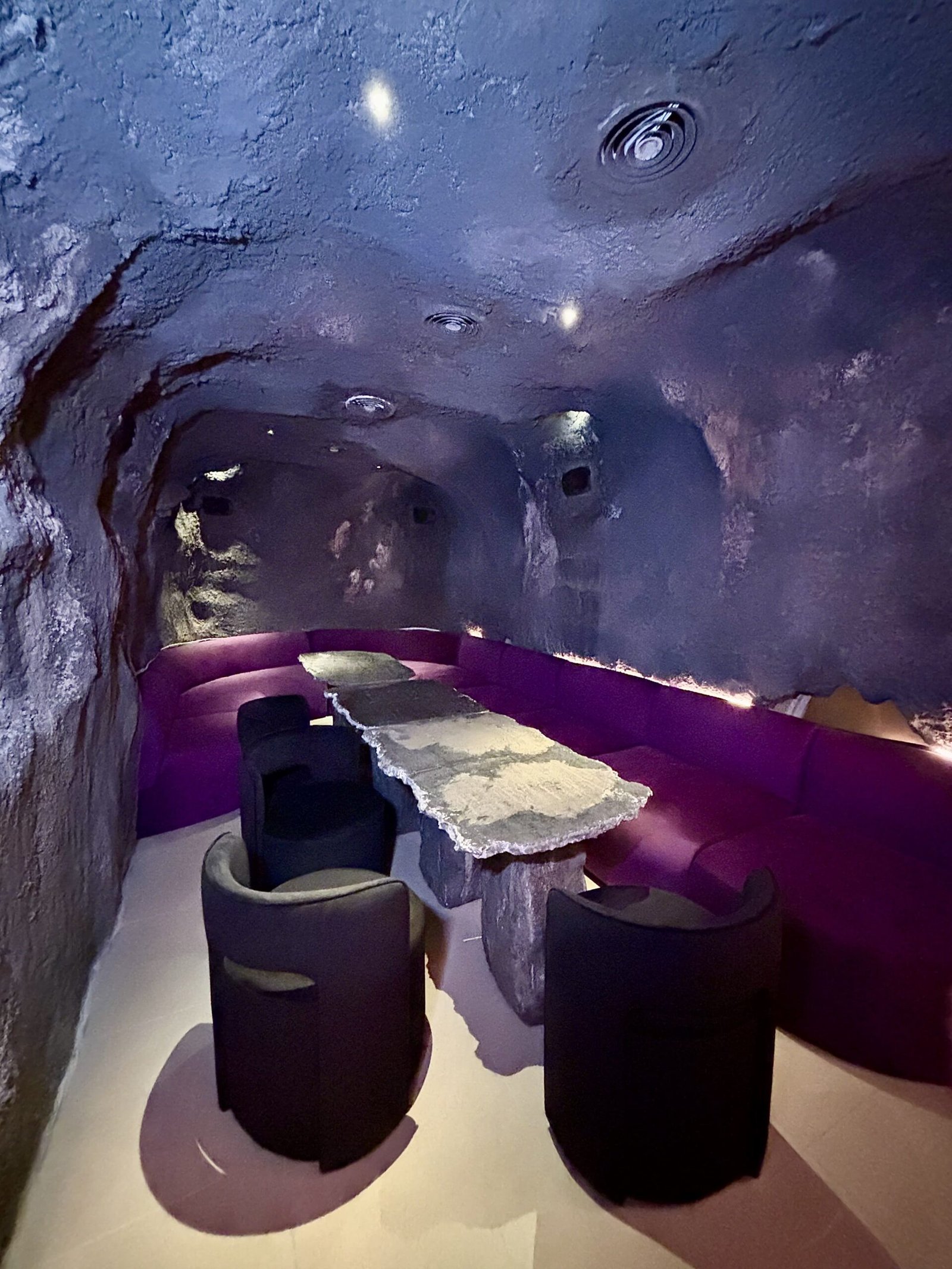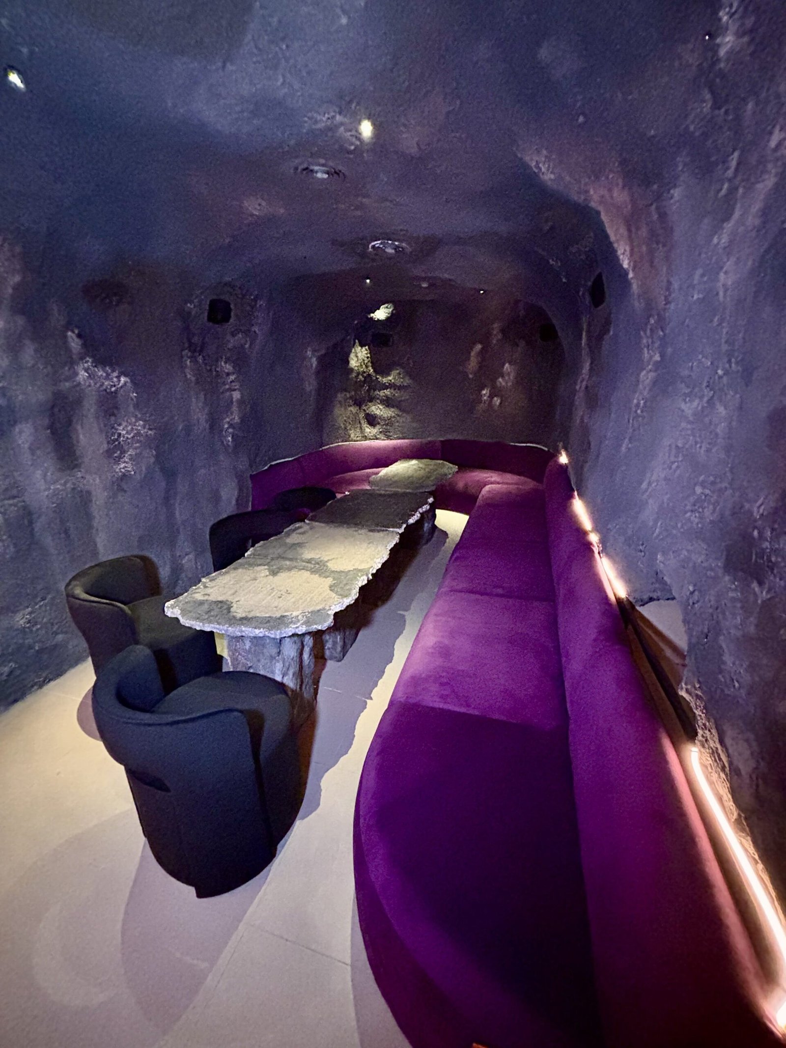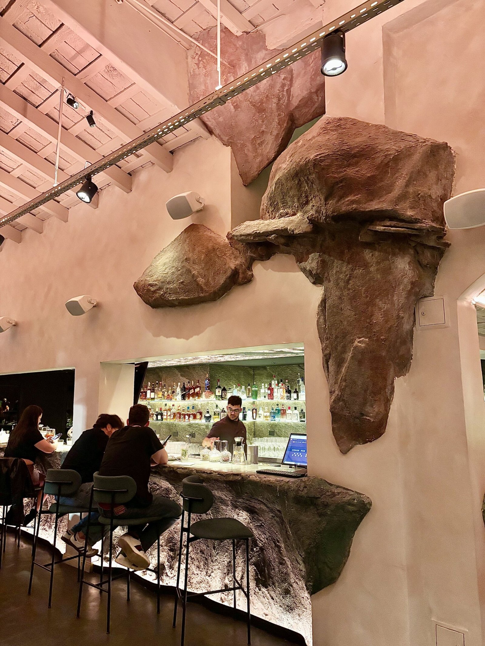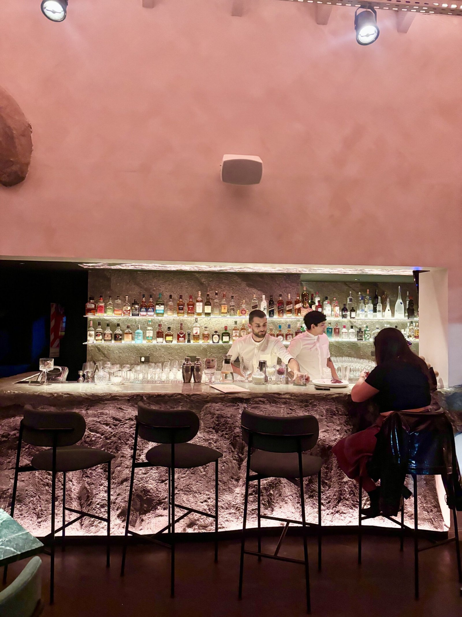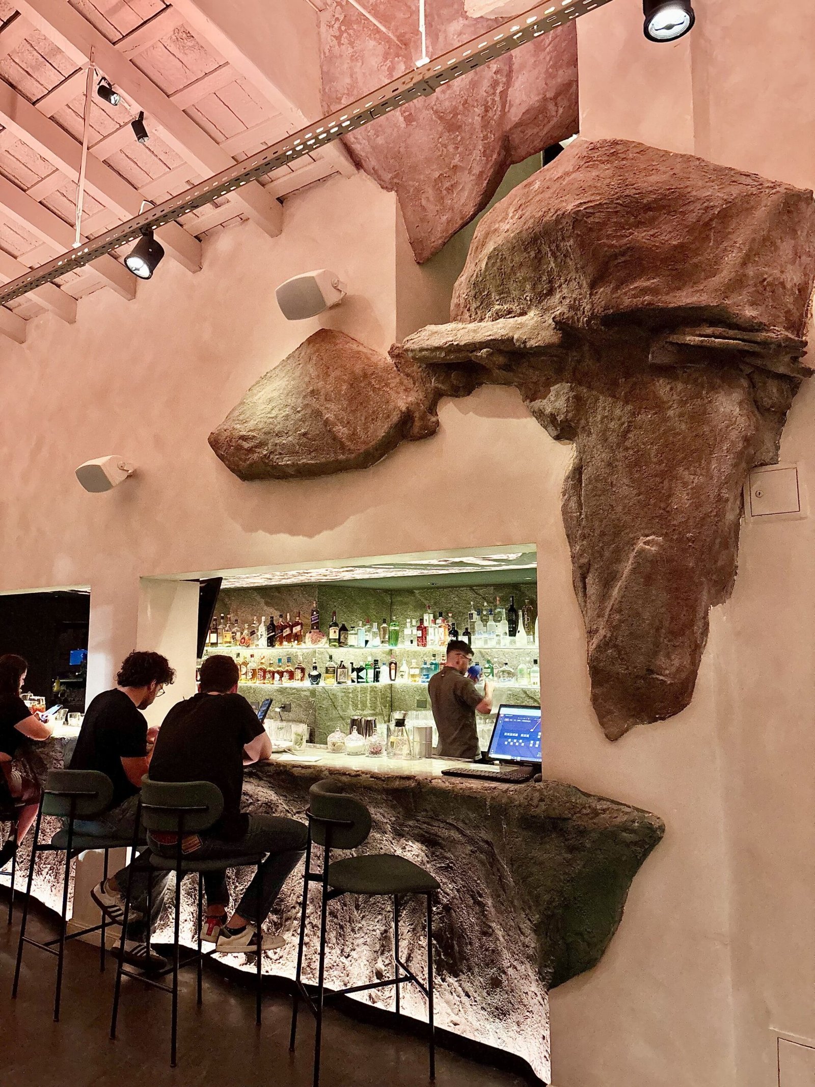 La idea rectora de Bradley es clara: el Mediterráneo como experiencia sensorial. Y esa traducción se construye desde la materia. La piedra domina la escena: barra tallada como roca, superficies irregulares, iluminación baja y una clara sensación de cueva.
