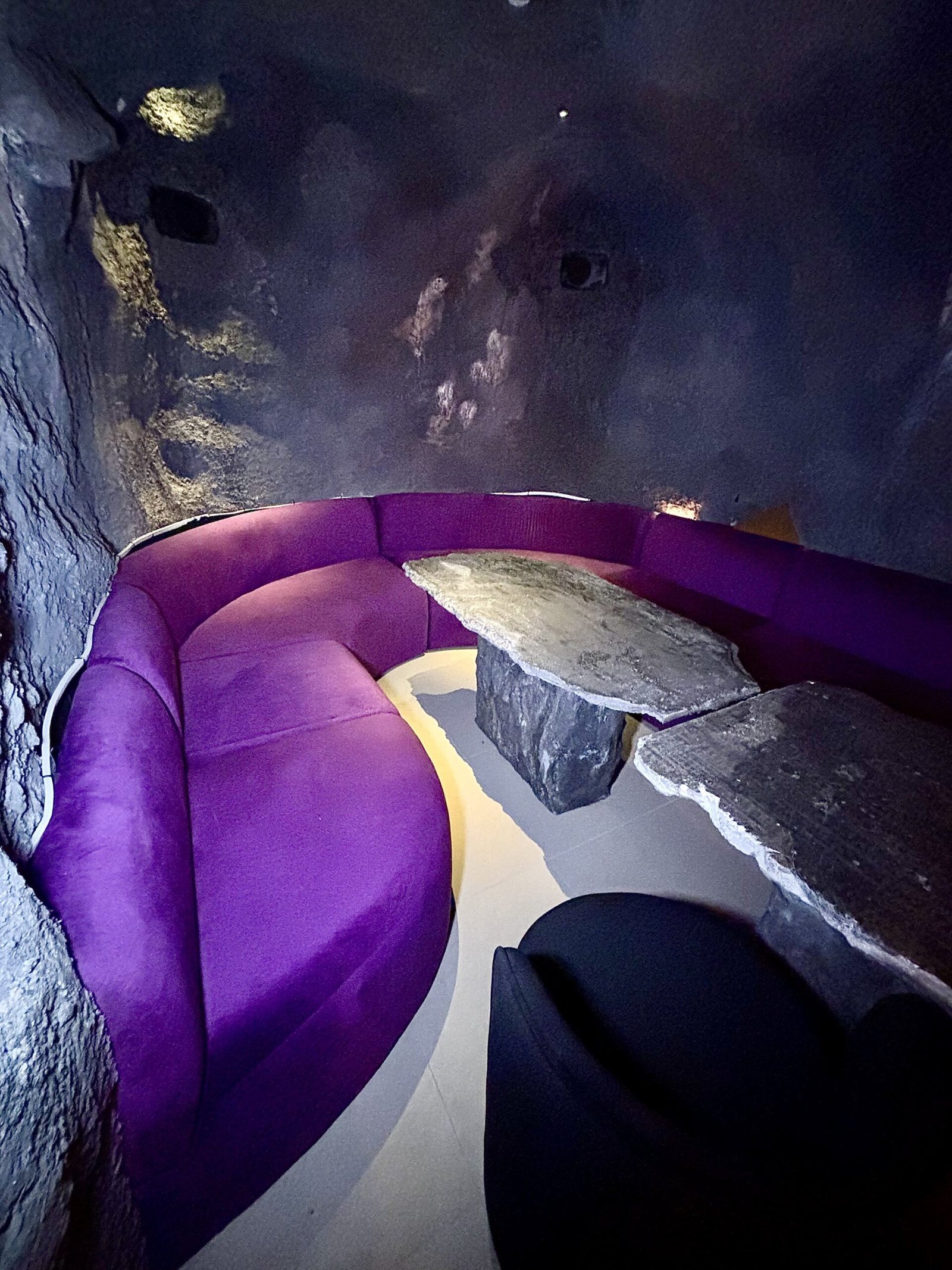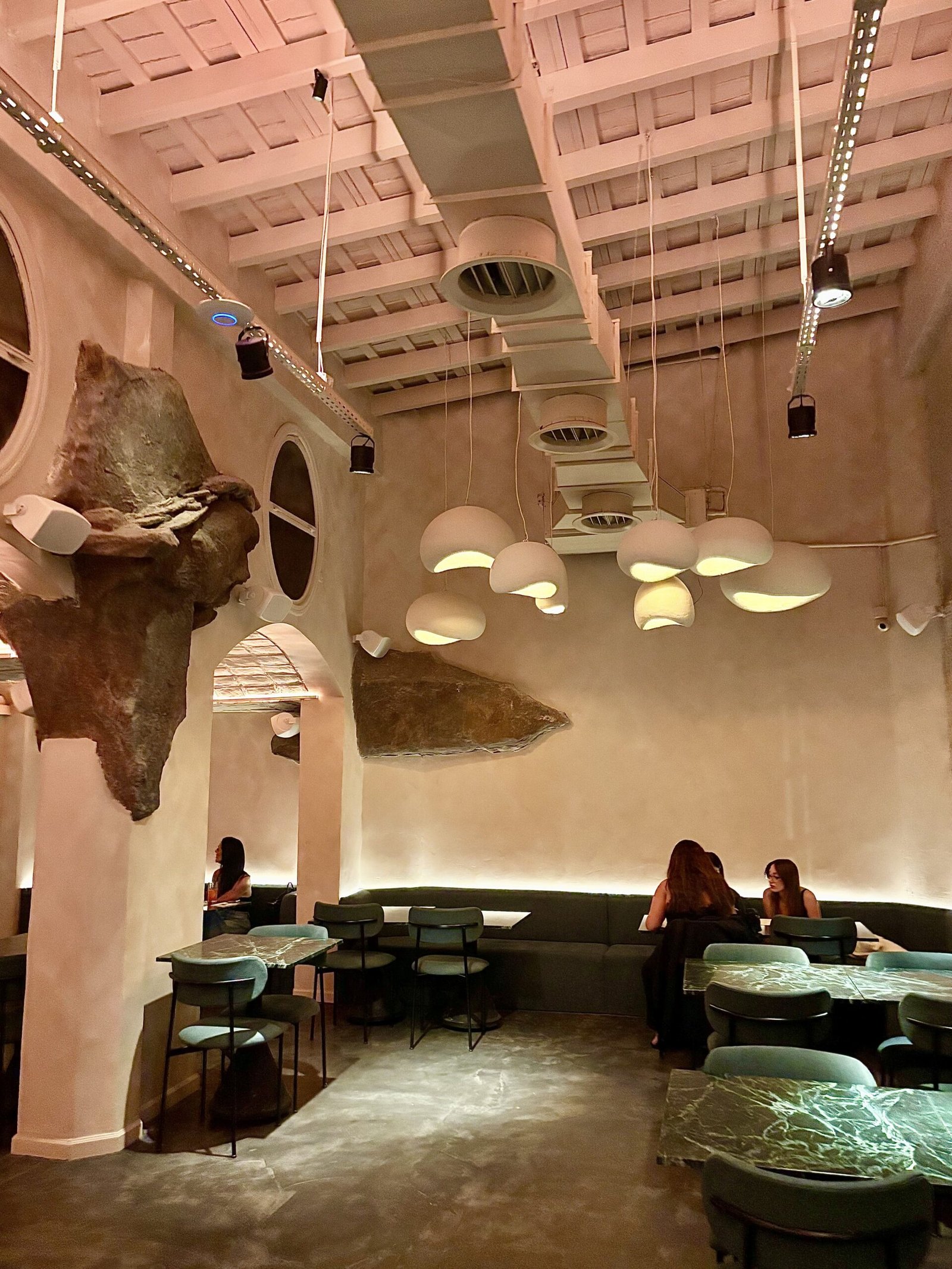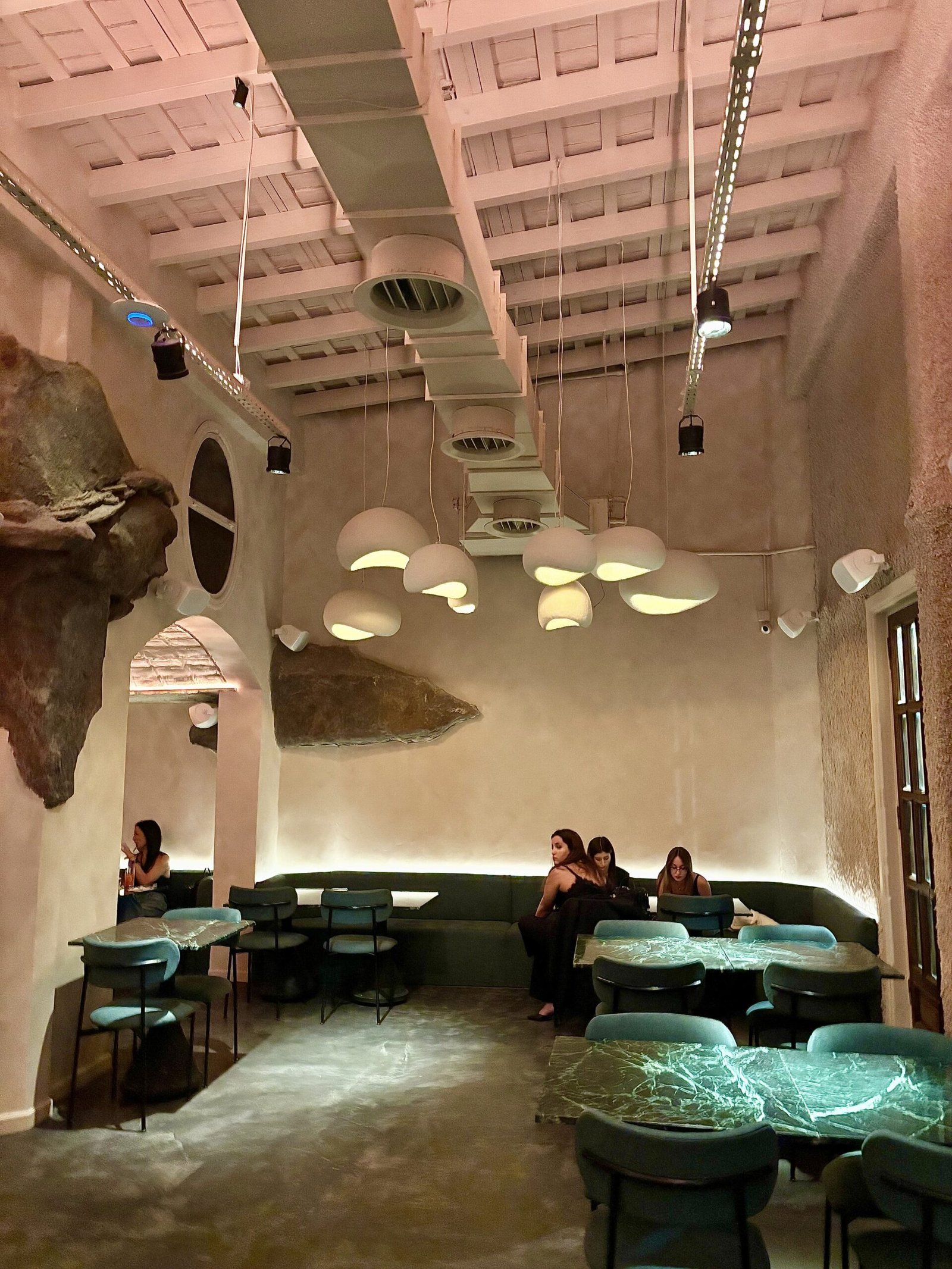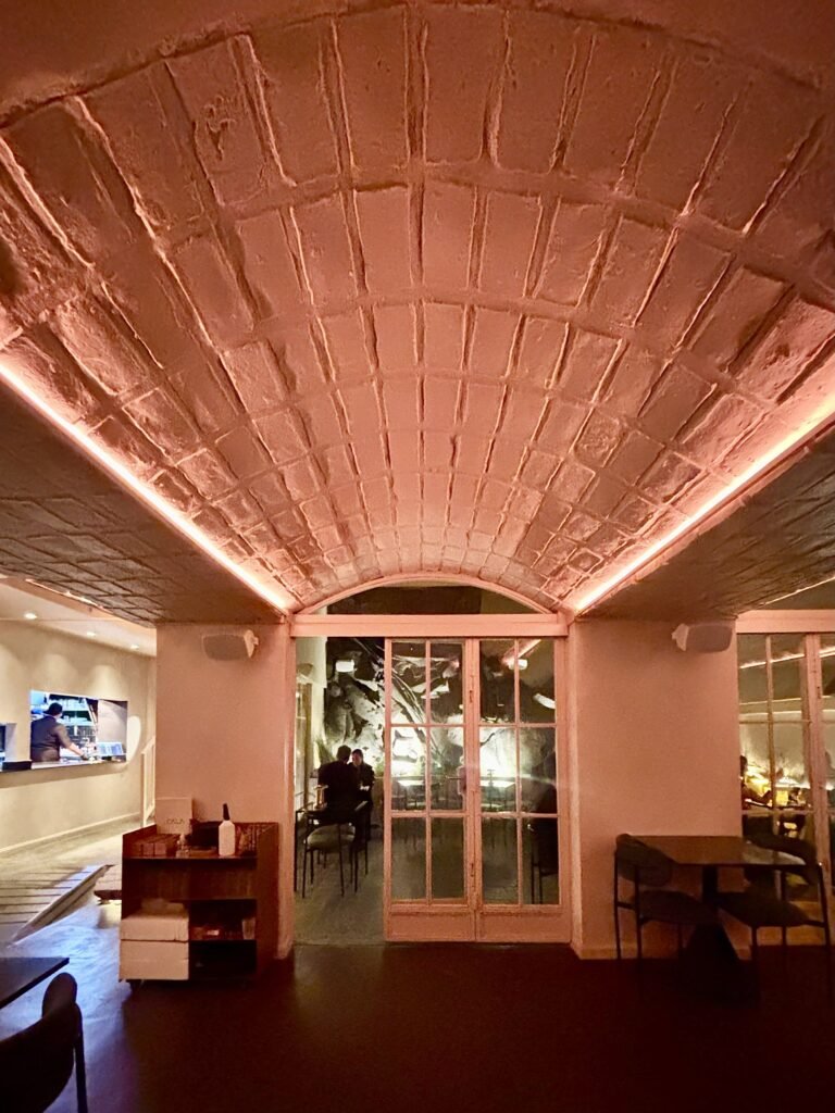 La idea rectora de Bradley es clara: el Mediterráneo como experiencia sensorial. Y esa traducción se construye desde la materia. La piedra domina la escena: barra tallada como roca, superficies irregulares, iluminación baja y una clara sensación de cueva.
