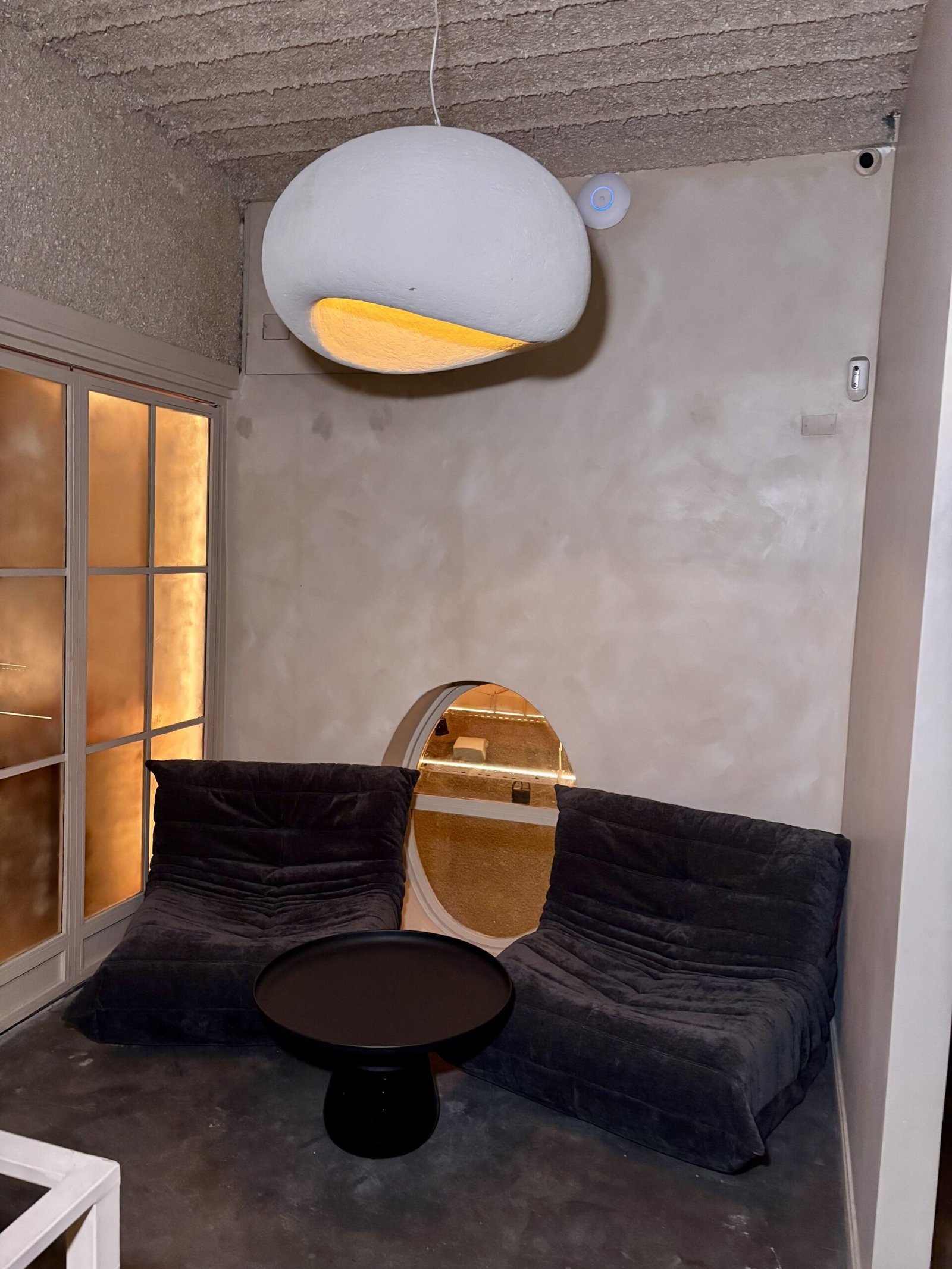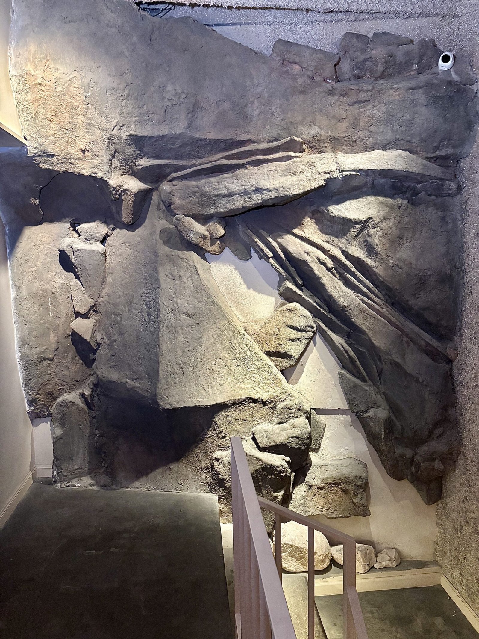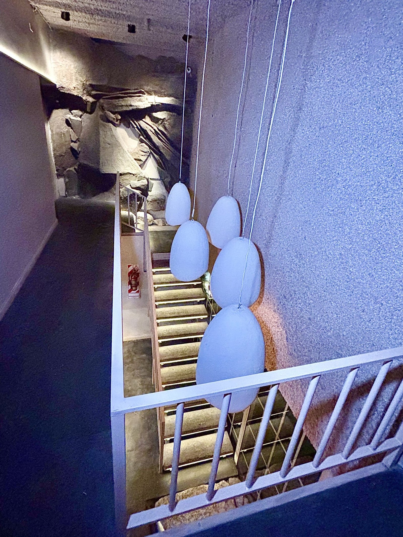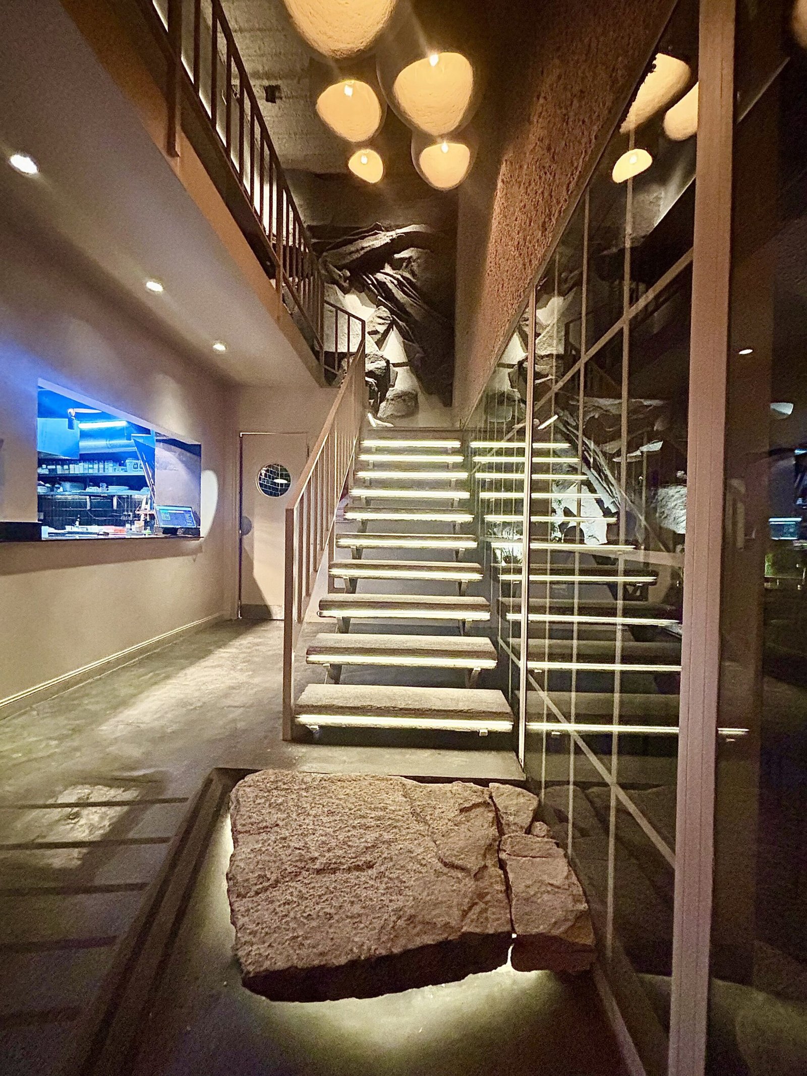 En la planta superior con otra obra de arte en el descanso de escalera, cuentan con una “caverna” privada para eventos particulares y catas, para unas 12 personas sentadas a una mesa comunitaria de laja. Que pudimos conocer a pocas horas de haberla terminado, sin estrenar.