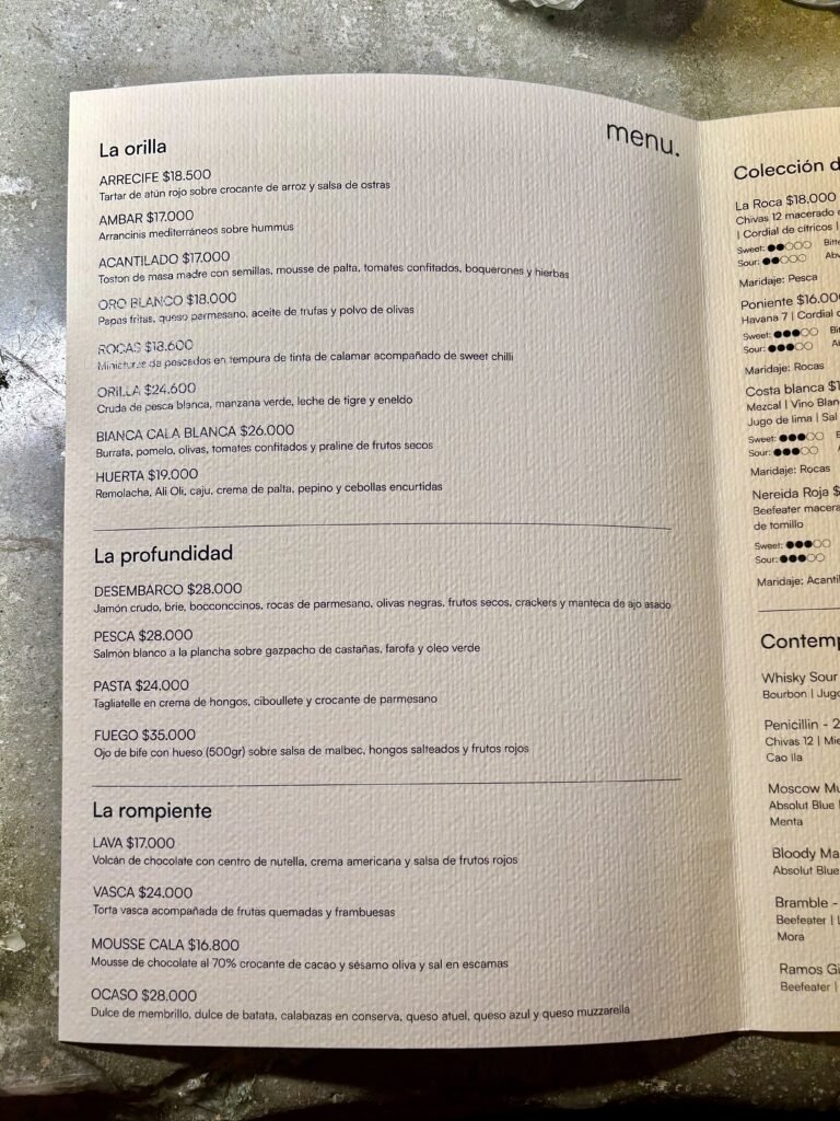 La carta en lugar de lo tan habitual de dividirse en Entradas, Principales y Postres, acá los nombres son LA ORILLA, LA PROFUNDIDAD y LA ROMPIENTE. La propuesta a cargo del chef ejecutivo Gastón, sorprende tanto en producto como en presentación, con una vajilla que refuerza el concepto en cada plato.