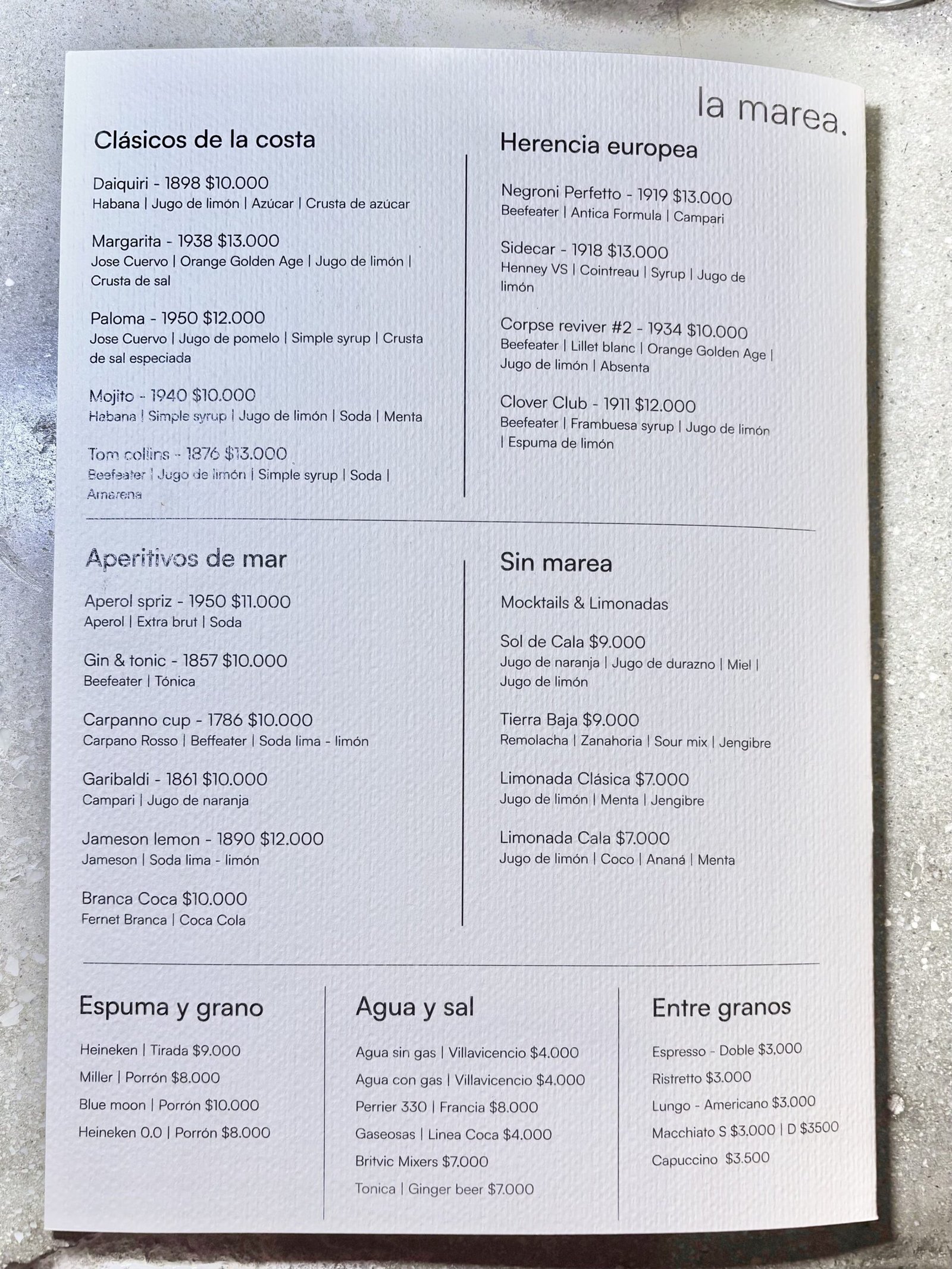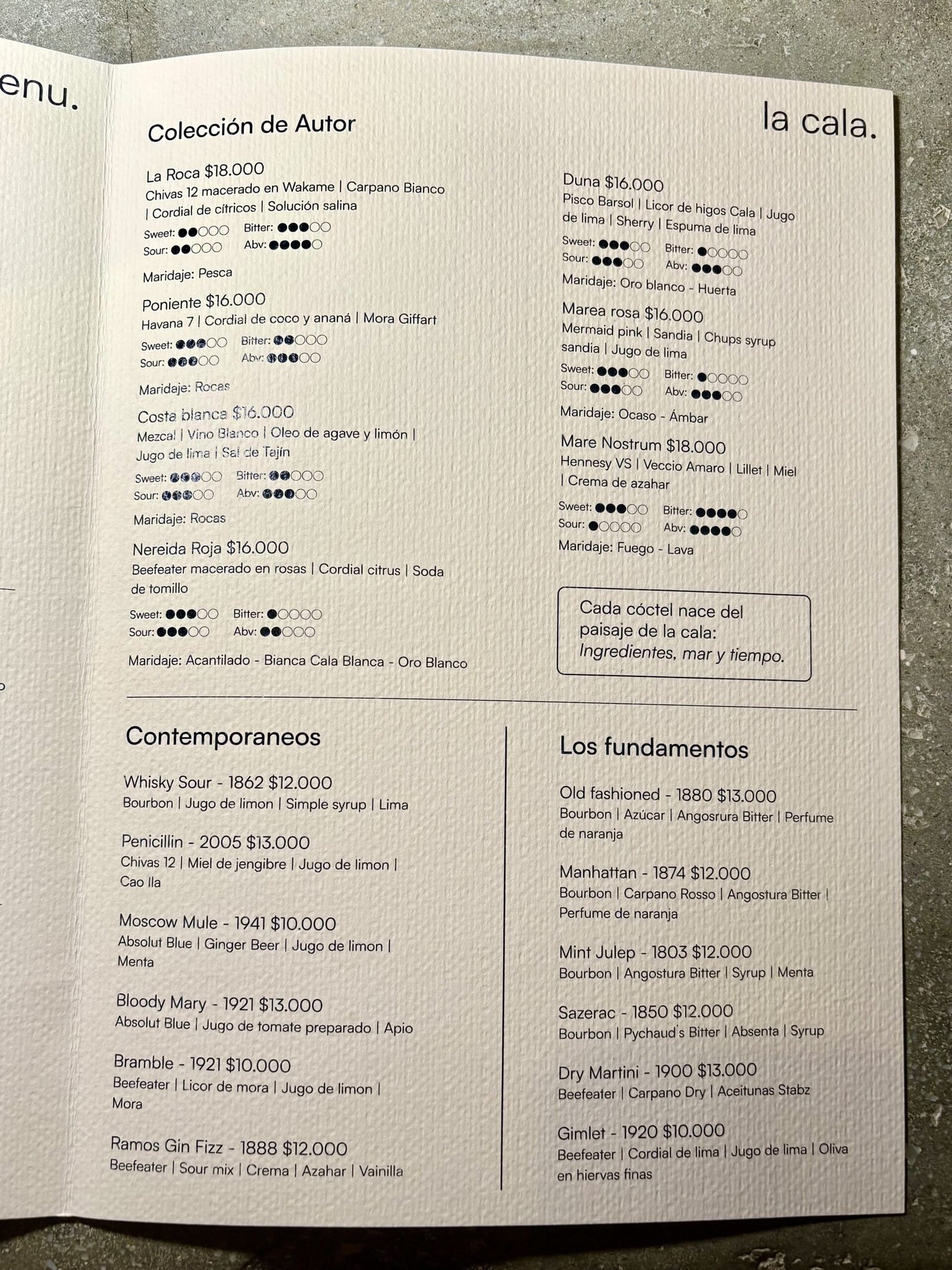 La carta se centra en una COLECCIÓN DE AUTOR de 7 cócteles, pero con 6 secciones de Clásicos, divididos en: Contemporáneos (6 opciones), Los fundamentos (6), Clásicos de la costa (5), Herencia europea (4), Aperitivos de Mar (6) y Sin mares (4 opciones sin alcohol). Lo peculiar, es que cada uno al lado lleva la (supuesta) fecha de creación, siendo el más antiguo el Mint Julep: 1803!