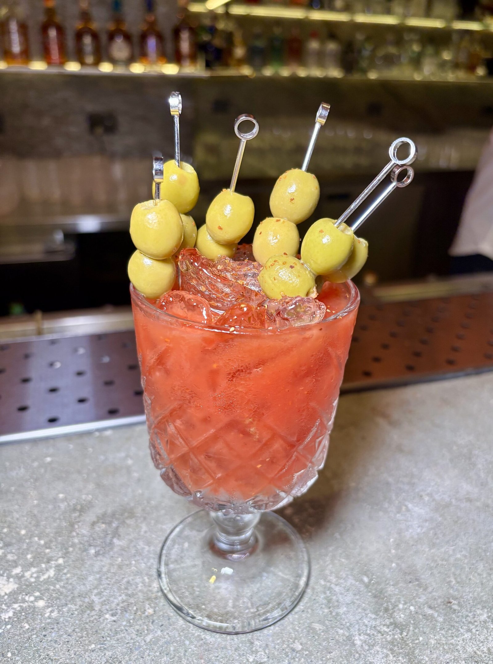 Antes incluso del primer trago, la experiencia arranca con una cortesía que funciona como bienvenida al universo Cala. Un “bloody mary” sin alcohol, de perfil vegetal, sobre el que se montan aceitunas de alta calidad en abundancia. Un bocado líquido-sólido que resume la idea mediterránea desde el inicio.
