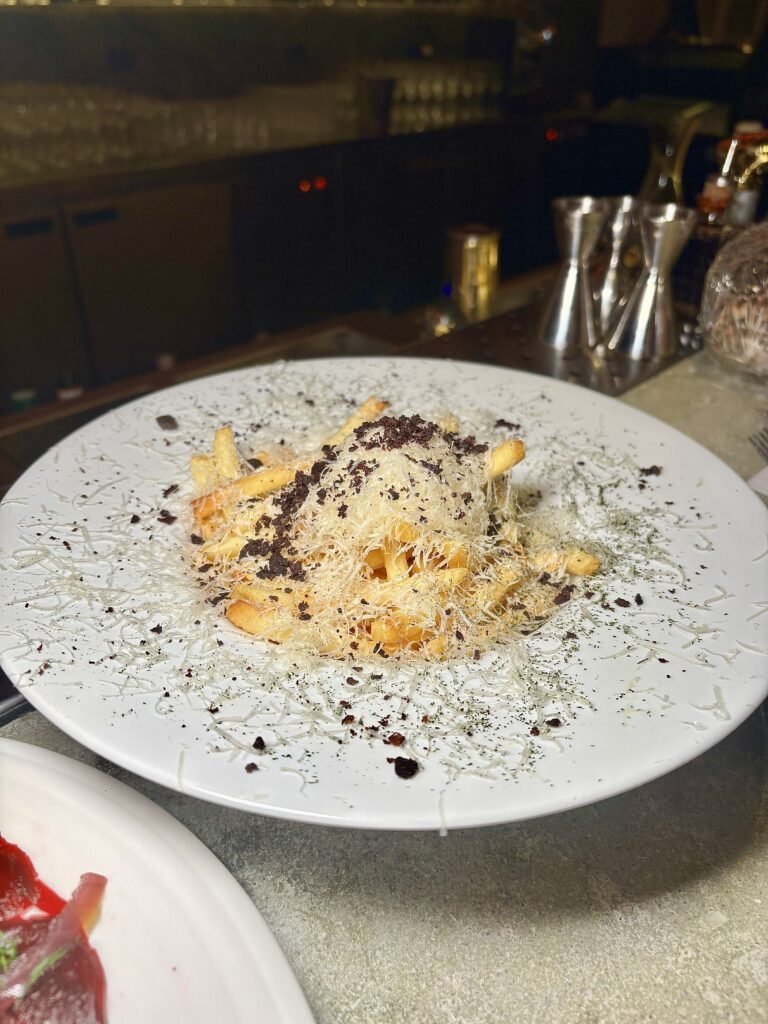 Papas fritas, queso parmesano, aceite de trufas y polvo de olivas.
