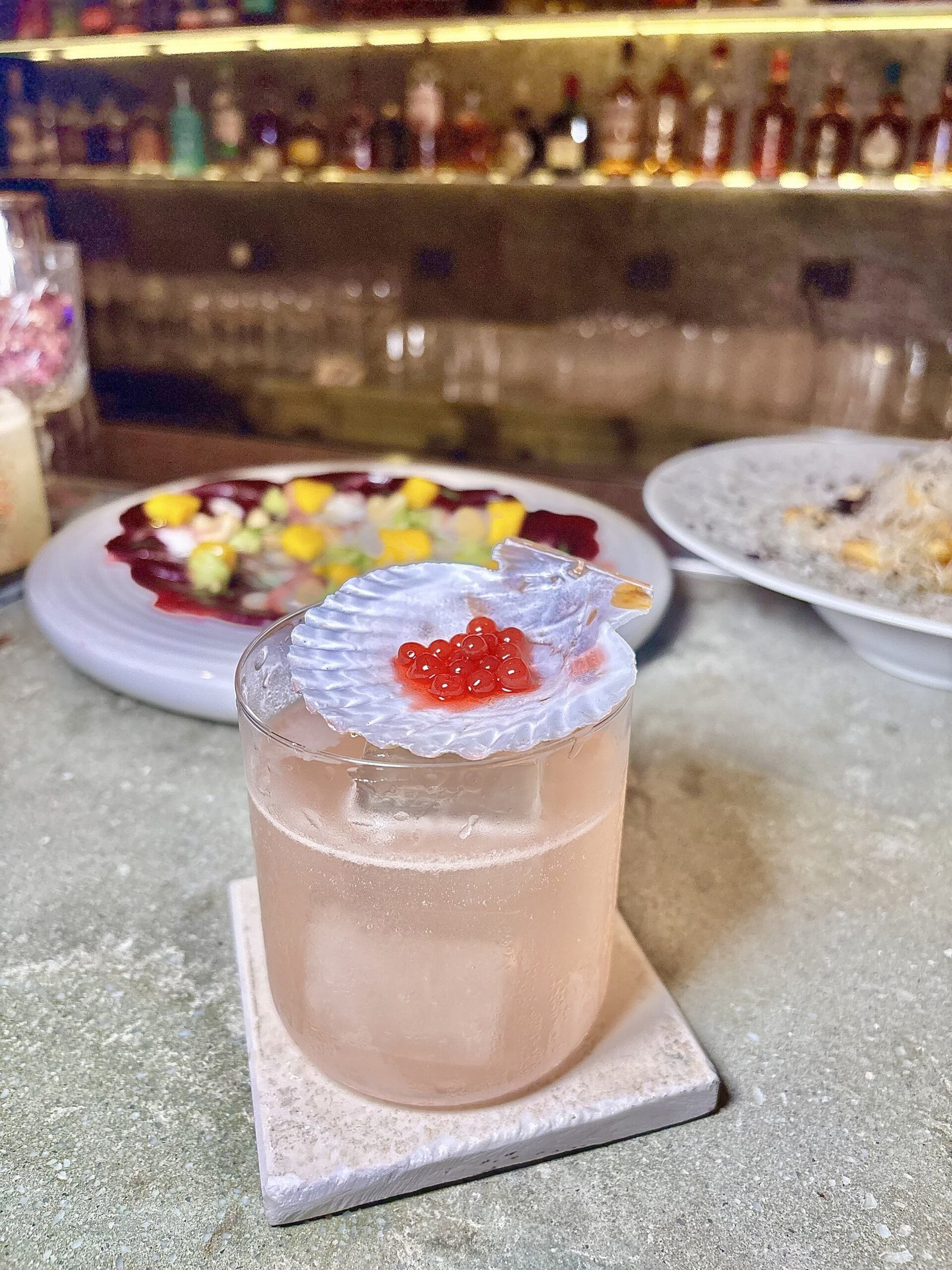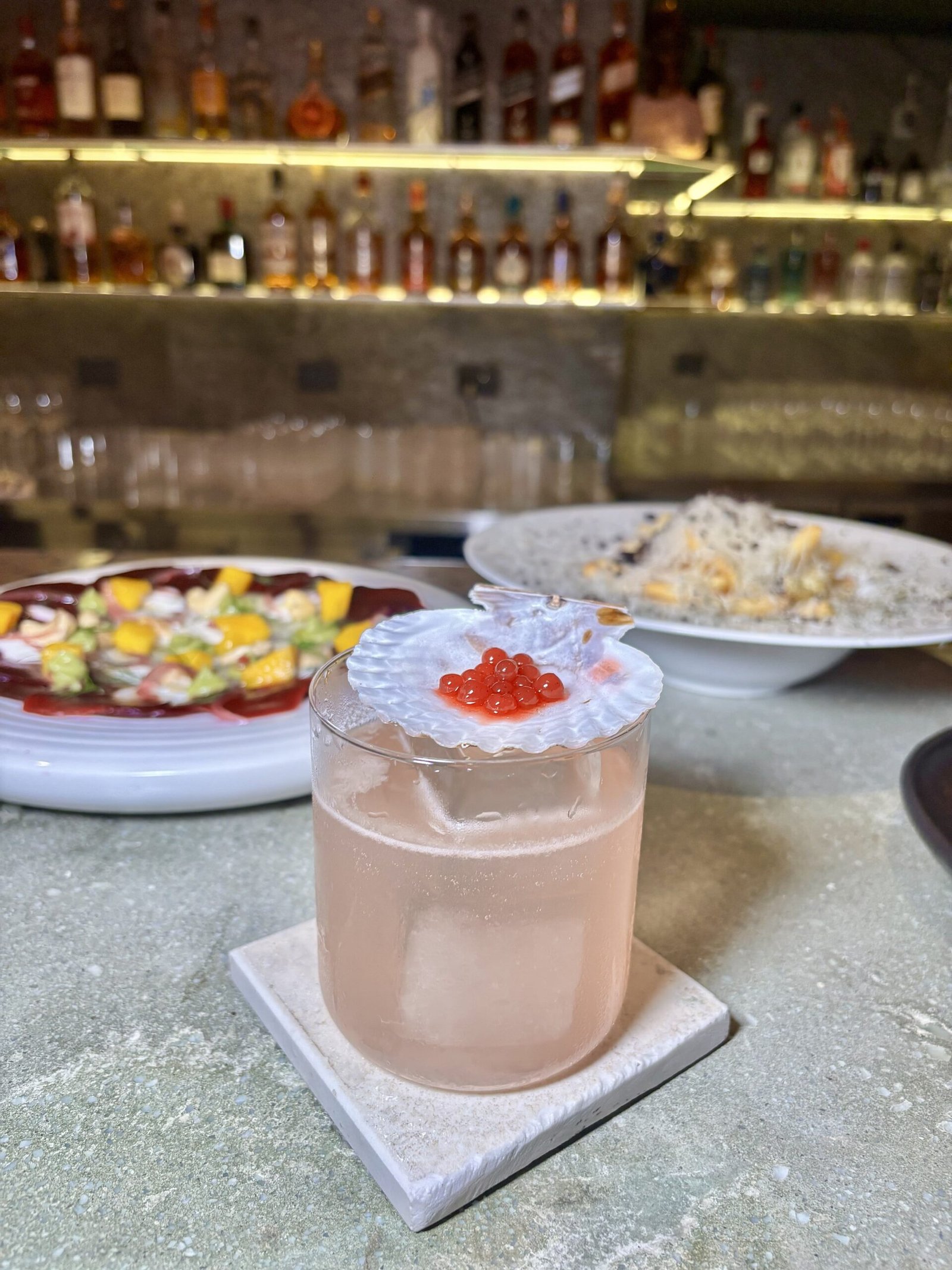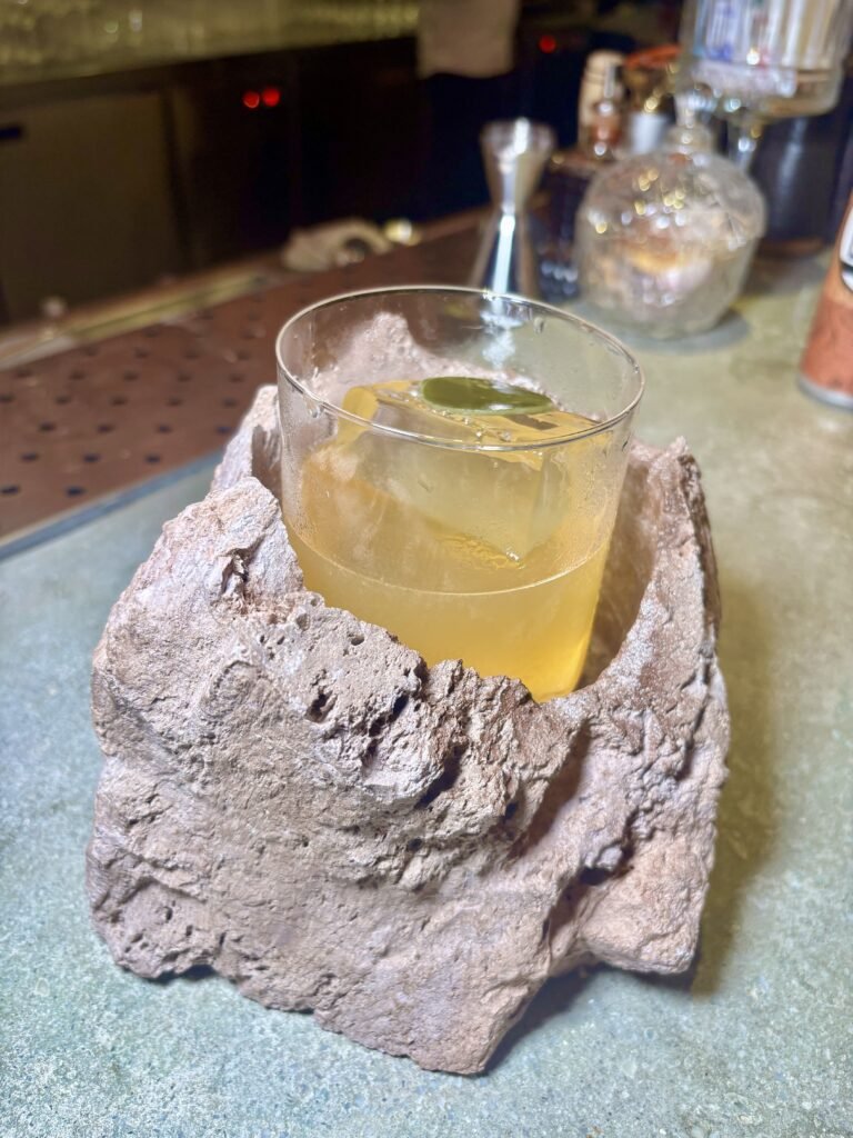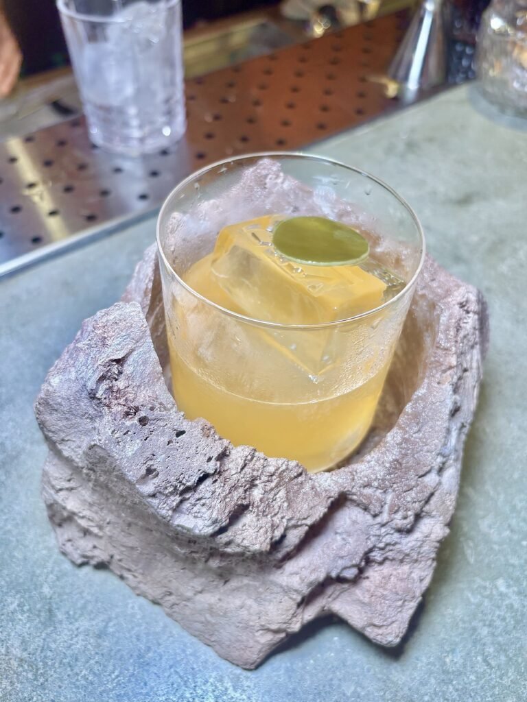 El cóctel insignia, conceptual y más caro del bar. Inspirado en un súper clásico Penicillin pero llevado hacia el mar, donde el wakame aporta salinidad y profundidad. La presentación en una base símil pedazo de roca, acompaña de forma directa el concepto del lugar —mineral, texturada, alineada con la estética de la barra— y el resultado en boca es preciso, balanceado y de gran nivel. “Representa todo Cala”, nos dijeron allí.