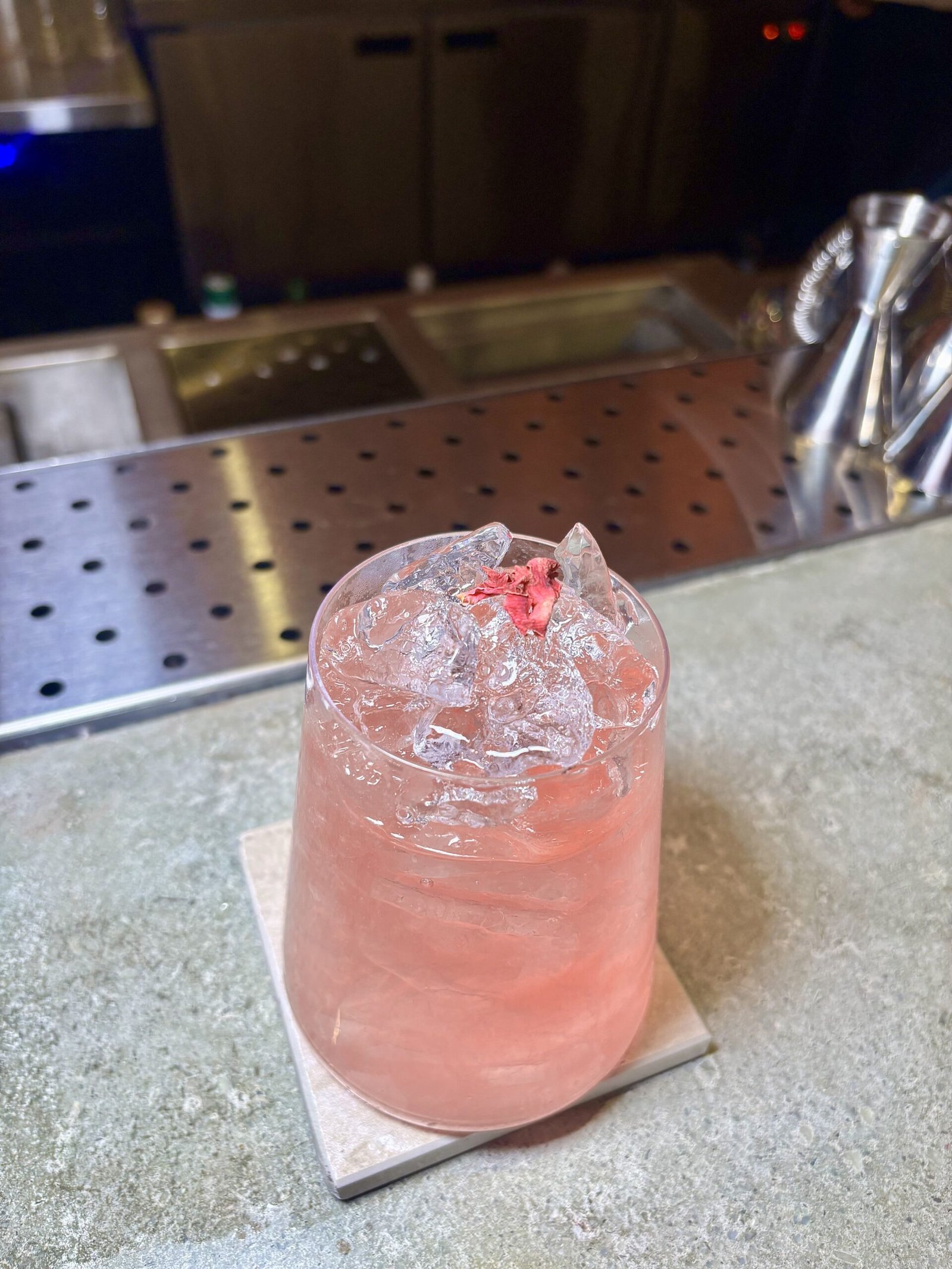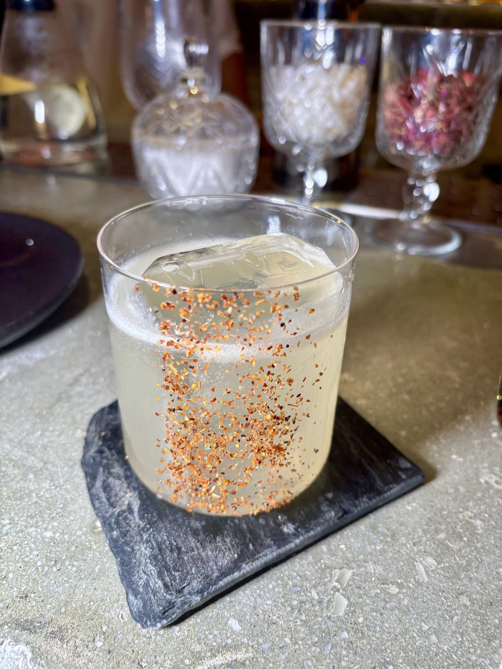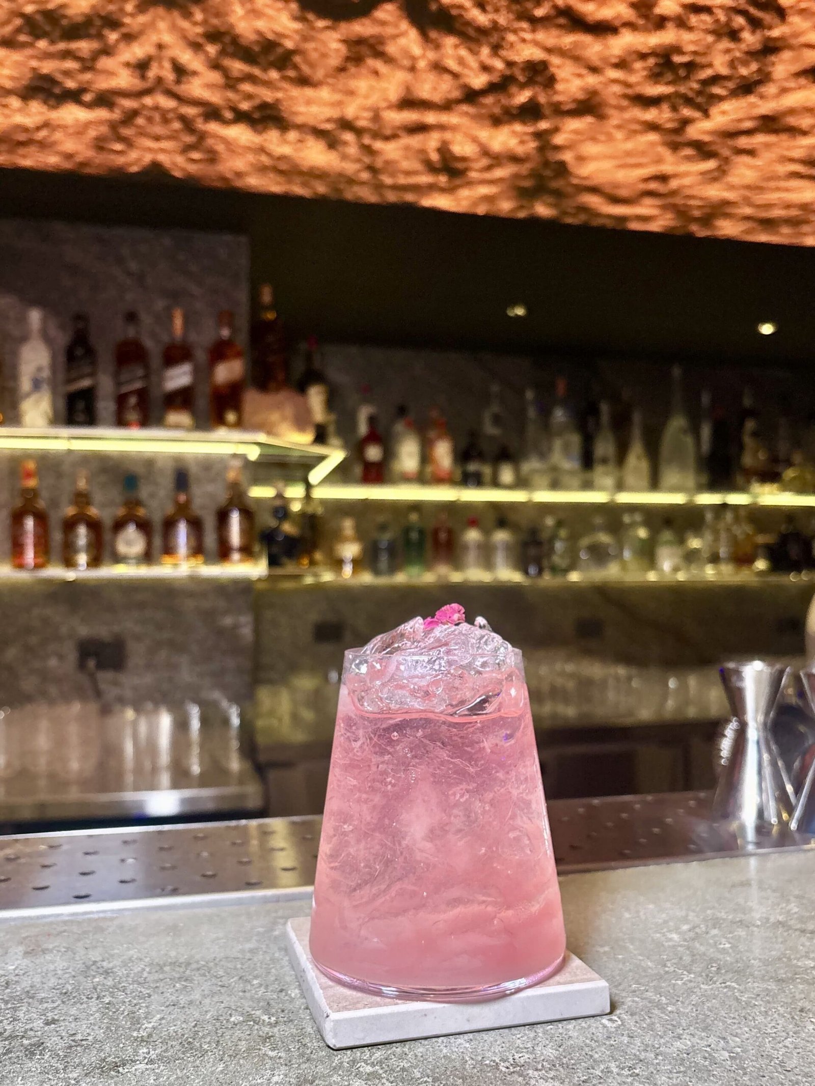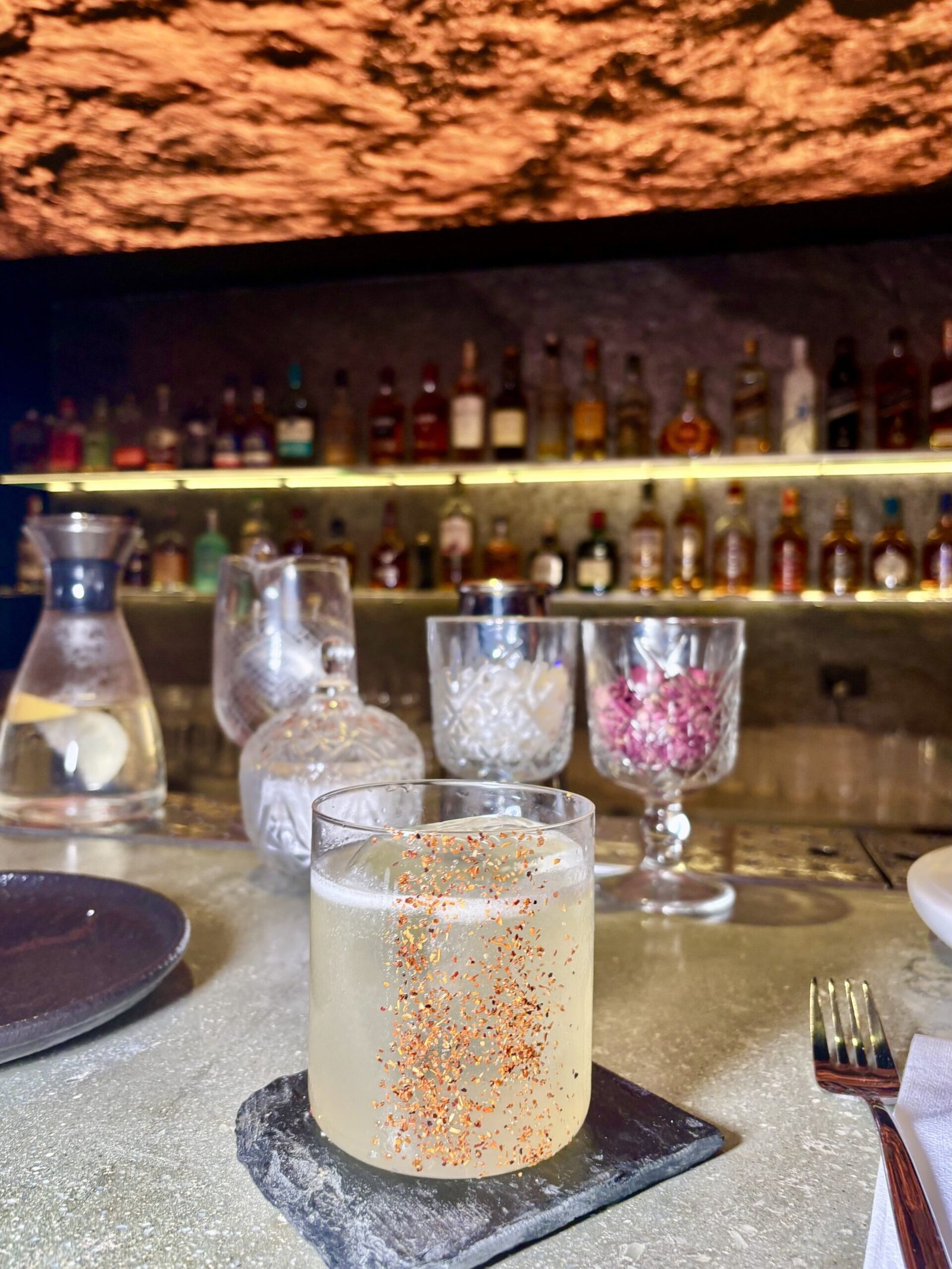 El cóctel insignia, conceptual y más caro del bar. Inspirado en un súper clásico Penicillin pero llevado hacia el mar, donde el wakame aporta salinidad y profundidad. La presentación en una base símil pedazo de roca, acompaña de forma directa el concepto del lugar —mineral, texturada, alineada con la estética de la barra— y el resultado en boca es preciso, balanceado y de gran nivel. “Representa todo Cala”, nos dijeron allí.