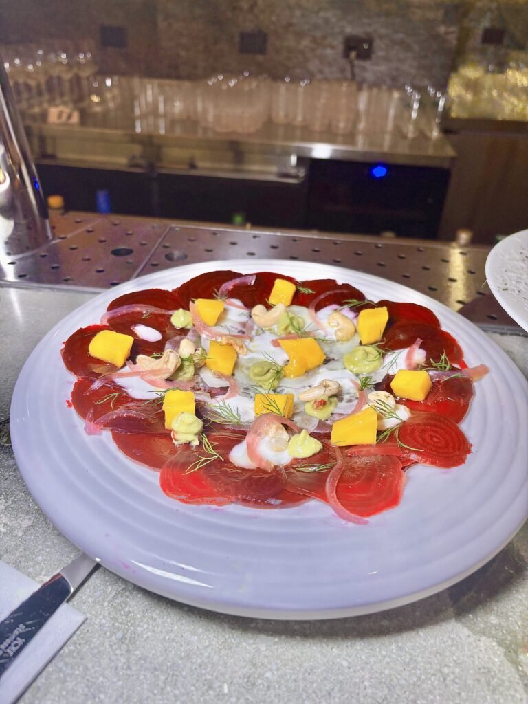 Un sorprendente carpaccio de remolachas, trabajado en distintas texturas y sabores, con un perfil vegetal fresco y capas bien integradas.