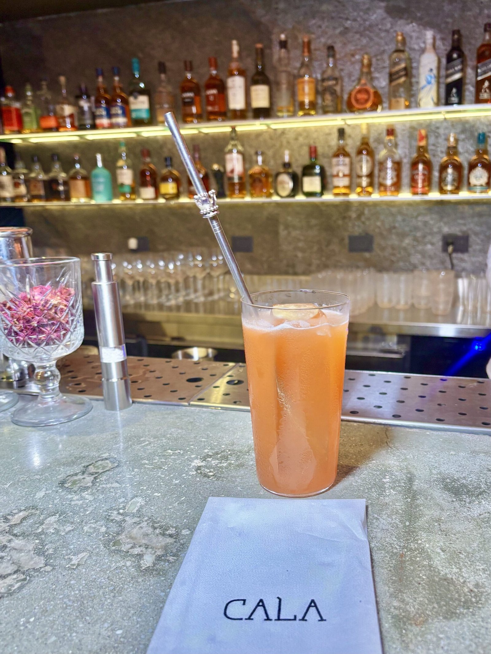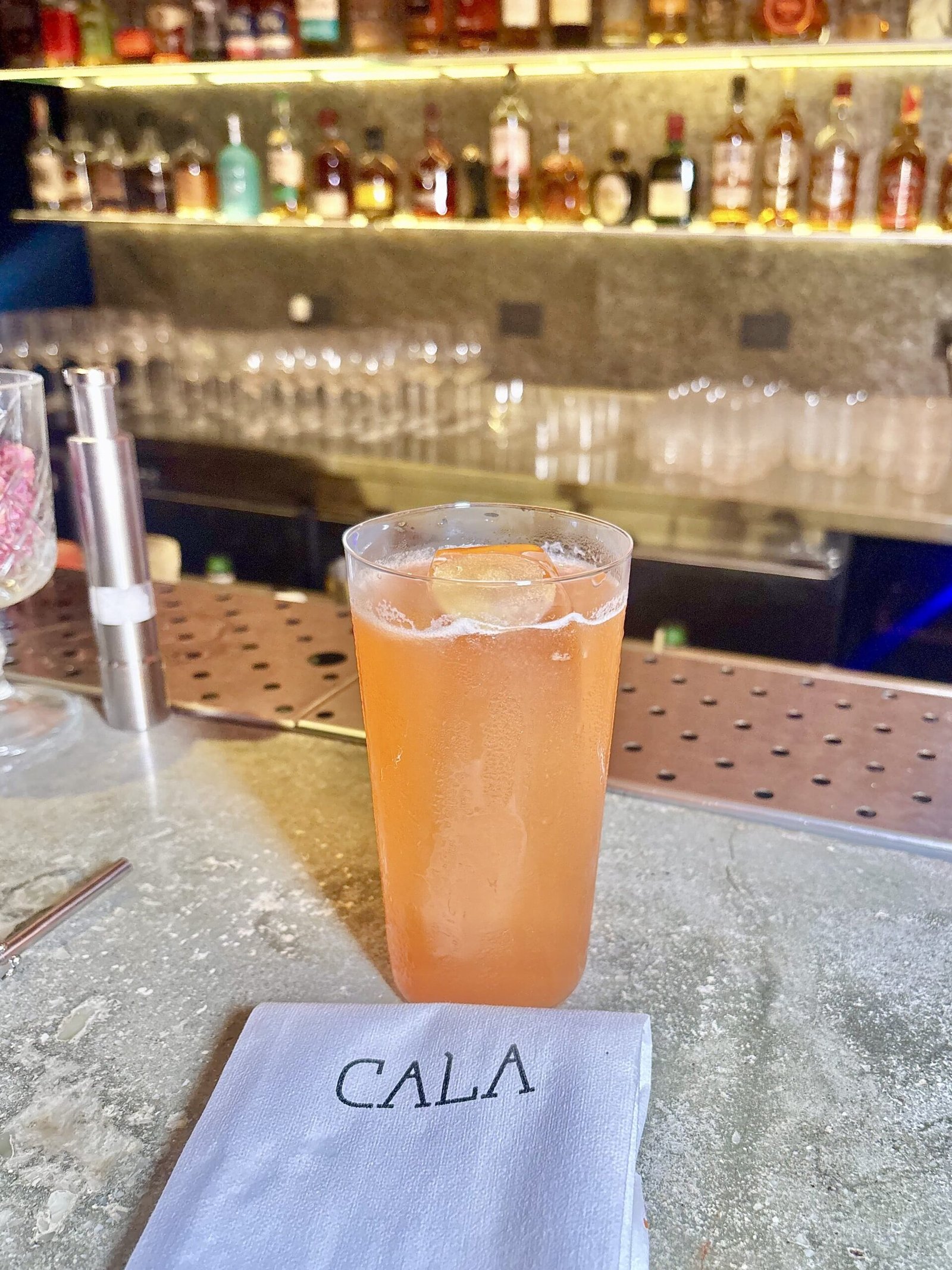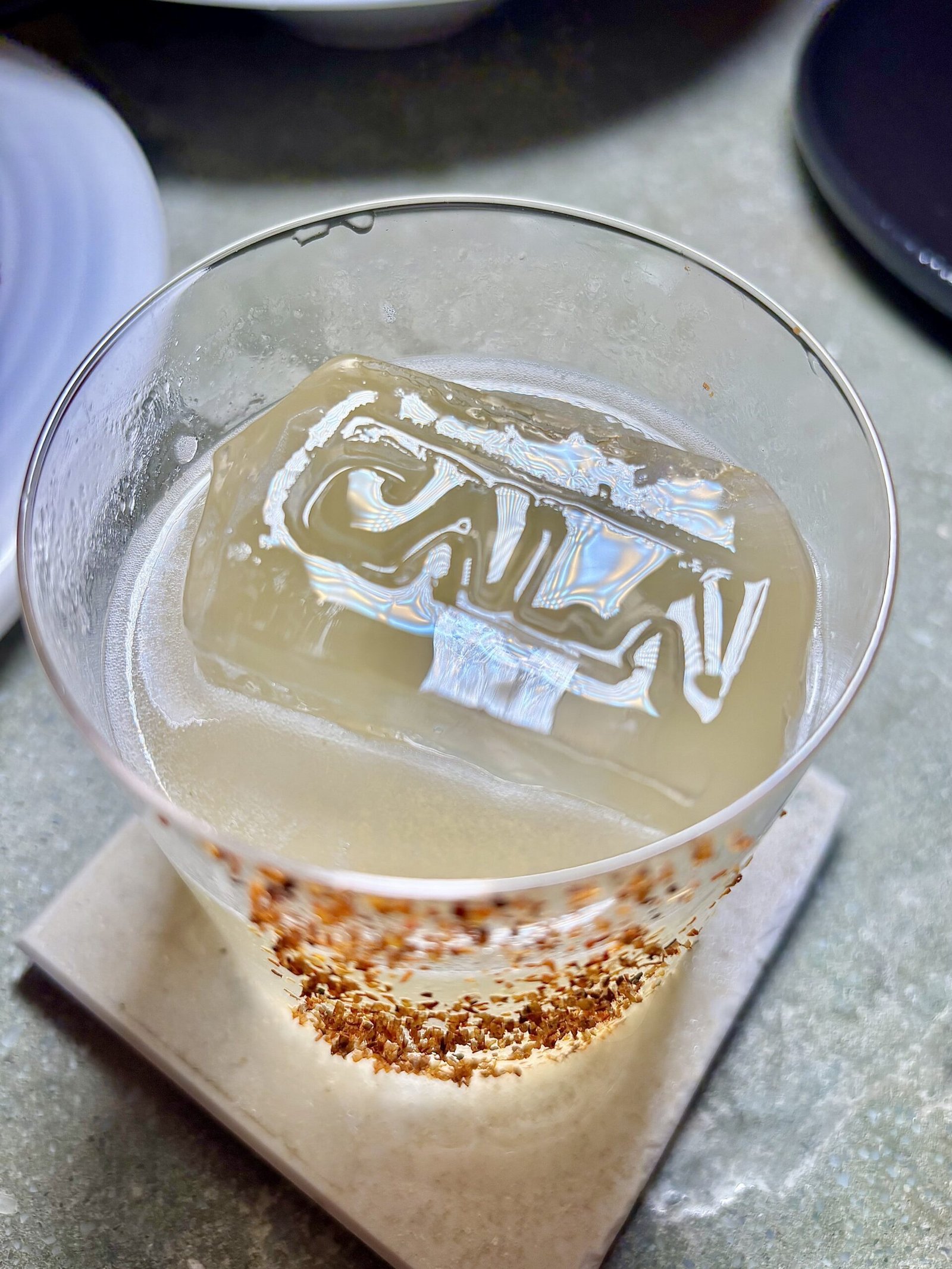 Servido en vaso corto, con un único hielo de gran tamaño grabado con la marca Cala, de alta calidad. El exterior del vaso aparece trabajado con sal especiada que aporta estética y aroma. Es una muy buena reinterpretación de la Margarita clásica de México, más estructurada y compleja, donde el mezcal domina con elegancia.