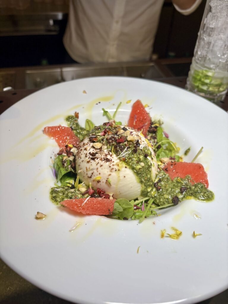 Burrata, pomelo, olivas, tomates confitados y praliné de frutos secos.