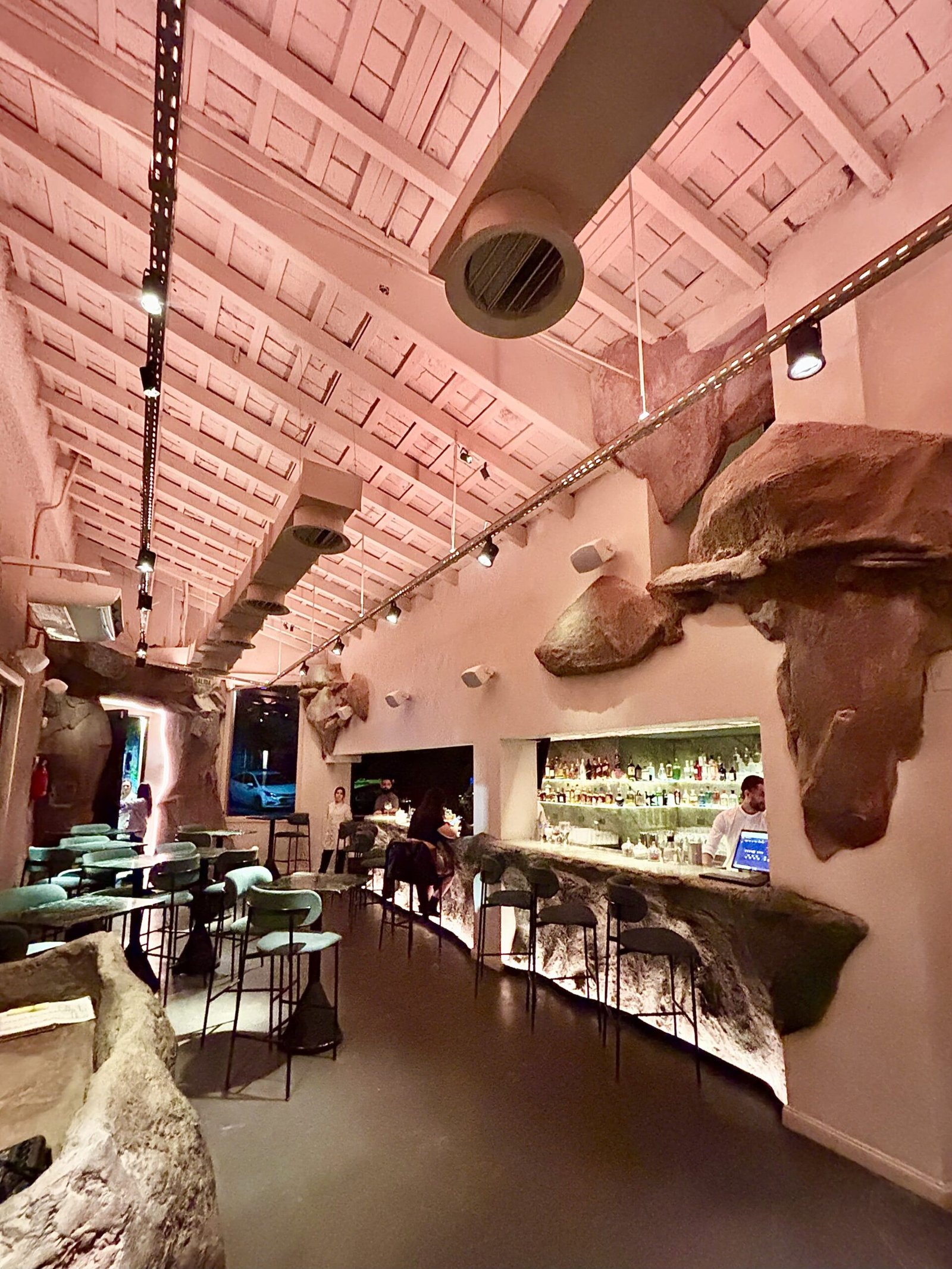 El salón se muestra amplio, en forma de L para más de 80 cubiertos interiores, mesas altas que miran a una barra con techo bajo, donde el cliente percibe justamente la sensación de caverna, probablemente única en la región.