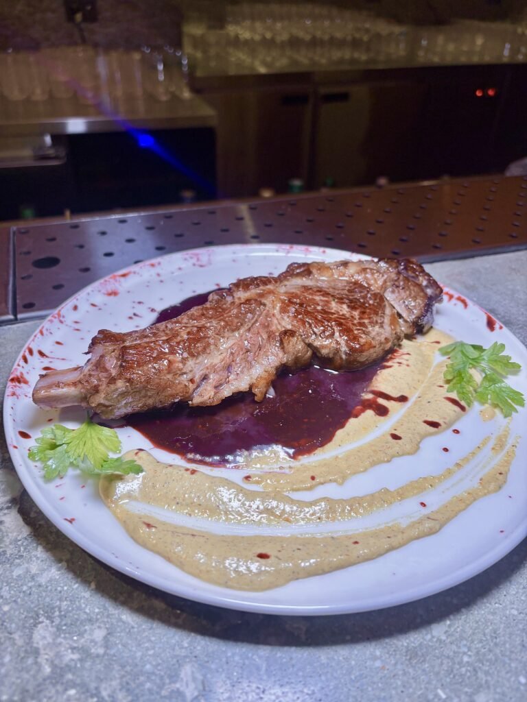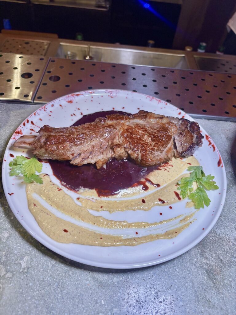 Ojo de bife con hueso, salsa de malbec, hongos salteados y frutos rojos.