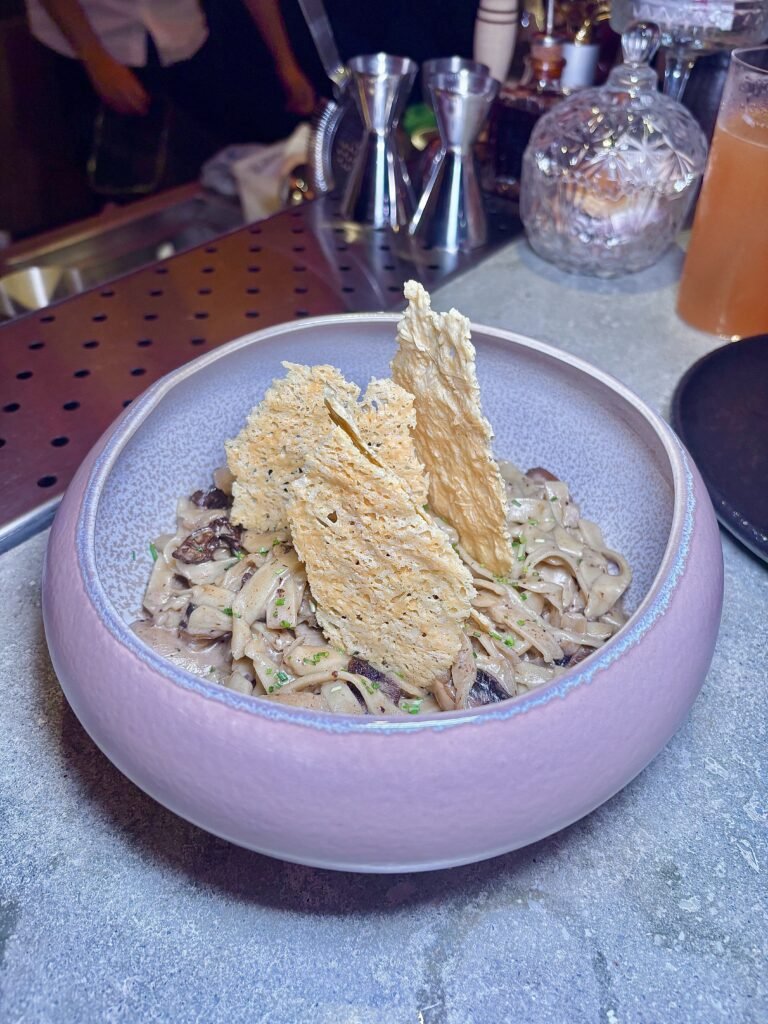 Tagliatelle en crema de hongos, ciboulette y crocante de parmesano.