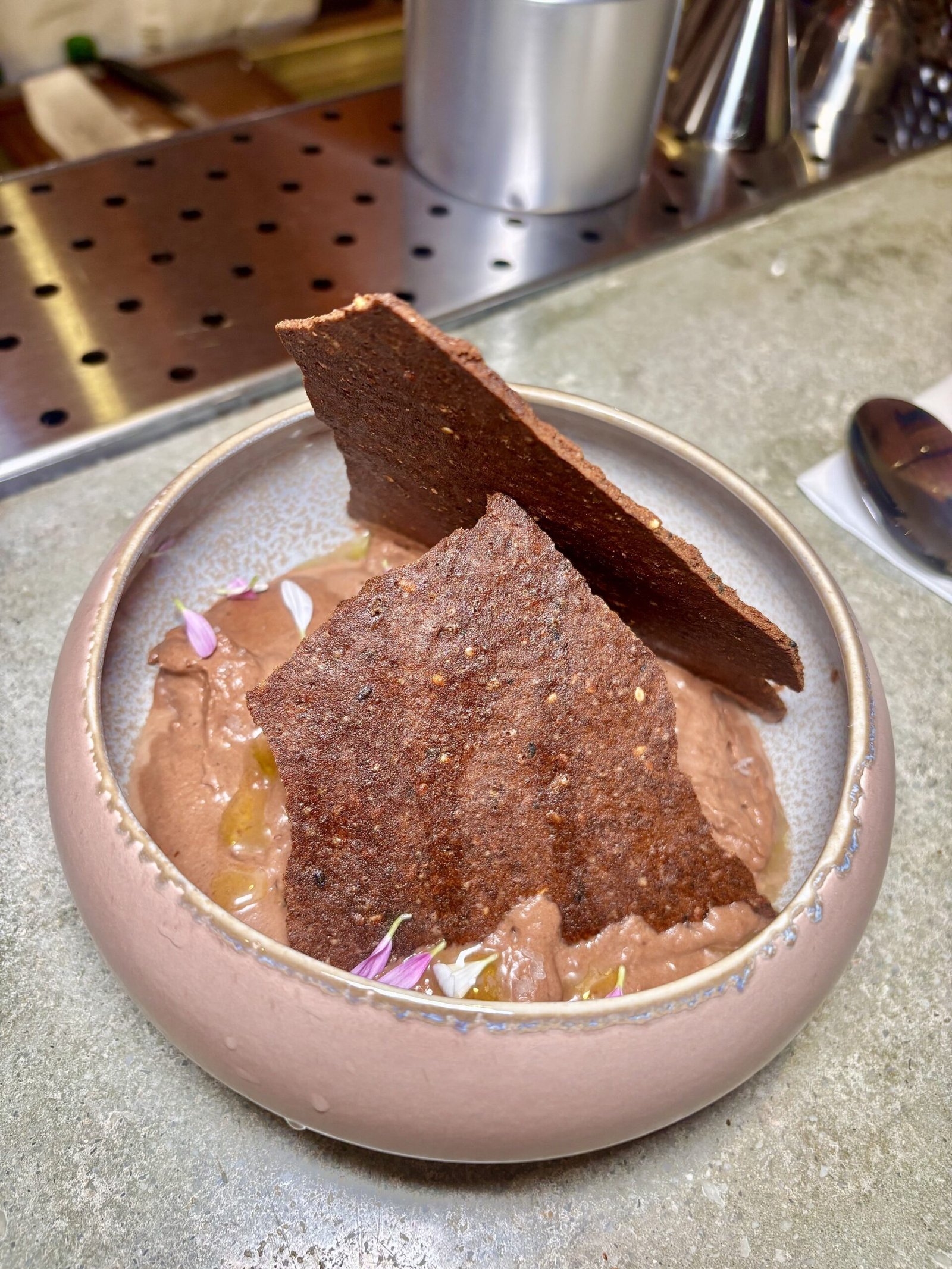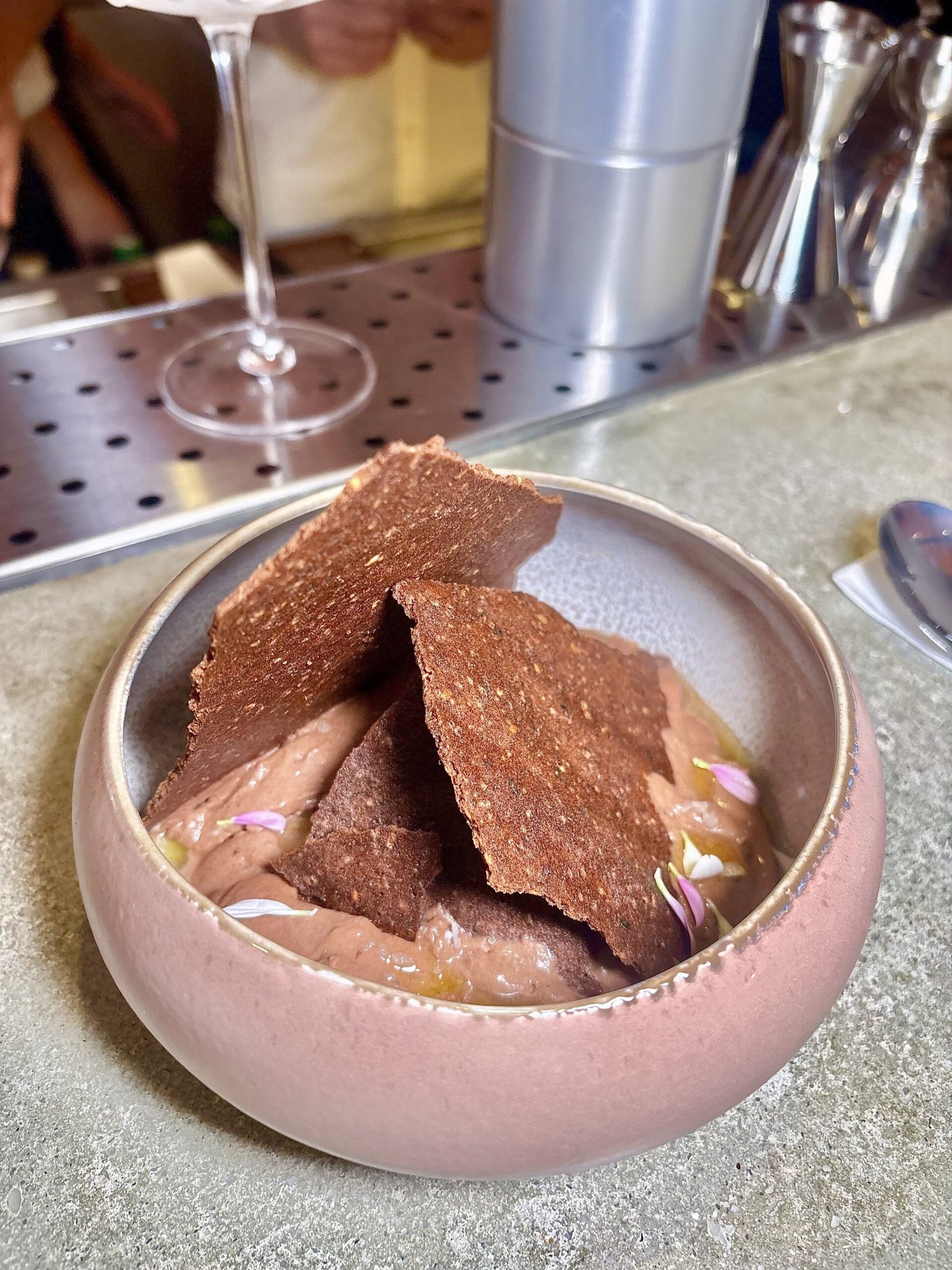Postre en un cuenco, con crocante en lajas grandes, parece más complejo con juego entre dulce, amargo y salado.