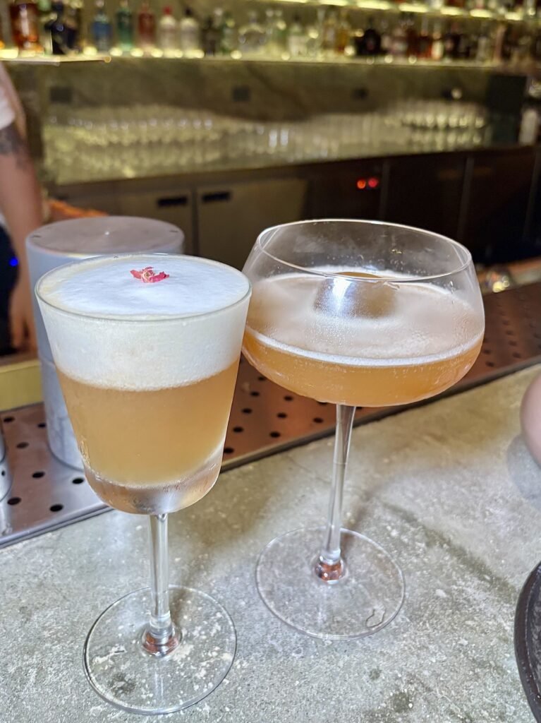 El más estructurado de los 7. La particularidad de ser un mismo coctel con doble versión y presentación, en diferentes copas, se inclina hacia un perfil más profundo y de cierre, con la crema de azahar aportando textura.