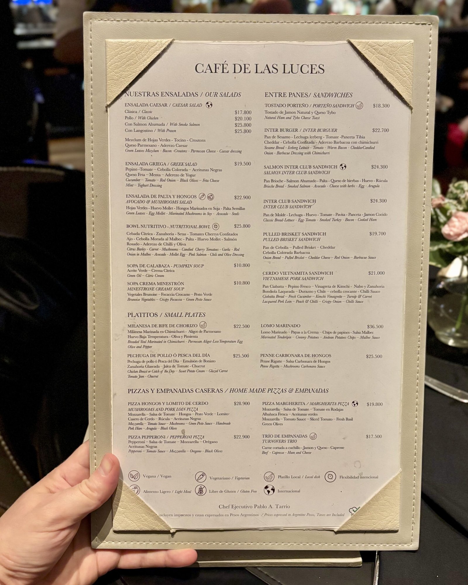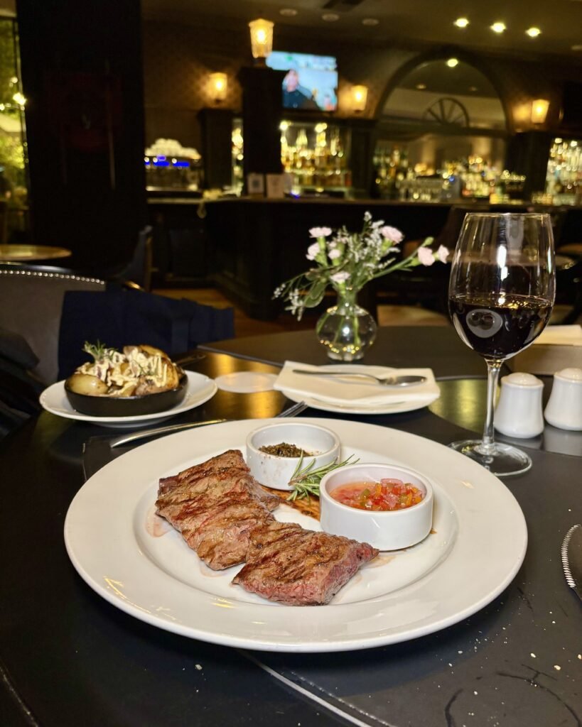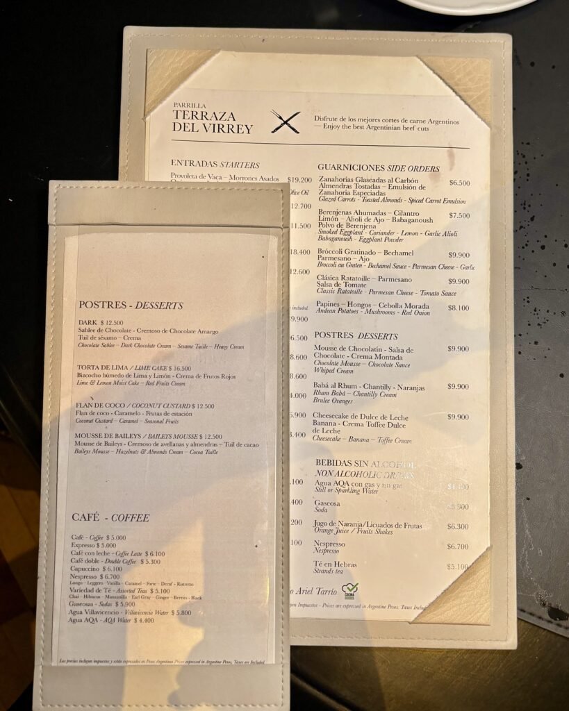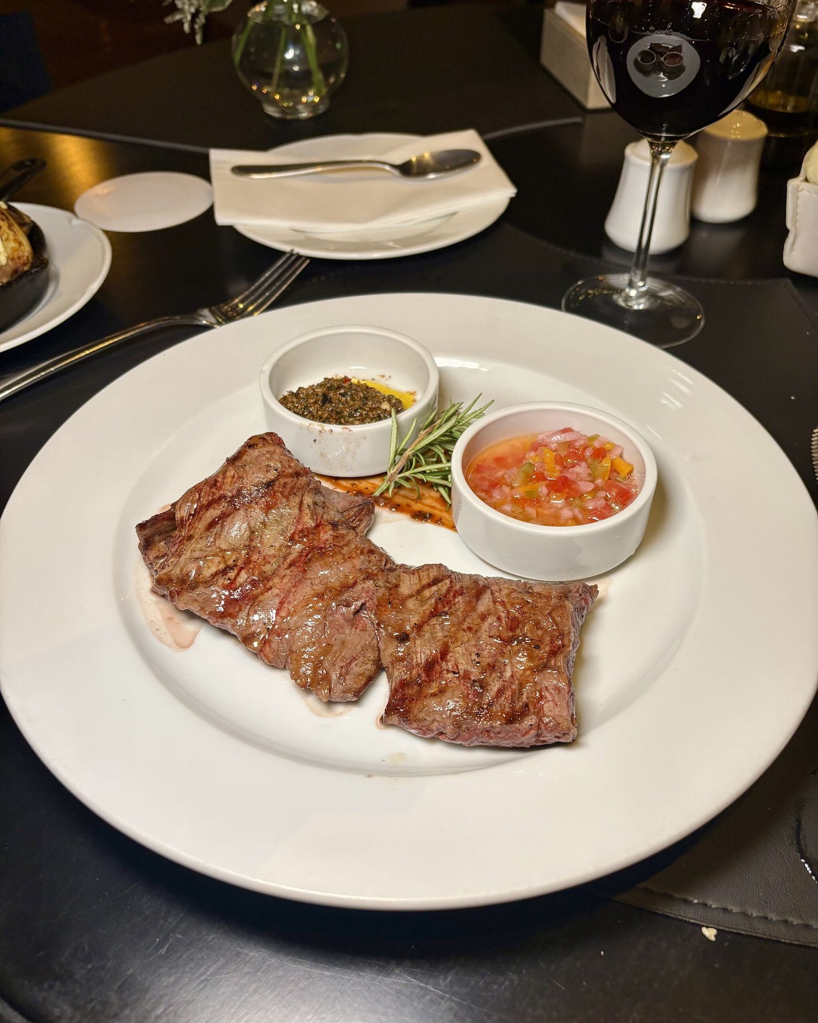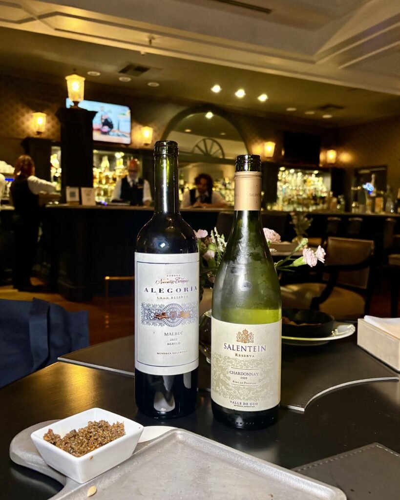 Los principales estuvieron acompañados por dos vinos argentinos de perfil clásico y complementario, bajo sugerencia de la casa por copa: ALEGORÍA GRAN RESERVA MALBEC 2022, de Bodega Navarro Correas, proveniente de Agrelo, Mendoza, con buena estructura, fruta madura y madera bien integrada, y SALENTEIN RESERVA CHARDONNAY 2023, del Valle de Uco, fresco y expresivo, con paso por madera sutil, ideal para equilibrar la grasa de los platos.