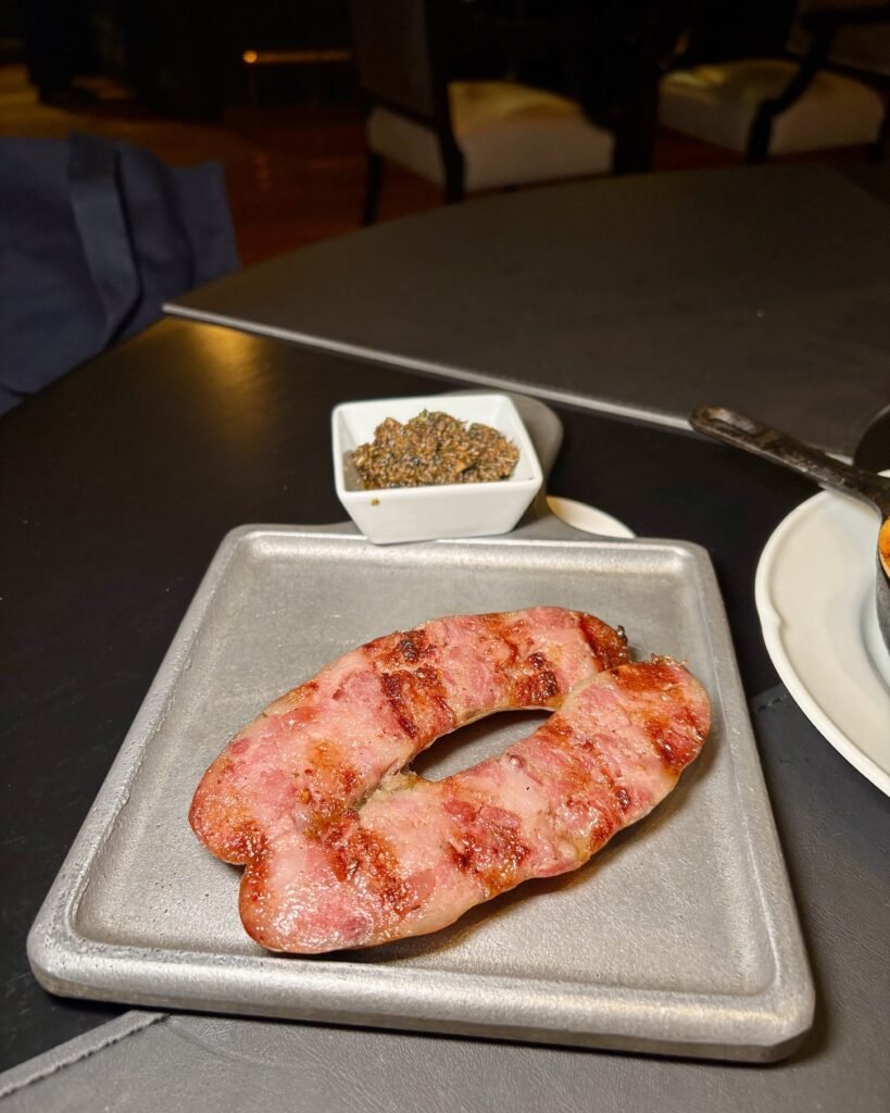 La experiencia en mesa comenzó con dos Entradas de impronta bien parrillera: de las 5 opciones disponibles elegimos el CHORIZO 100% DE CERDO, acompañado por criolla y chimichurri, cortado a lo “banderita” ($arg.12.700);