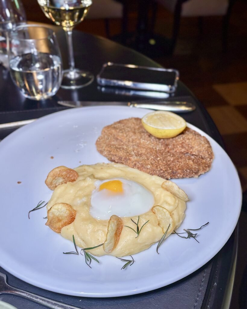 y por otro, la MILANESA DE BIFE DE CHORIZO, marinada en chimichurri, acompañada de aligot de parmesano, huevo a baja temperatura, oliva y pimienta ($22.500), un plato que combina técnica y tradición y se posiciona como uno de los destacados de la nueva carta del Café de las Luces. Punto más alto de la noche.