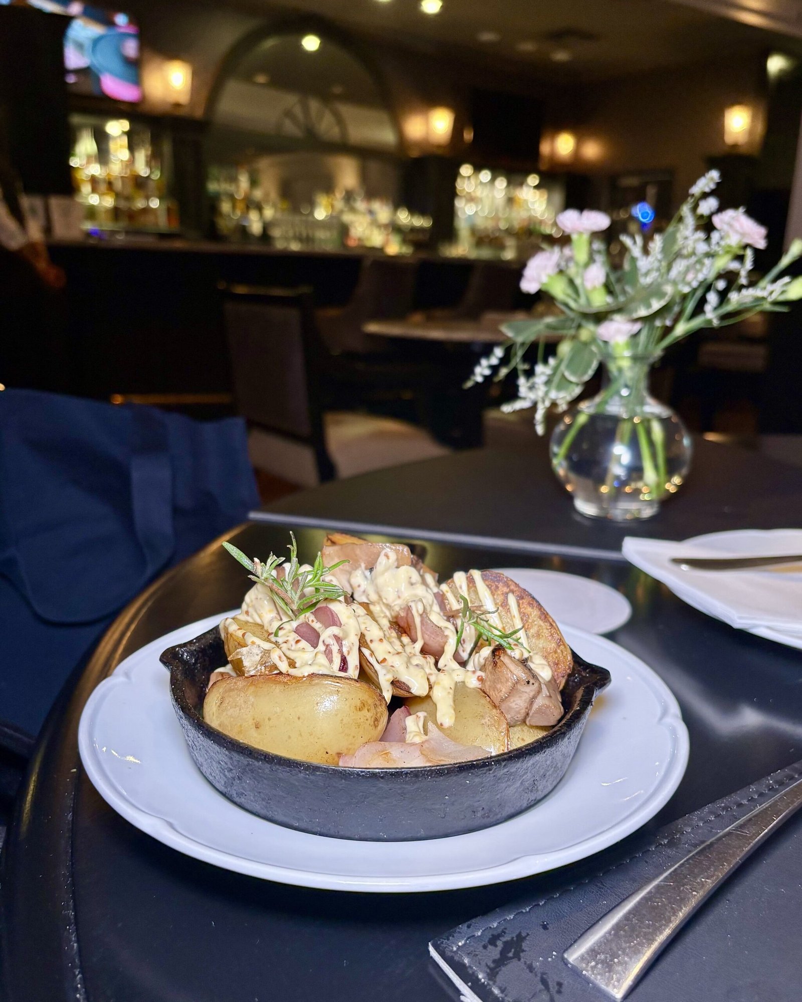 Entre los 9 Platos Principales de la carta, la elección se apoyó en preparaciones representativas: por un lado, la ENTRAÑA DE 250 grs ($34.000), uno de los cortes más buscados de la parrilla argentina, intensa y jugosa, acompañada por una guarnición de PAPINES CON HONGOS Y CEBOLLA MORADA ($8.100);